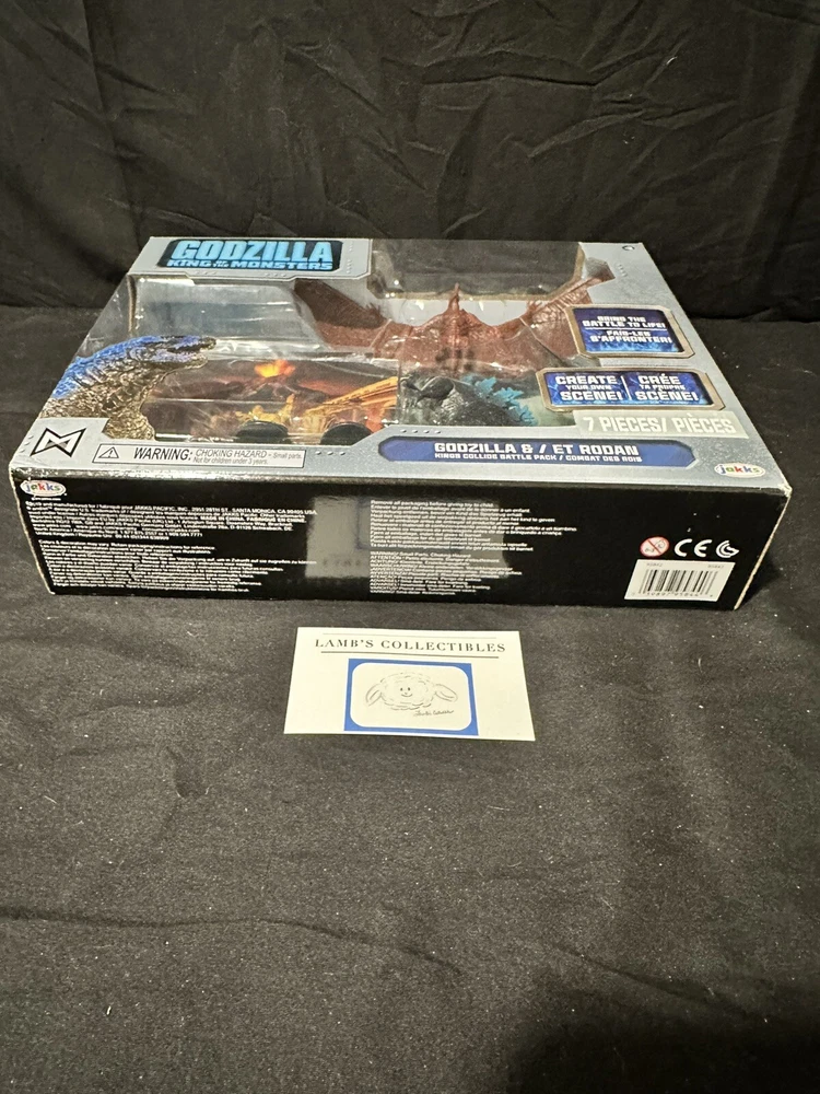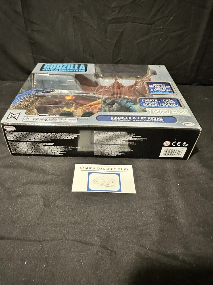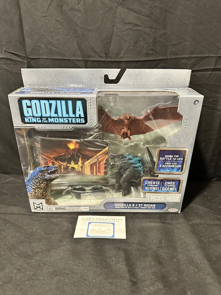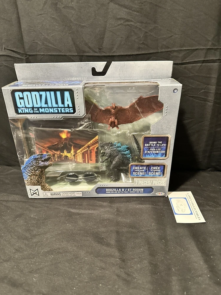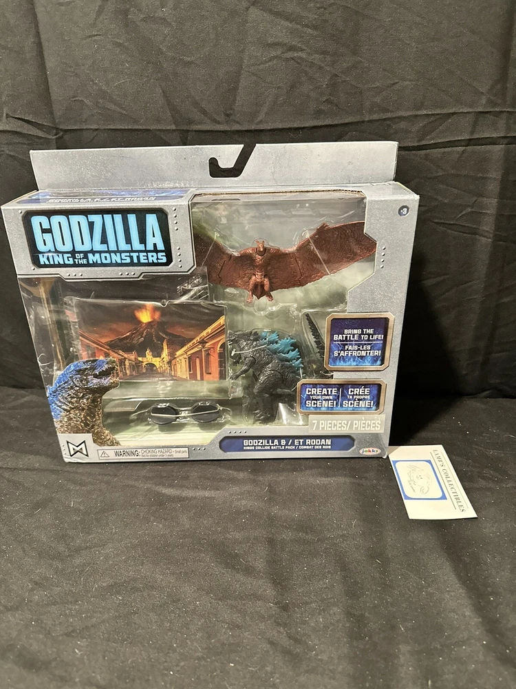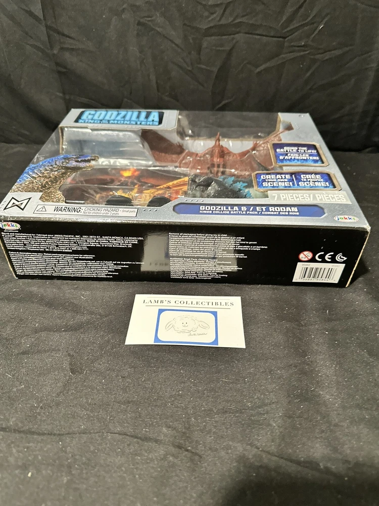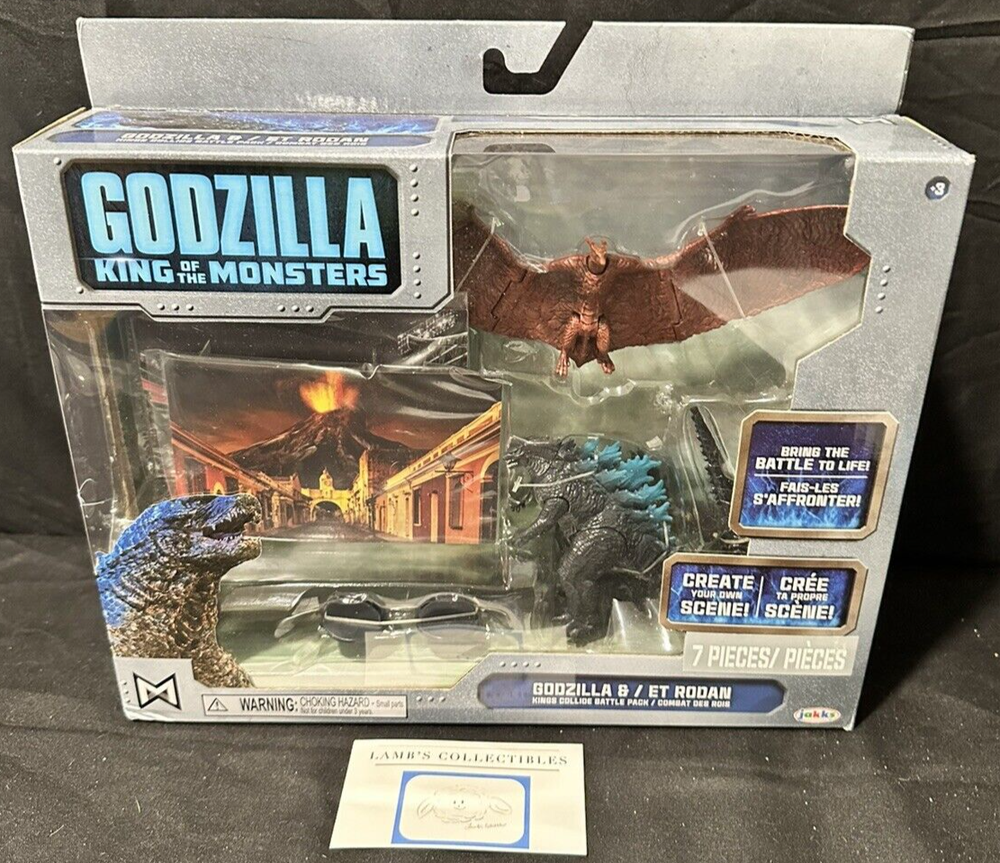 Godzilla King of the Monsters 3" Godzilla 7" Long wings Rodan action figures set Jakks Pacific approx 3.5" tall assembly required there are some creases/dings on the front plastic clam shell and along the edges of the package set includes: Godzilla figure, Rodan figure and two background scenes with stands this item has not been professionally graded Please review all photos, policies & contact us with any questions. Thank You! Lamb’s Collectibles I nternational Buyers Import duties, taxes, & charges are not included in item price or shipping cost & are buyer's responsibility. Customers report packages arrive safely & quickly.