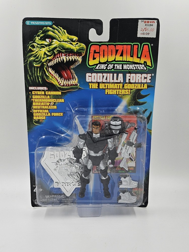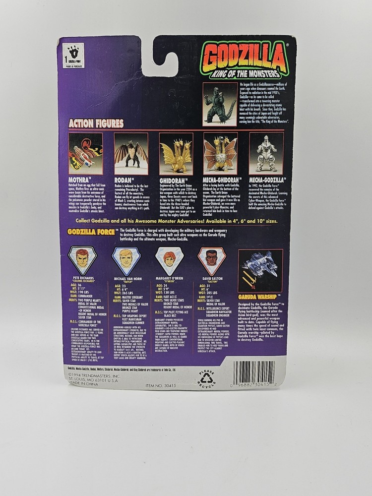 Will come as pictured. Fast shipping. The product is a vintage Godzilla action figure from Trendmasters in 1994, featuring a black suit version of the iconic character. This collectible toy represents a key moment in the Godzilla franchise, capturing the essence of the king of the monsters in a detailed and high-quality design. Perfect for fans of the Godzilla series or collectors of action figures, this item is a must-have for any enthusiast looking to add a piece of nostalgia to their collection.