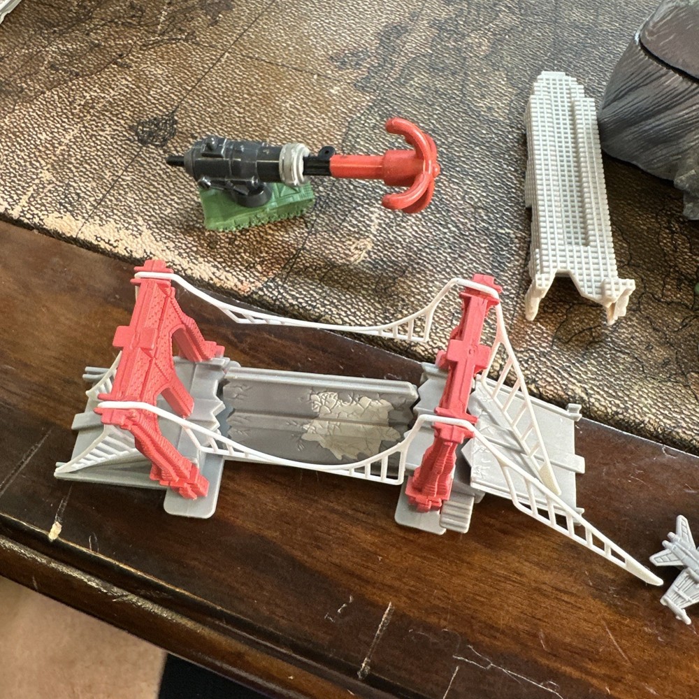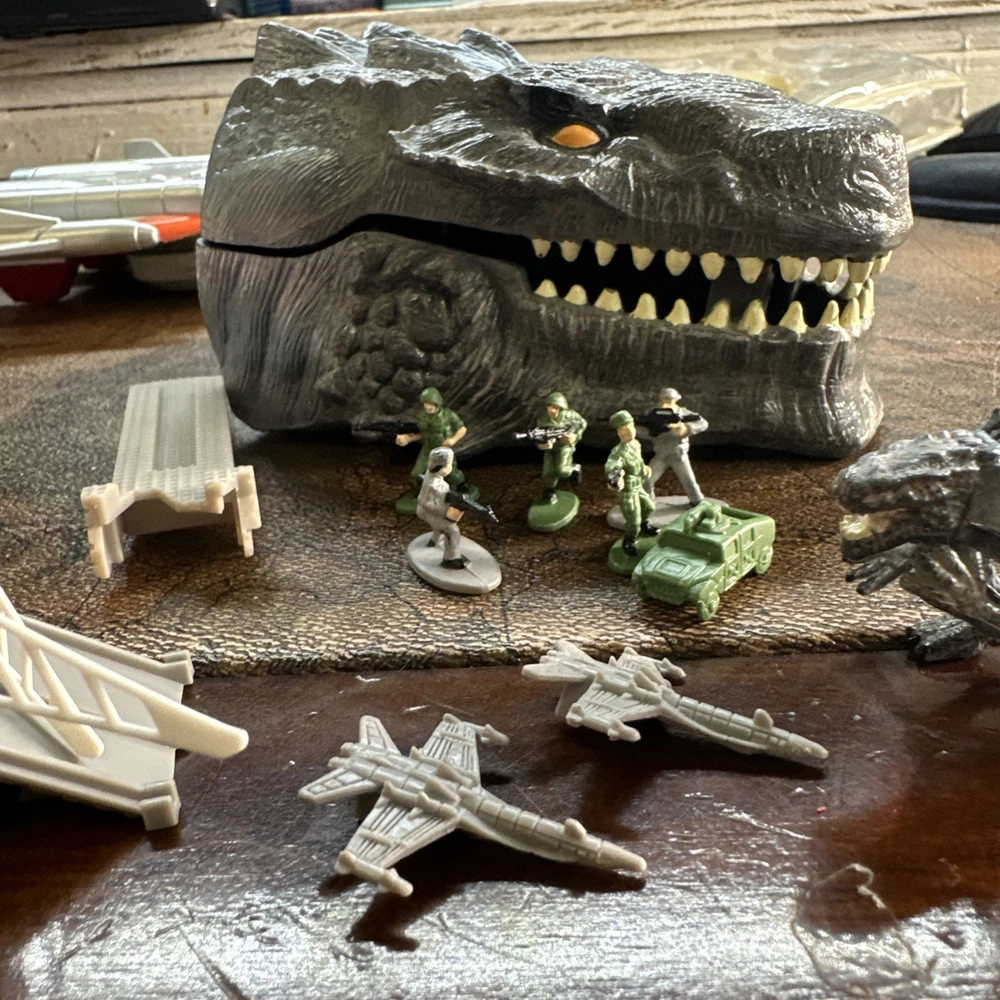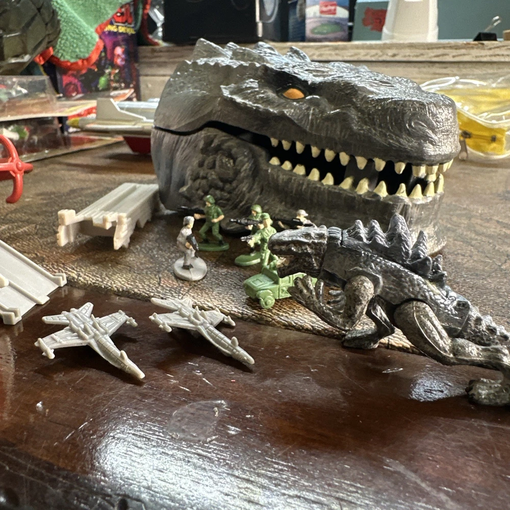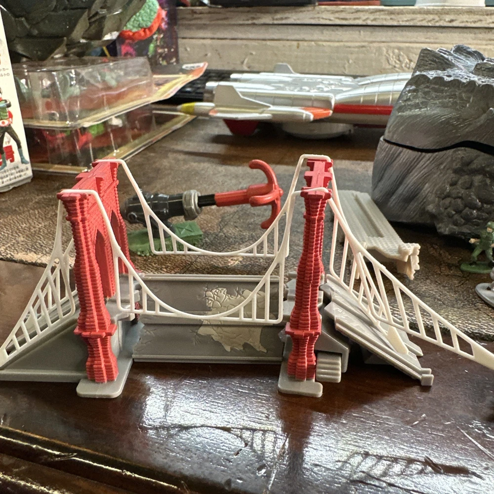 The Godzilla Micro Play set Battle At Brooklyn Bridge from 1998 by Trendmasters is a collectible action figure playset featuring the iconic character Godzilla. Made of plastic and in a micro scale, this set includes various accessories and elements from the Godzilla franchise. With a colorful design and movie theme, this playset is a must-have for fans of the Godzilla series and Toho, the featured artist behind the popular monster. Perfect for nostalgic collectors or as a fun addition to any action figure collection, this near complete set captures the essence of the franchise's beloved villain. The place that is missing one airplane and half of the Empire State building. Other than that. Everything is complete and holds together very well. The Brooklyn Bridge is very thin white plastic. It is complete and unbroken.