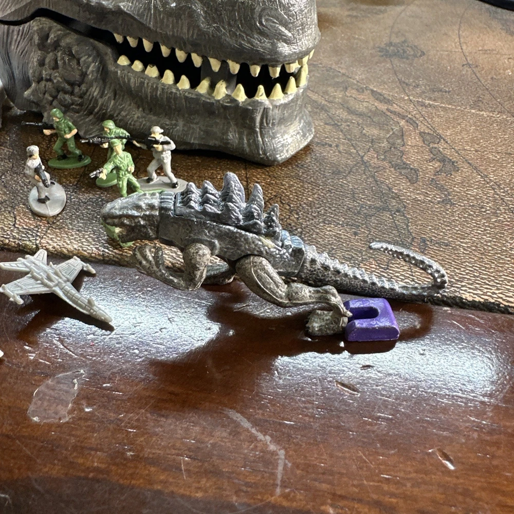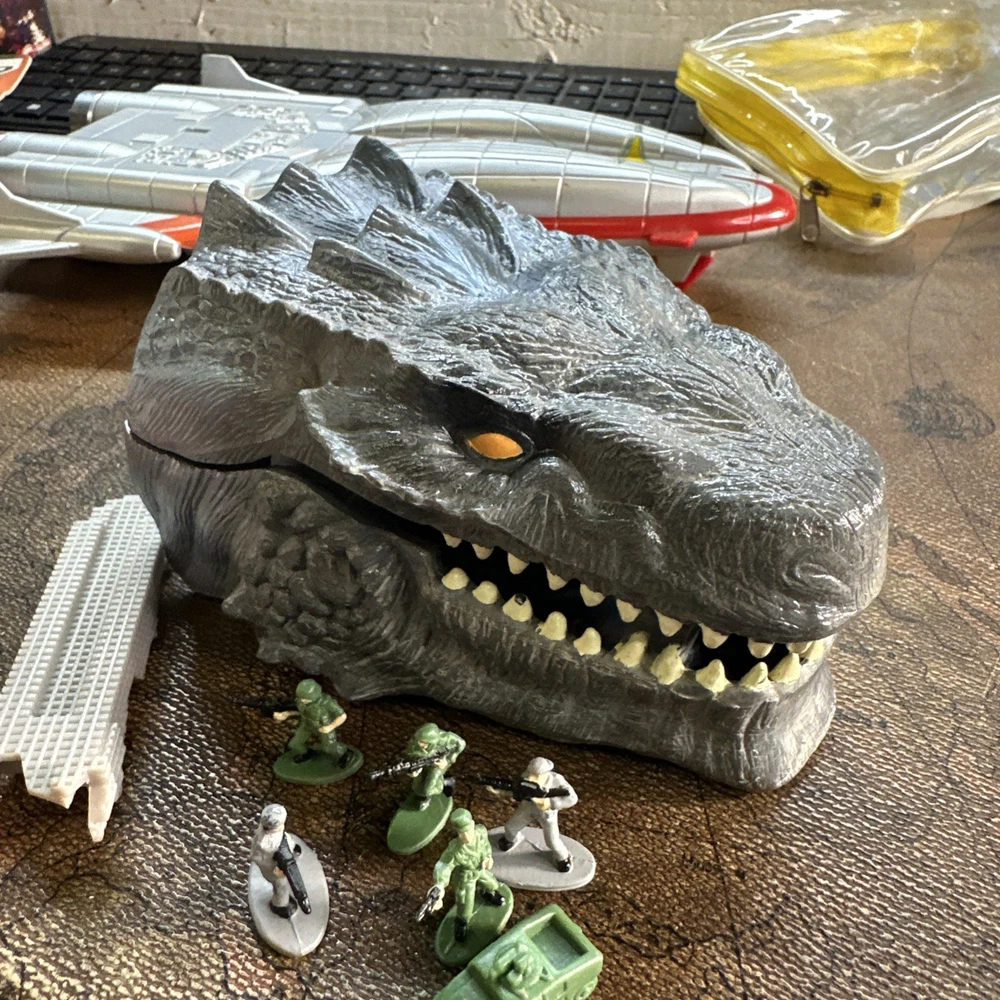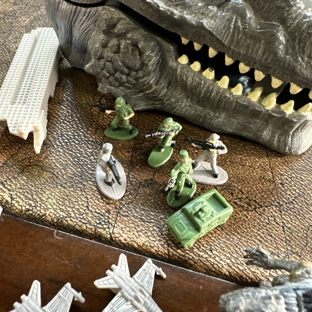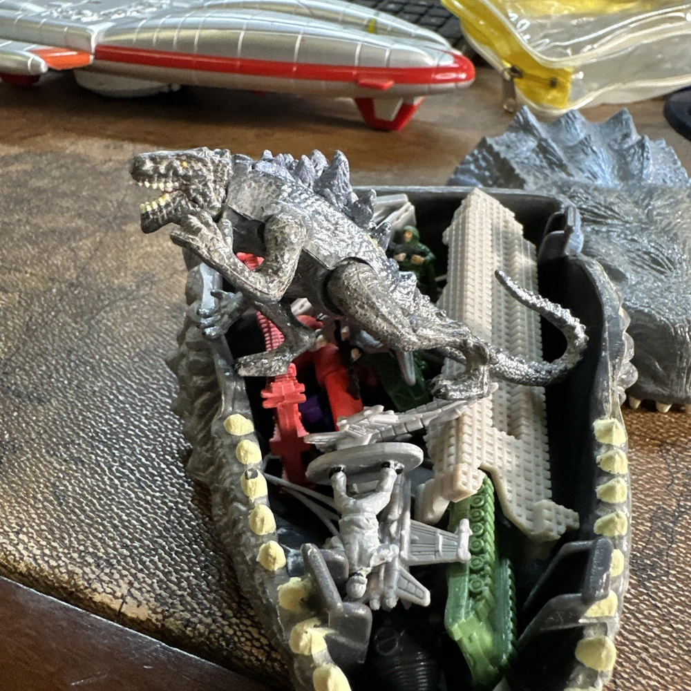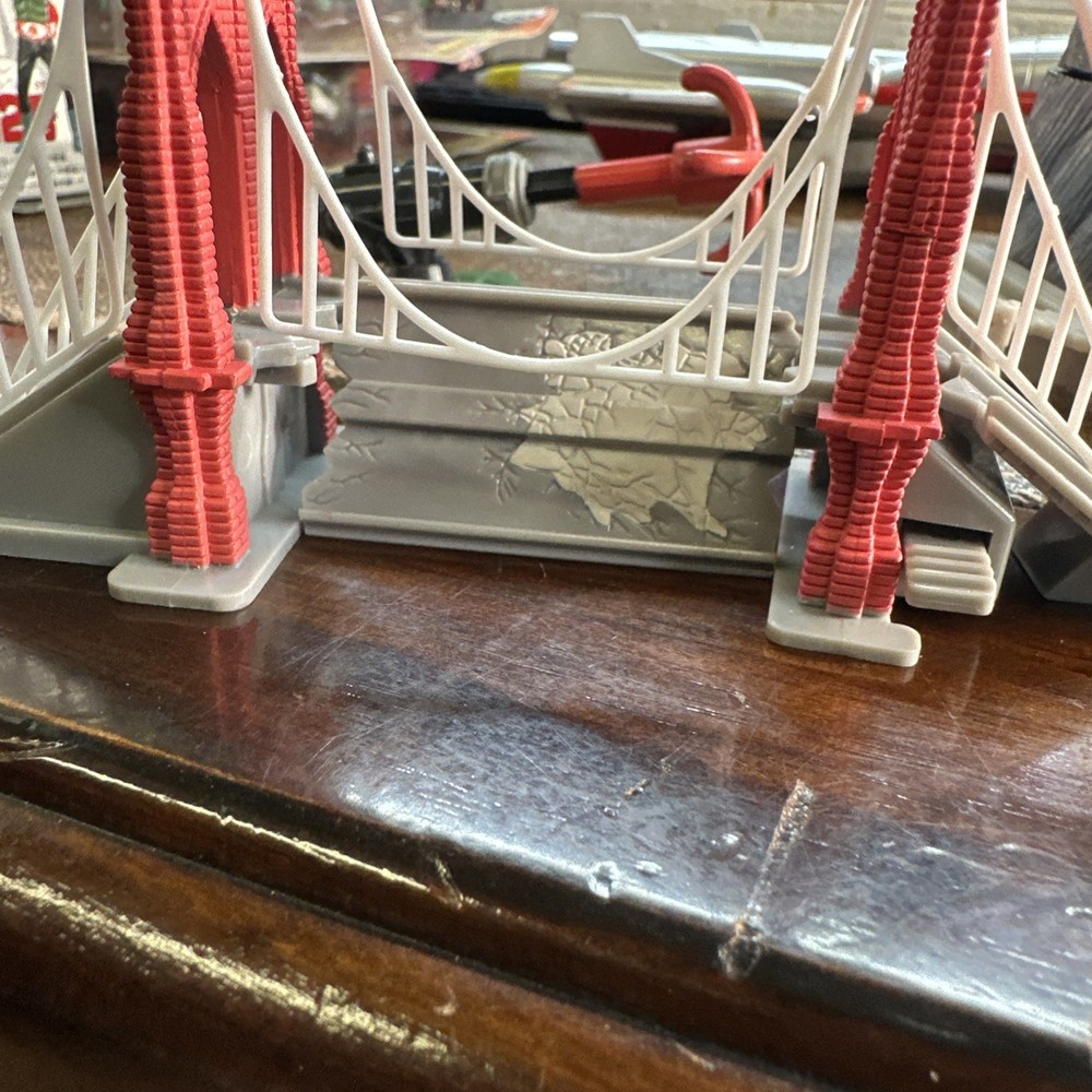 The Godzilla Micro Play set Battle At Brooklyn Bridge from 1998 by Trendmasters is a collectible action figure playset featuring the iconic character Godzilla. Made of plastic and in a micro scale, this set includes various accessories and elements from the Godzilla franchise. With a colorful design and movie theme, this playset is a must-have for fans of the Godzilla series and Toho, the featured artist behind the popular monster. Perfect for nostalgic collectors or as a fun addition to any action figure collection, this near complete set captures the essence of the franchise's beloved villain. The place that is missing one airplane and half of the Empire State building. Other than that. Everything is complete and holds together very well. The Brooklyn Bridge is very thin white plastic. It is complete and unbroken.