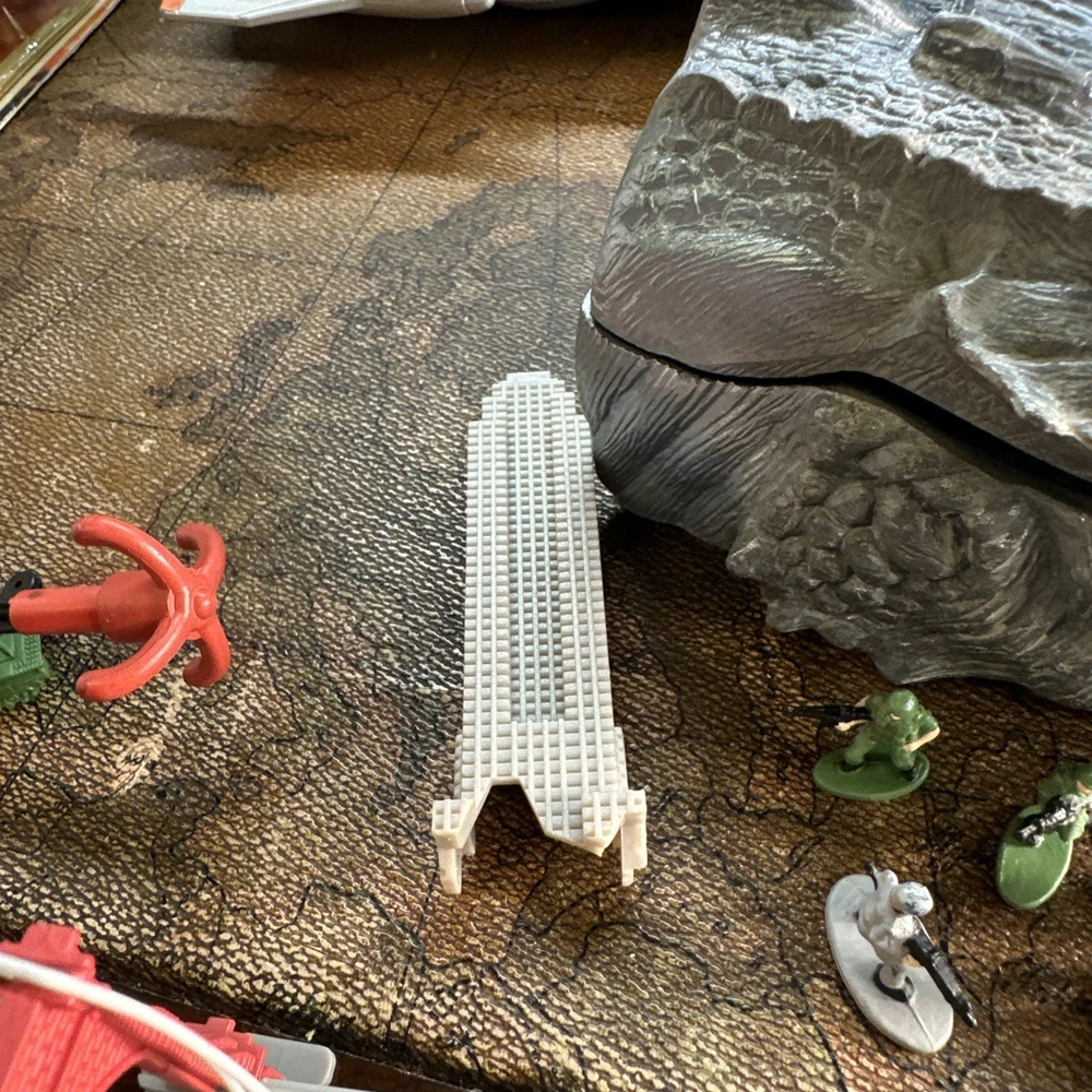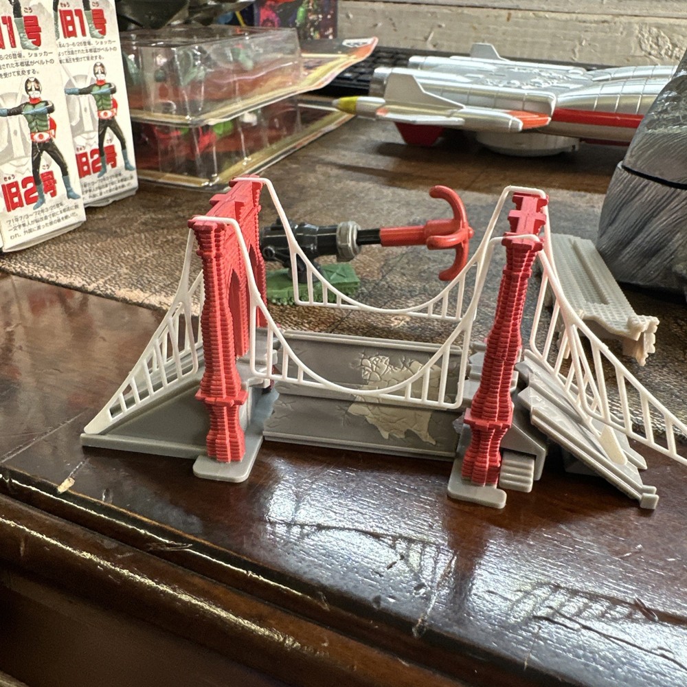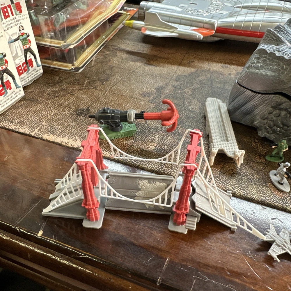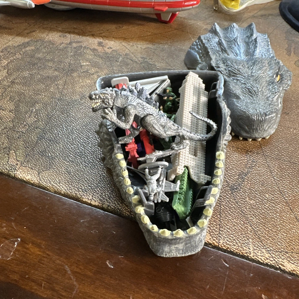 The Godzilla Micro Play set Battle At Brooklyn Bridge from 1998 by Trendmasters is a collectible action figure playset featuring the iconic character Godzilla. Made of plastic and in a micro scale, this set includes various accessories and elements from the Godzilla franchise. With a colorful design and movie theme, this playset is a must-have for fans of the Godzilla series and Toho, the featured artist behind the popular monster. Perfect for nostalgic collectors or as a fun addition to any action figure collection, this near complete set captures the essence of the franchise's beloved villain. The place that is missing one airplane and half of the Empire State building. Other than that. Everything is complete and holds together very well. The Brooklyn Bridge is very thin white plastic. It is complete and unbroken.