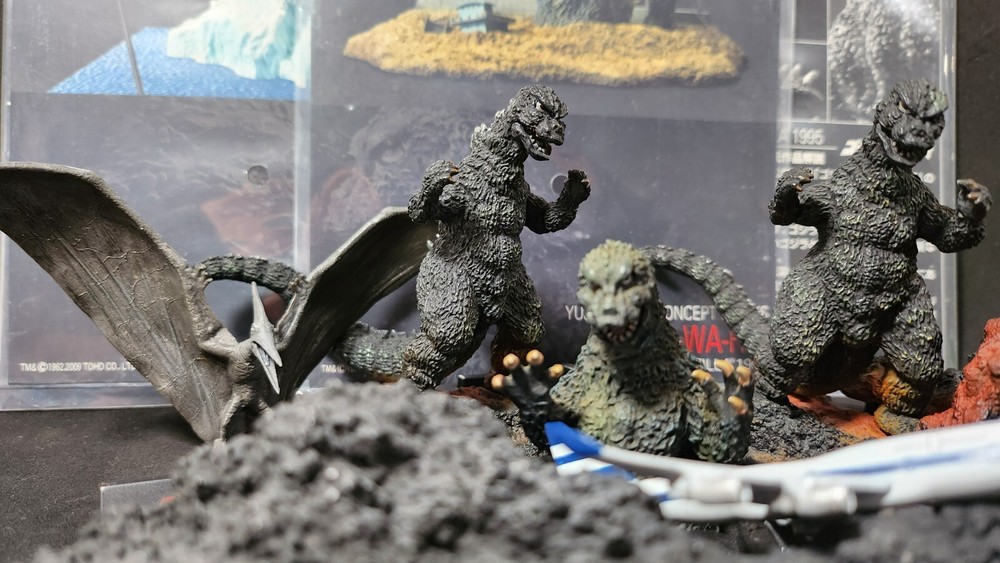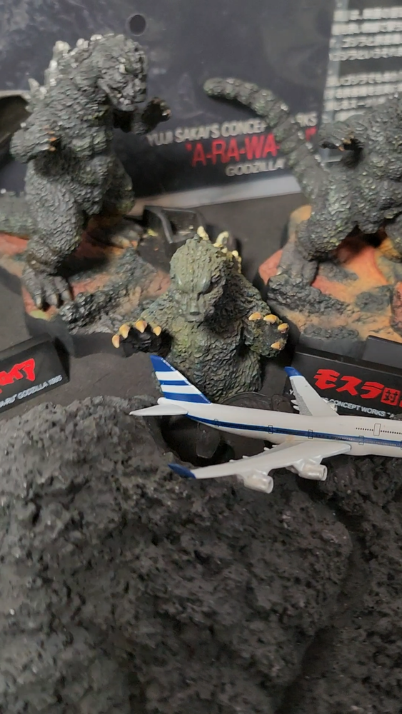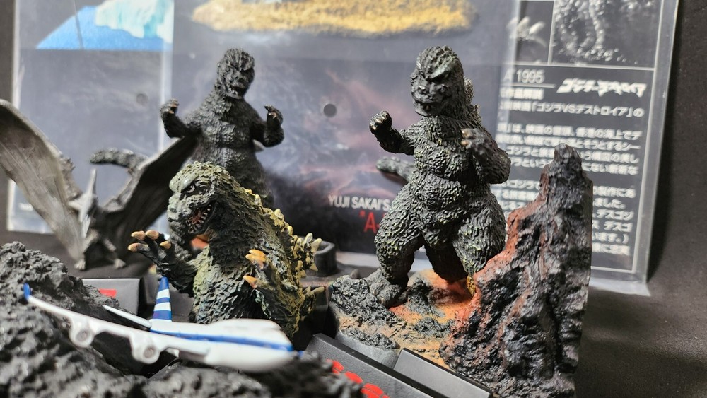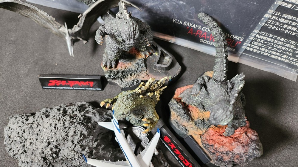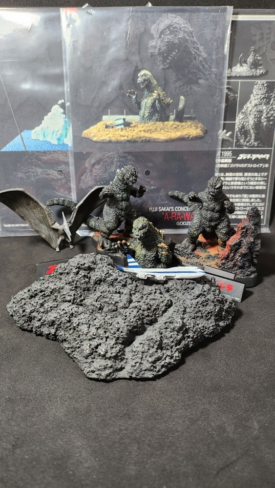 Here's a variety of Godzilla Bandai figures and a King Kong RKO pictures Teradactyl bird. Also, Yuji Sakai Godzilla and x3 pictures These would look perfect in a display case or a cool custom diorama project. These were left over from custom diorama's I created in the past. I didn't have the time to use these listed parts for other diorama projects. Overall, they look in excellent condition. Fast shipping and will be safely packaged! Stored in a clean and smokefree environment! Thank for supporting my business!