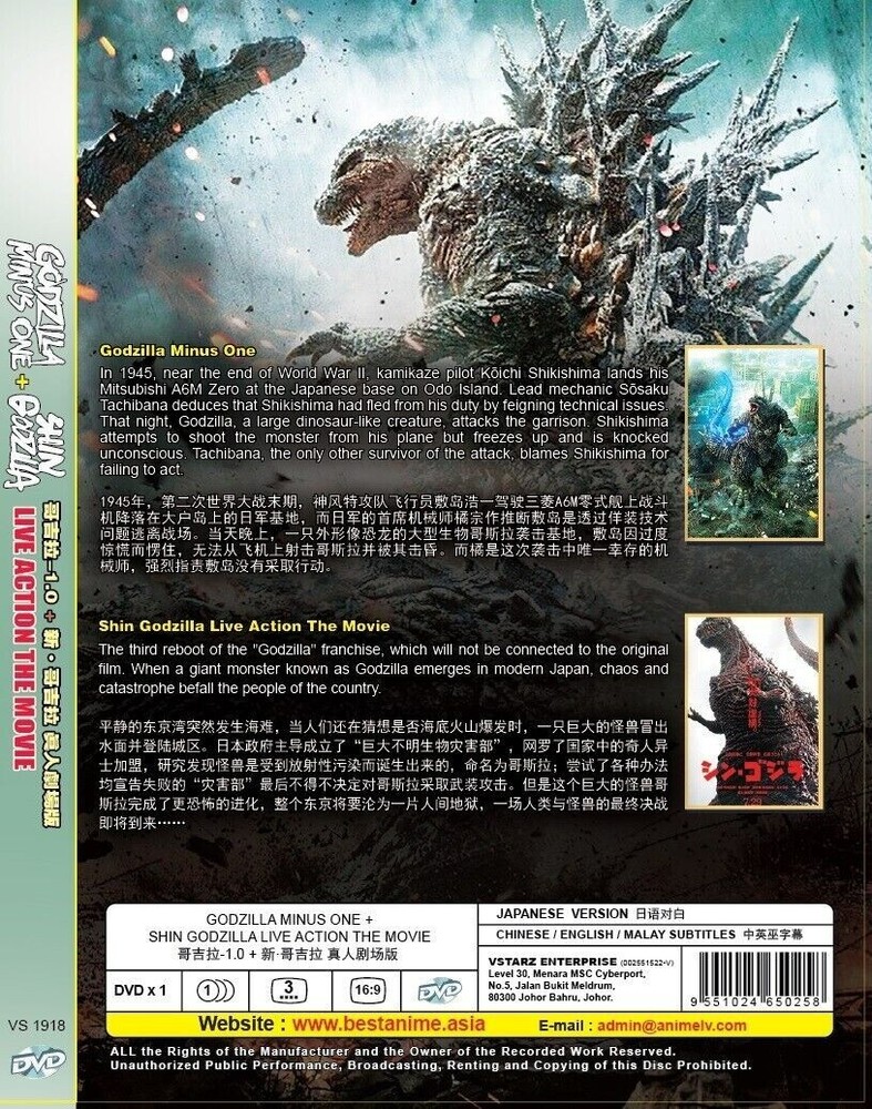 This double-feature DVD is a must-have for Godzilla fans! The picture quality is crisp, and the English subtitles are easy to follow. Both *Godzilla Minus One* and *Shin Godzilla* deliver intense action and deep storytelling. The packaging was secure, and it arrived in perfect condition. Great value for two epic films in one set—highly recommended!