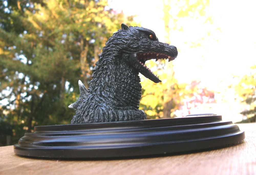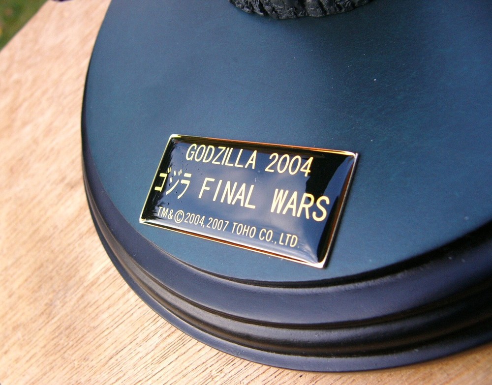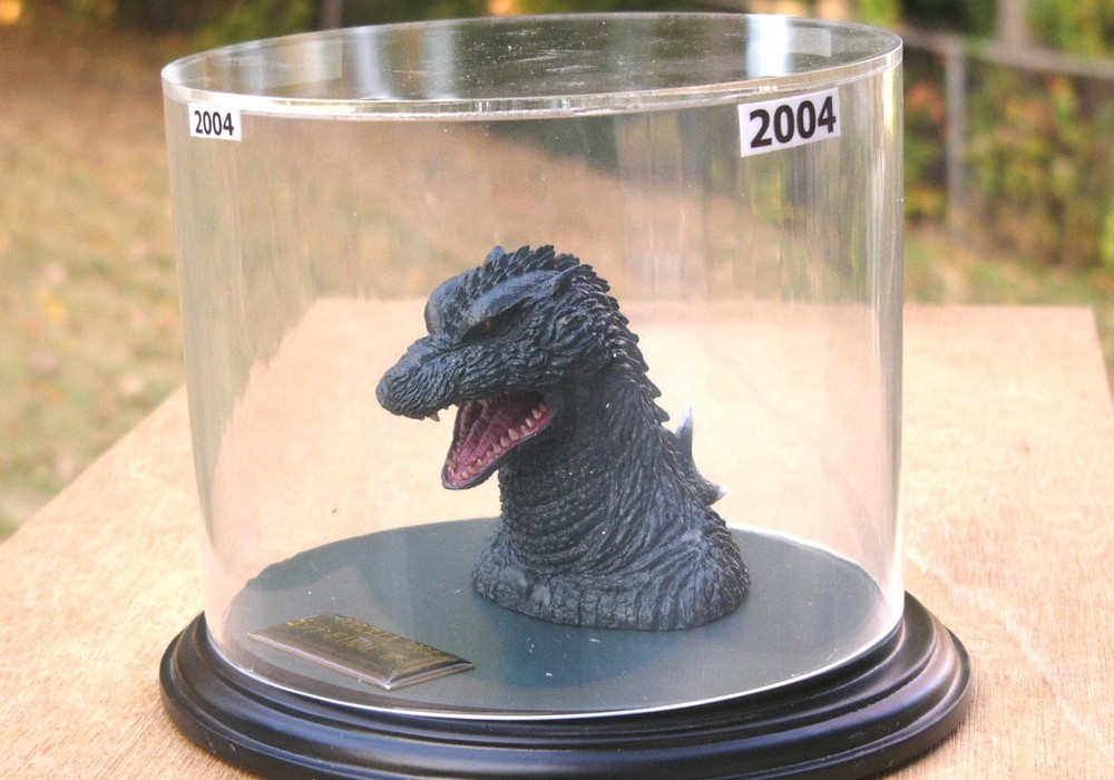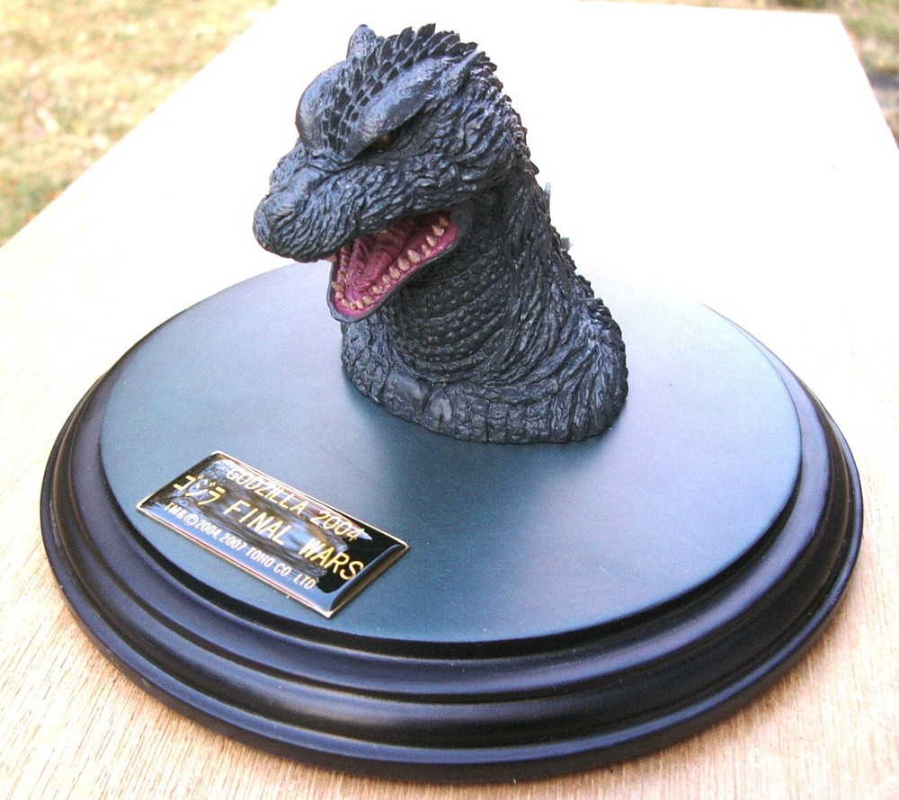 Godzilla Monster Head 2004 Figure Top Quality Movie Final Wars This figure was sculpted, painted and approved by TOHO Studios. Resin type fabrication. The head is attached to a high quality pedestal with Lucite dust cover and date plaque. This is not a toy but a rare collectible. Ships within the USA. Ships within 2 business days.
