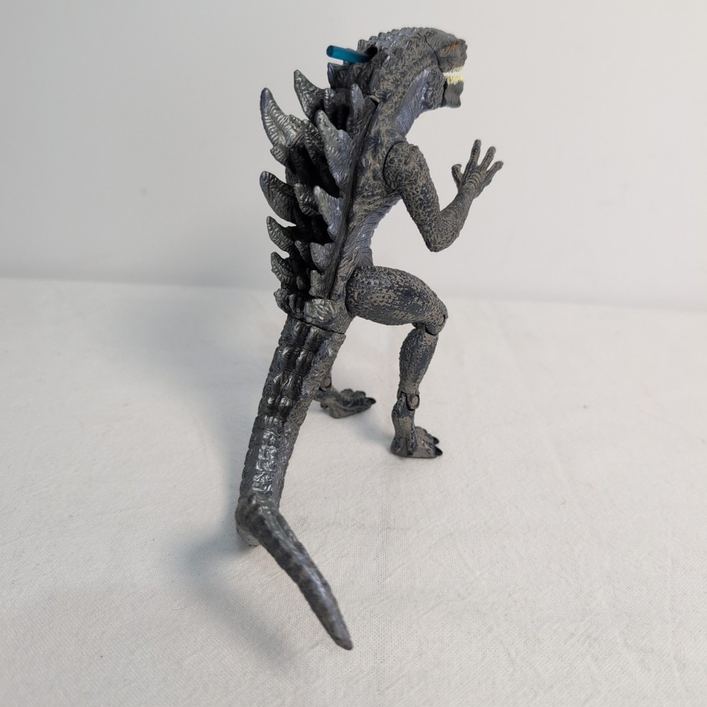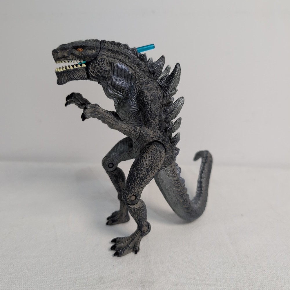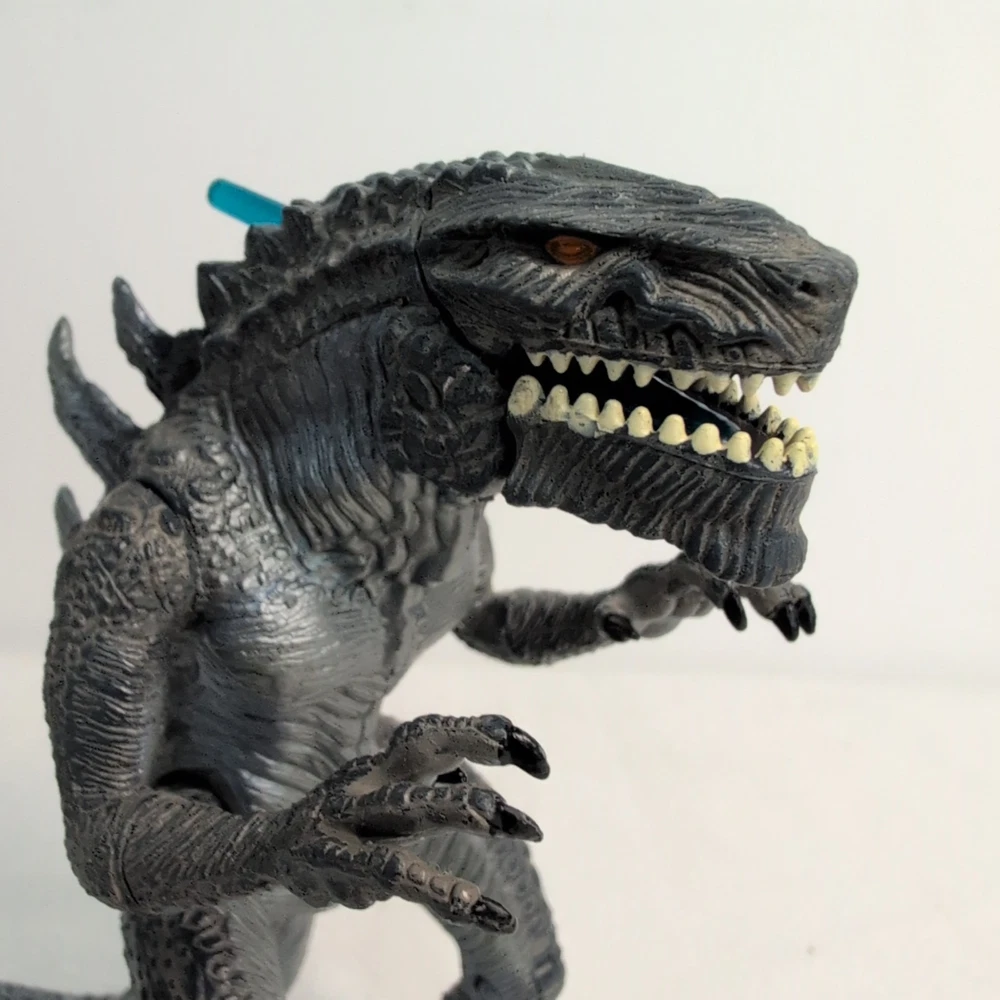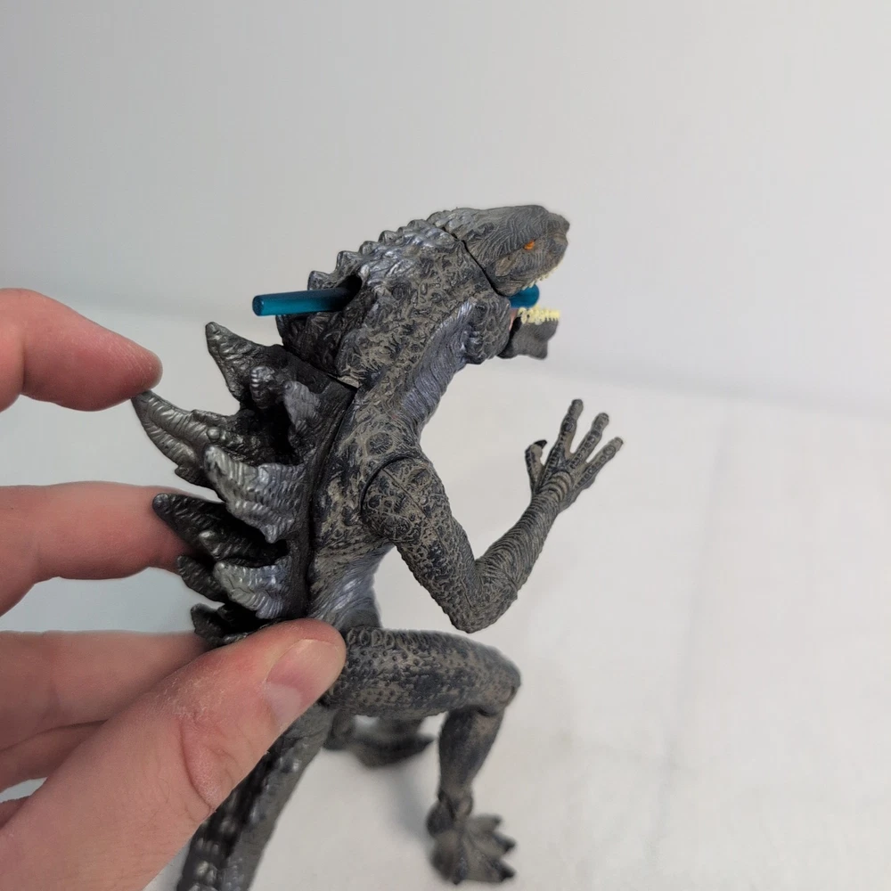 Unleash the king of monsters with the Godzilla Nuclear Strike Action Figure by Trendmasters. This 6-inch figure captures the essence of the iconic Toho film character, detailed to resemble the fearsome creature as seen in the 1998 movie. Complete with a dynamic nuclear missile accessory, this collectible is a must-have for fans of the franchise and action figure collectors alike. Whether you're recreating epic battles or displaying it proudly amongst your collection, this Godzilla action figure stands ready to bring the thrill of the cinematic experience right into your home. With its authentic branding and meticulous design, it embodies the spirit of the legendary beast with impeccable appearance Includes rare blue Missile. Shoots perfect using rear spike. Slightly bent as shown but does not affect performance The pictures form part of the description please review carefully