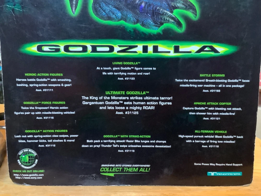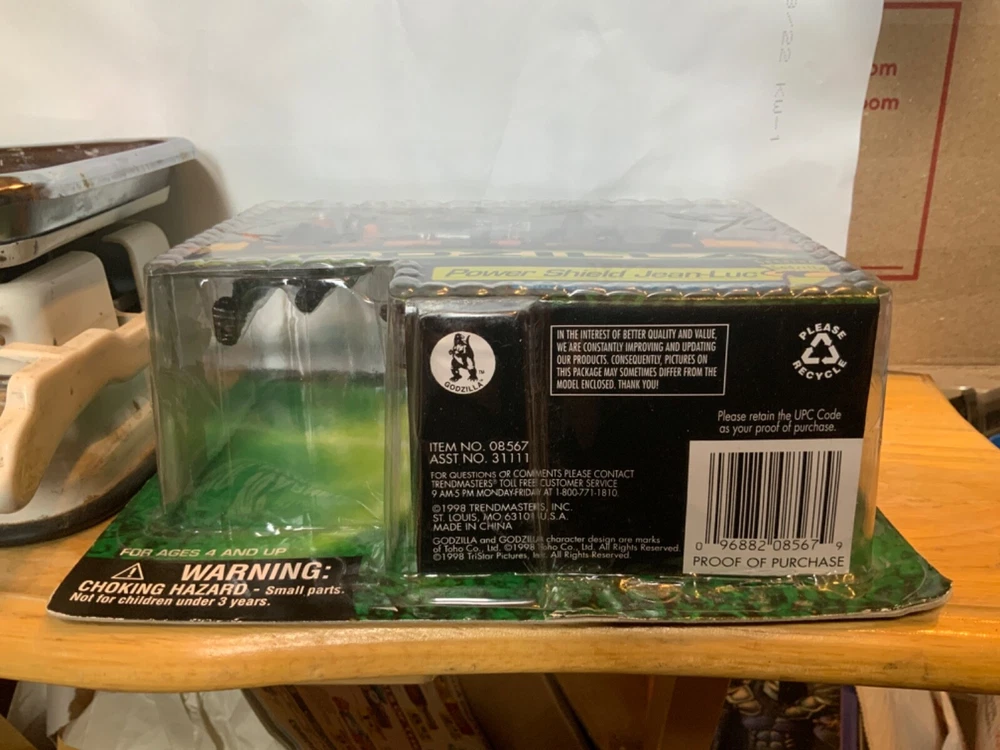 This vintage 1998 Godzilla Power Shield Jean-Luc action figure by Trendmasters is a must-have for any fan of the iconic monster. With its detailed design and sealed packaging, this toy is a rare find that will make a great addition to your collection. The figure is recommended for ages 4 and up and was made in China. The Godzilla Power Shield Jean-Luc action figure is perfect for fans of the monster and collectors alike. Its detailed design and sealed packaging make it a rare find that is sure to impress. Don't miss your chance to add this vintage toy to your collection today. The card is not perfect (corners show wear) so make sure to look at all of the pictures. I bubble shows some signs of shelf-wear but is attached to the card. Please look at all of the pictures carefully as they are part of the description. The item pictured is the actual item that you will receive. I have described this item to the best of my knowledge. However I am not an expert in any way. If you have any questions or would like to see additional pictures please ask before placing your bid.