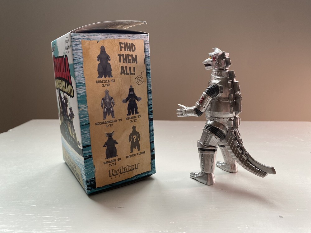 This is a BRAND NEW and RARE Godzilla ReAction Monster Island Series Blind Box released by Super7, the box is included and has been opened to identify the figure inside. This box includes Mechagodzilla, from the 1974 film Godzilla vs Mechagodzilla, in an alternate silver colorway with lighter gray joint detailing as opposed to the darker grey-black joints and different silver tone of the Space Titanium release.