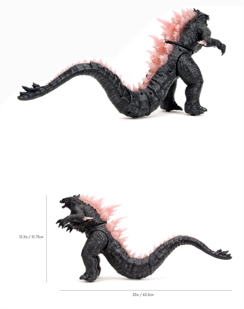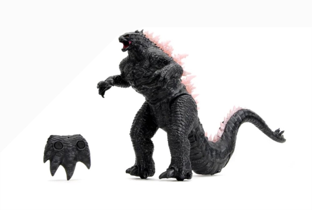 Godzilla X Kong Heat ray breath godzilla R/C toy - Jada Toys has harnessed the power of electronic fog and LED lumens for its new Godzilla x Kong: Heat-Ray Breath Godzilla R/C figure. As seen in Legendary’s latest trailer for Godzilla x Kong: The New Empire, the latest Monsterverse version of Godzilla sports a signature magenta-y dorsal fins and corresponding heat ray, which comes to light-up life on the new R/C figure. R/C figure stands 12.5” tall and is 25” long from head to tail. Using its claw-stylized controller, fans can make the figure stomp, whip its tail, roar a sonic "SKREEONK!", and of course emit its simulated heat ray blast. And, it must be said, 4AA and 2AAA batteries *are* included.
