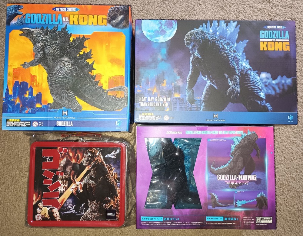You are bidding on a Godzilla 1954 tin lunchbox and thermos Toho Monster Diamond exclusive new unused 3 Godzilla figures: 1. Hiya Godzilla vs Kong Godzilla Previews Exclusive figure 2. Hiya Godzilla vs Kong Heat Ray translucent Godzilla figure 3. SH Monsterarts Godzilla vs Kong Godzilla figure - figure are new in box Please contact before bidding if your Feedback is less than 10. Please ask all questions ahead of time. Please note due to highly collectible nature of this item, returns are not accepted. No International Buyers