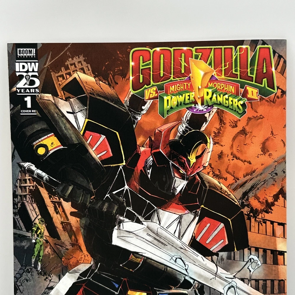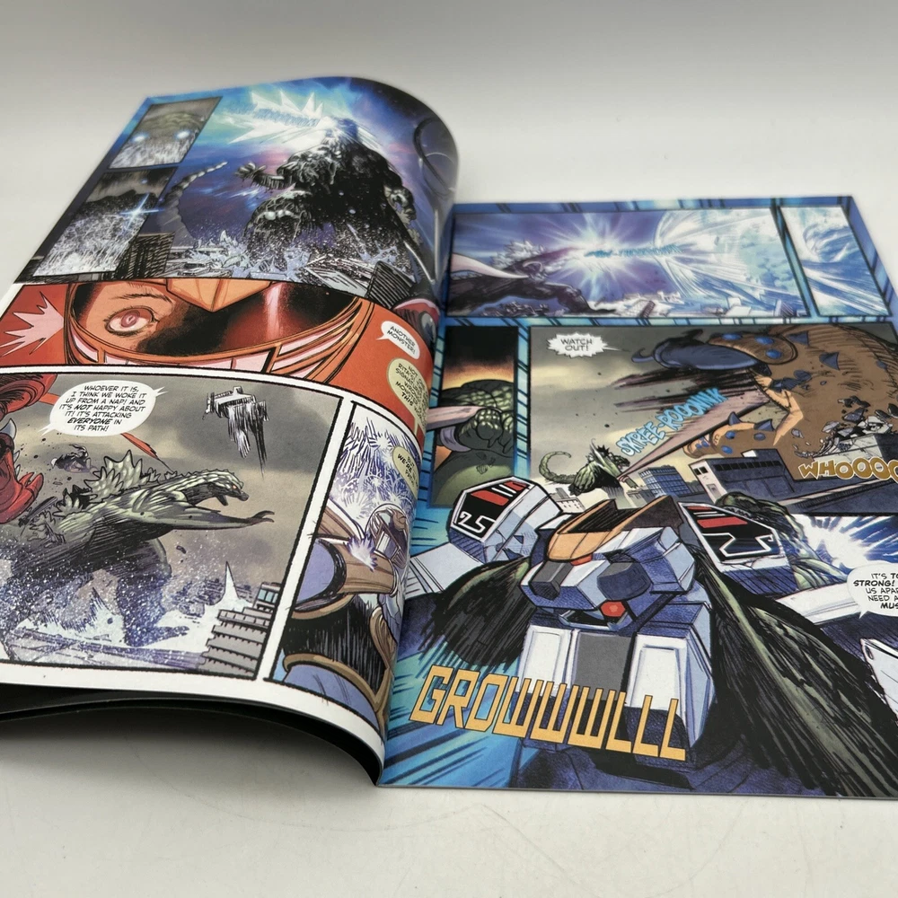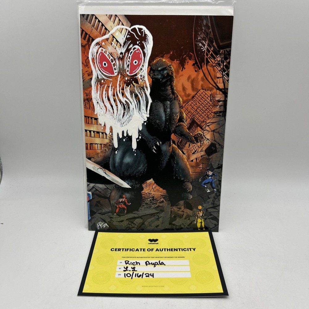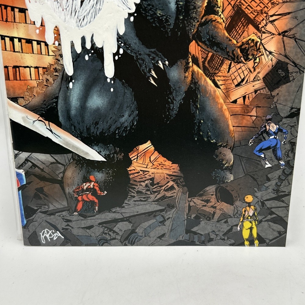 The product is a 2024 comic book titled "Godzilla VS Mighty Morphin Power Rangers #1 VIRGIN(RICH AYALA Remark Alien COA). It is a Virgin Variant featuring artwork by Rich Ayala with a Certificate of Authenticity (COA). The comic book includes characters such as Godzilla, and Power Rangers in a superhero team, set in the US Comics tradition. It is part of the series "Godzilla Vs. Mighty Morphin Power Rangers 11" and falls under genres like superheroes, action, and science fiction. Bin-9 E and P
