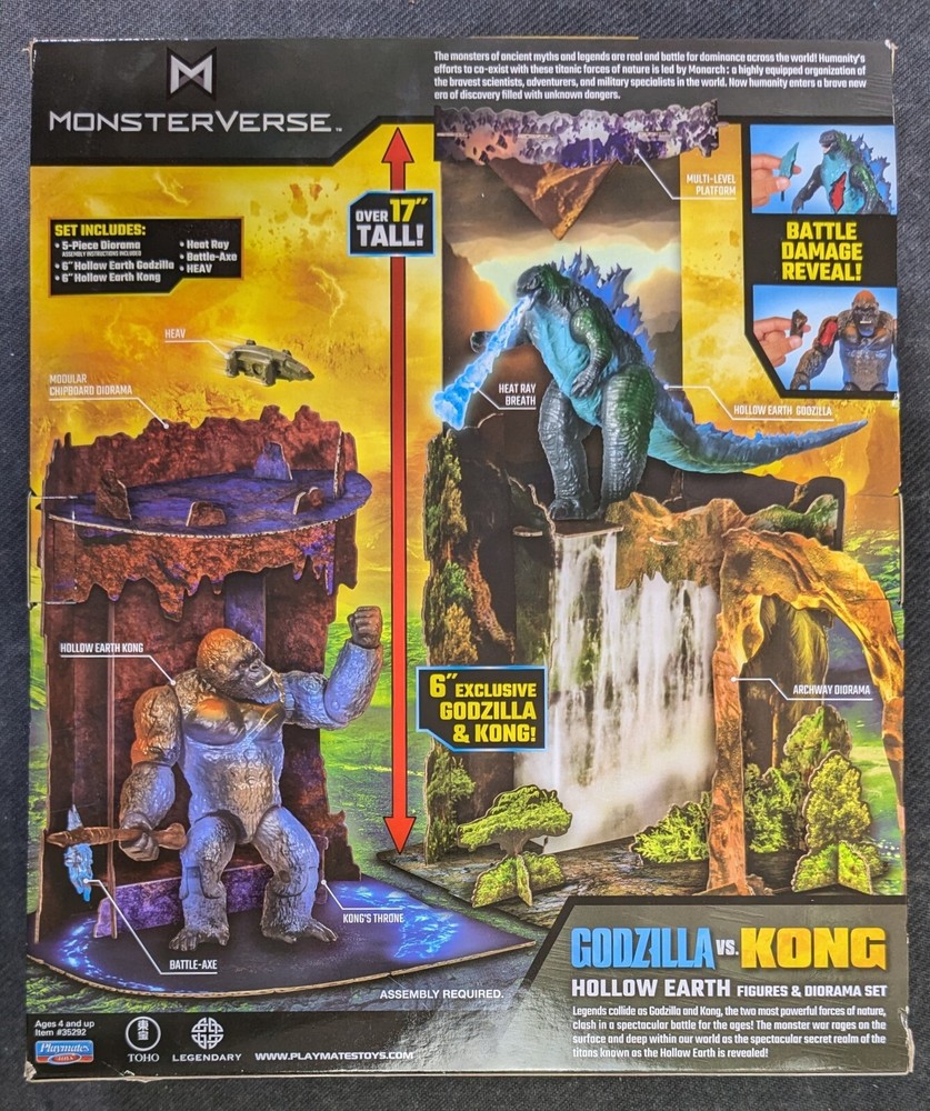Enter the world of Godzilla vs. Kong with this amazing 6-inch Playset Figures & Diorama Set. The set includes two iconic characters from the Monsterverse, Hollow Earth Godzilla and King Kong, along with a pair of gloves. The figures are intricately detailed and come with a diorama base, perfect for displaying in any collection. This action figure set is a must-have for fans of the Godzilla vs. Kong movie and the TV, Movie & Video Games theme. Made by Playmates Toys, the set is of high quality and is sure to impress. Get ready to battle it out with these two legendary characters, and add this set to your collection today.