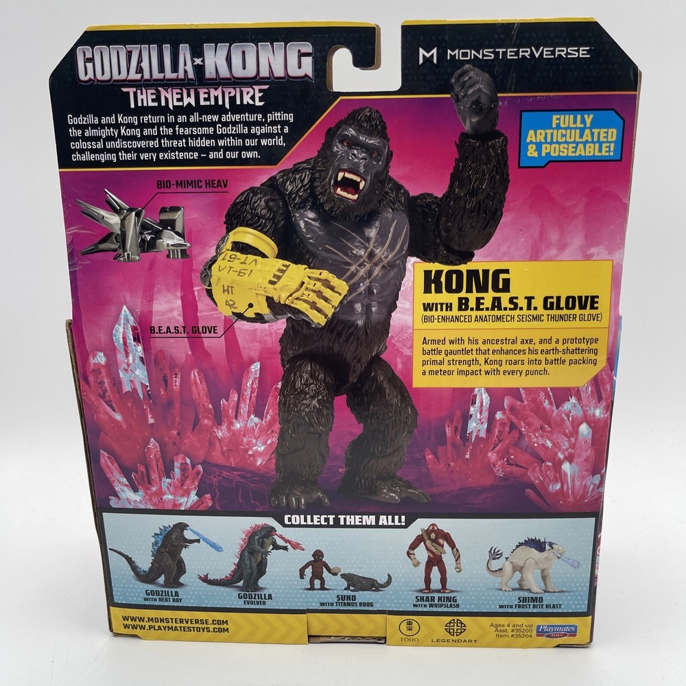 Get ready for an epic battle with this 6 inch Kong action figure from the Godzilla x Kong franchise. This fully articulated and poseable figure comes with a Bio-Mimic Heav and a B.E.A.S.T. glove, perfect for fighting off any foes. Packaged in new 2024 movie themed packaging, this Playmates Toys original is a must-have for any collector or fan of the series. With vibrant multicolor painting, this Titanus Kong figure is made of ABS plastic and factory sealed for its protection. Suitable for ages 4 and up, this action figure also features poseable arms, legs, and head, making it a fun and interactive toy for kids.