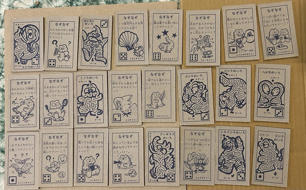 Great set of 24 Japanese menko cards featuring Godzilla, with a copyright date of 1984 (by TOHO) at the bottom. These are all cartoons of baby Godzilla characters - Mothra, Godzilla, King Ghidorah, Hedora, MechaGodzilla, Rodan, Anglias, etc. Maybe this is from the tv show Adventure! Godzilland - but this aired in 1992, so I'm not sure.