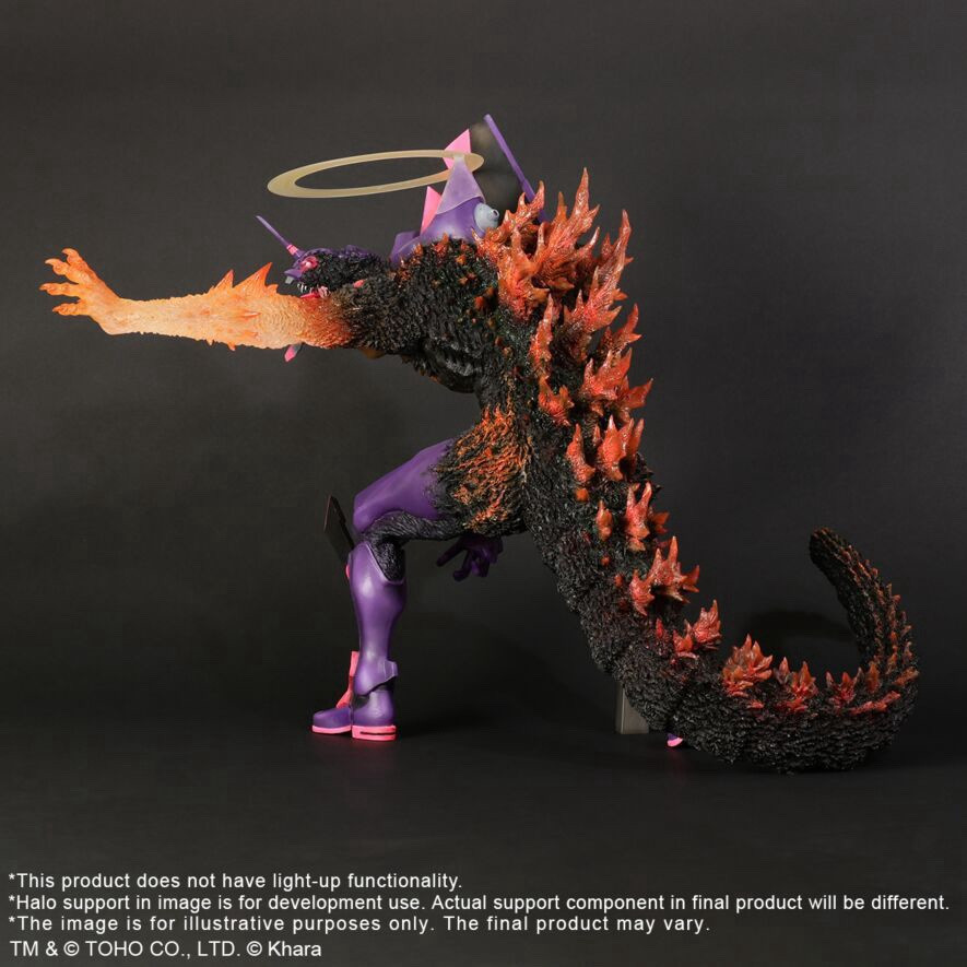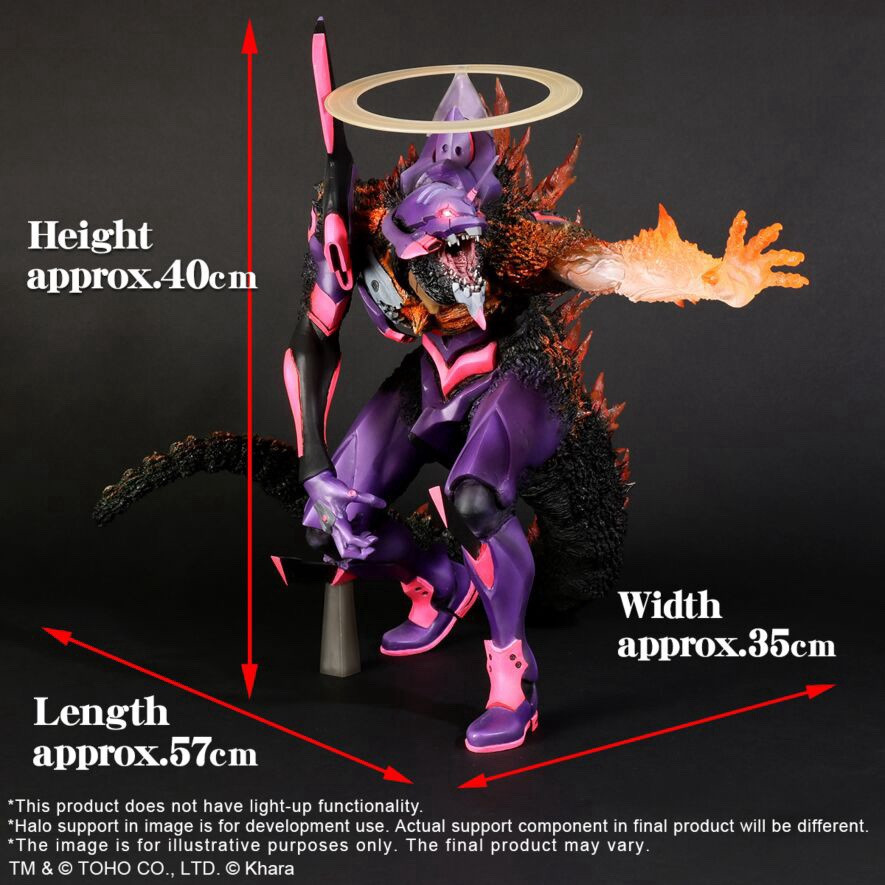 Brand new never opened figure from the first wave of production. This concept originated from a simple question: “What if we injected G-Cells into an Evangelion?” And now, the massively popular “Evangelion Unit-01 ‘G’ Awakening Form” makes its return as the “Burning G Awakening Form!” And this time, our “Evangelion Unit-01 ‘G’ Awakening Form” returns as "Burning 'G' Awakening Form"! This ominous appearance strongly draws from the original Unit-01 and features elements of Godzilla fused into its very design, complete with newly modeled parts for the head, left arm and Angel Halo. Additionally, this version adopts a color scheme inspired by Evangelion Unit-01 Awakening Version and Burning Godzilla, resulting in a design that gives off even more intensity than previous designs. Also, transparent components have been utilized for the left arm, dorsal fins, and Angel Halo to faithfully capture elements of both the Evangelion Unit-01 and Burning Godzilla designs. With an included base for additional stability and standing at a height of 40cm (including the Angel Halo), you’d be hard pressed to not enjoy having such a massive item in your collection