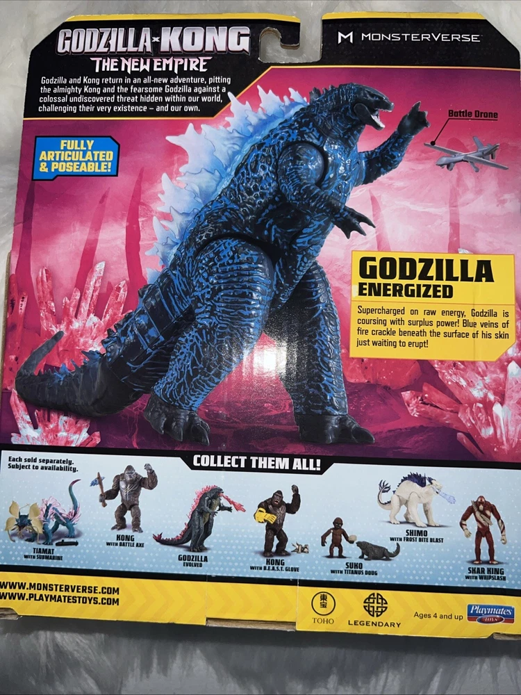 Return to Hollow Earth with Godzilla and Kong in an all-new adventure! When a colossal threat is discovered within our world, Godzilla and Kong must fight to protect their existence—and our own. The Godzilla x Kong 6” Energized Godzilla Figure brings the King of Monsters to your collection, with epic new details that capture his movie look. Set includes Battle Drone accessory and comes in a unique Godzilla x Kong package! AUTHENTIC: The Godzilla x Kong 6” Energized Godzilla Figure is sculpted with intricate designs to capture the essence of the King of Monsters. From his highly detailed design to his imposing figure, every detail is made to match the new movie, ensuring an authentic representation of his iconic character. BATTLE POSES: Standing at 6” tall, the Energized Godzilla figure will reign over any display or play setting. With multiple points of articulation, Godzilla is ready for action, so you can recreate your favorite scenes from his epic battles! DRONE ACCESSORY: Bring the action home with Energized Godzilla's battle drone! The 2.5" battle drone is inspired by epic scenes from the Godzilla x Kong movie, adding a realistic element to your playtime or display. COLLECT THEM ALL: Complete your monstrous collection with other figures and accessories from the new MonsterVerse and Godzilla x Kong lines. Choose from a wide range of characters, including old allies, dangerous foes, and new challengers to recreate epic battles and awesome new adventures! Build your very own MonsterVerse with Playmates Toys