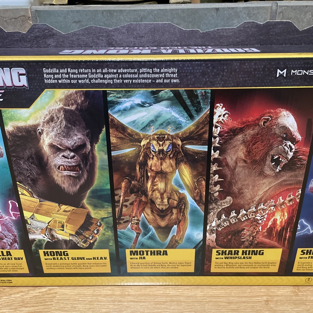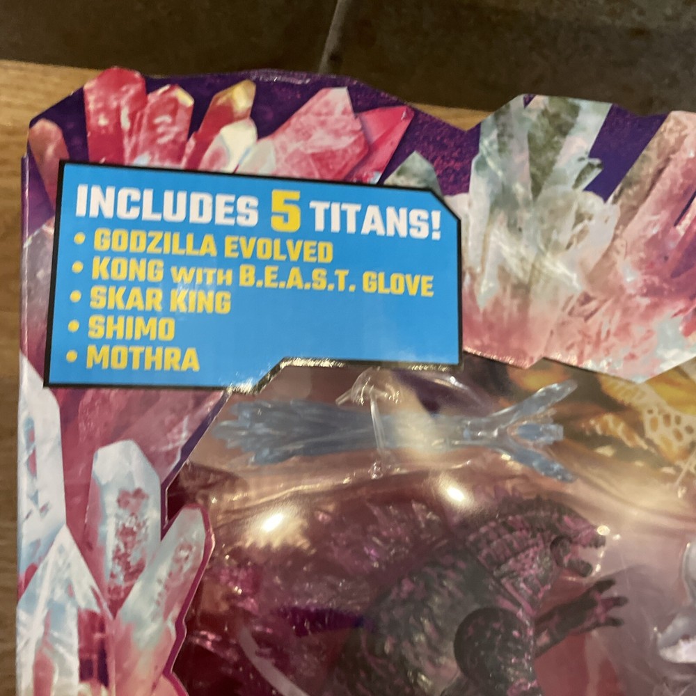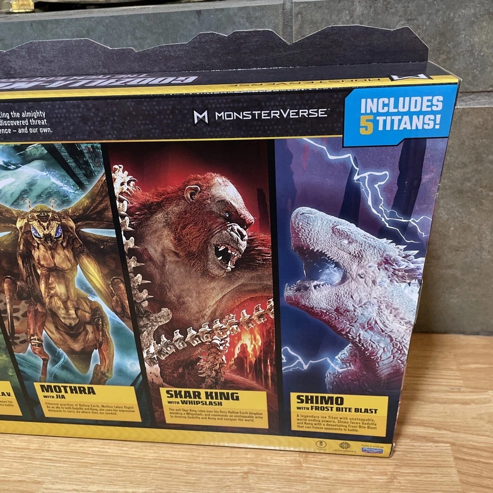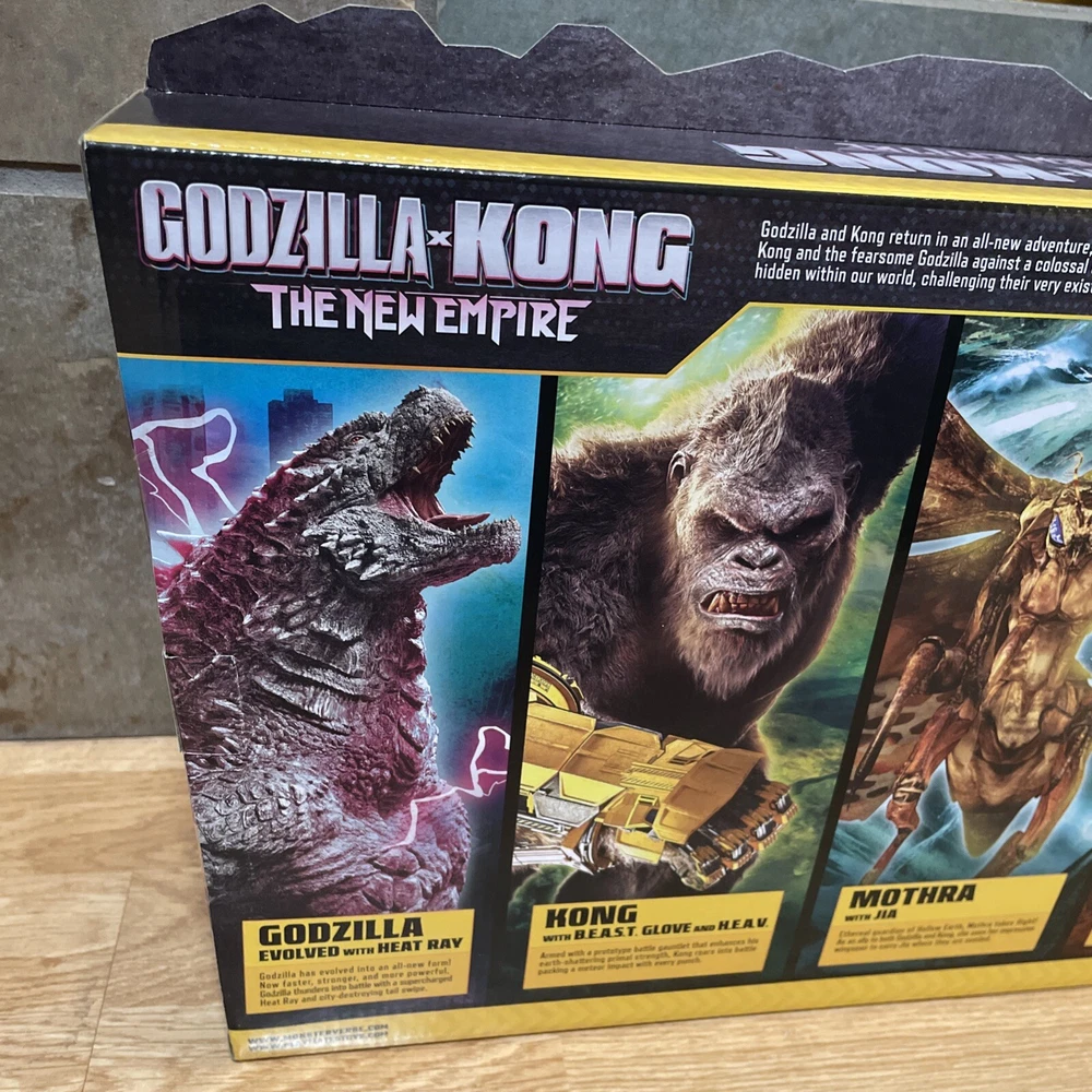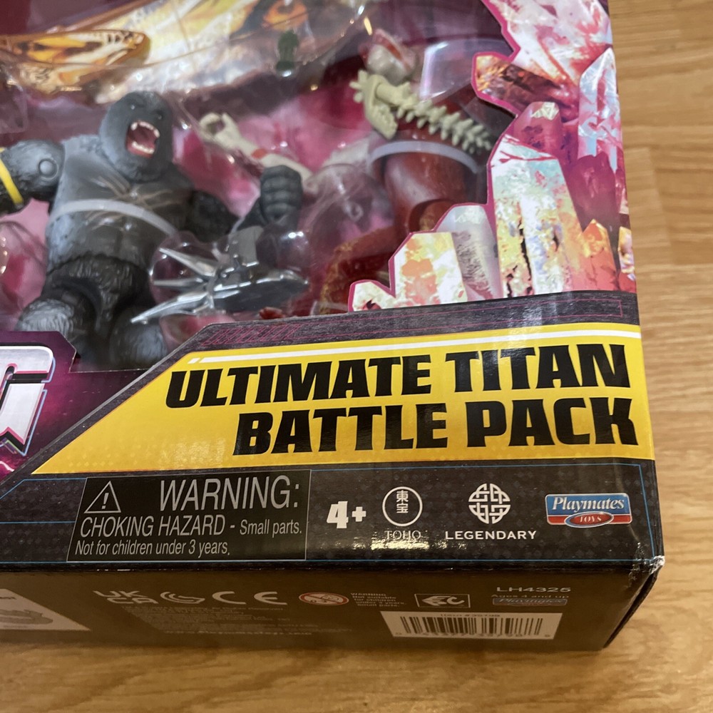 The "Godzilla x Kong New Empire Ultimate Titan Battle Pack" includes 5 figures of Godzilla and Kong characters, along with Mothra Shimo. Produced by Playmates in 2024, this toy set is part of the Godzilla theme and is recommended for ages 4 and up.