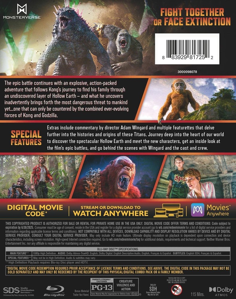 Godzilla x Kong: The New Empire (2024) (Blu-ray) Product Details Digital Copy Expiration Date : June 30, 2025 MPAA rating : PG-13 (Parents Strongly Cautioned) Product Dimensions : 0.52 x 6.83 x 5.43 inches; 2.88 ounces Item model number : 3000098078 Director : Adam Wingard Media Format : Blu-ray Run time : 1 hour and 54 minutes Release date : June 11, 2024 Actors : Rebecca Hall, Brian Tyree Henry, Dan Stevens, Kaylee Hottle, Alex Ferns Producers : Thomas Tull, Adam Wingard, Jennifer Conroy, Brian Rogers, Mary Parent Language : Spanish (Dolby Digital 5.1), English (Dolby Atmos), English (Dolby Digital 5.1) Studio : Warner Home Video Country of Origin : USA Number of discs : 1 Genre: Science Fiction & Fantasy, Action & Adventure Format: Blu-ray Contributor: Adam Wingard, Brian Rogers, Kaylee Hottle, Jennifer Conroy, Rebecca Hall, Dan Lin, Roy Lee, Fala Chen, Thomas Tull, Alex Garcia, Mary Parent, Yoshimitsu Banno, Dan Stevens, Brian Tyree Henry, Alex Ferns, Jay Ashenfelter, Kenji Okuhira, Eric McLeod Adam Wingard, Brian Rogers, Kaylee Hottle, Jennifer Conroy, Rebecca Hall, Dan Lin, Roy Lee, Fala Chen, Thomas Tull, Alex Garcia, Mary Parent, Yoshimitsu Banno, Dan Stevens, Brian Tyree Henry, Alex Ferns, Jay Ashenfelter, Kenji Okuhira, Eric McLeodAdam Wingard, Brian Rogers, Kaylee Hottle, Jennifer Conroy, Rebecca Hall, Dan Lin, Roy Lee, Fala Chen, Thomas Tull, Alex Garcia, Mary Parent, Yoshimitsu Banno, Dan Stevens, Brian Tyree Henry, Alex Ferns, Jay Ashenfelter, Kenji Okuhira, Eric McLeod See more Language: English Runtime: 1 hour and 54 minutes The epic battle continues! The cinematic Monsterverse follows up the explosive showdown of “Godzilla vs. Kong” with an all‐new adventure that pits the almighty Kong and the fearsome Godzilla against a colossal undiscovered threat hidden within our world, challenging their very existence—and our own. “Godzilla x Kong: The New Empire” delves further into the histories of these Titans and their origins, as well as the mysteries of Skull Island and beyond, while uncovering the mythic battle that helped forge these extraordinary beings and tied them to humankind forever.Bonus Content:Commentary by Director Adam Wingard, Visual Effects Supervisor Alessandro Ongaro, Production Designer Tom Hammock and Editor Josh Schaeffer GxK: Day of Reckoning Evolution of the Titans: Godzilla Evolved Evolution of the Titans: Kong's Journey: From Lonely God to King Into the Hollow Earth: Visualizing Hollow Earth Into the Hollow Earth: Monsters of Hollow Earth The Battles Royale: A Titanic Fight Among the Pyramids The Battles Royale: The Zero Gravity Battle The Battles Royale: The Titans Trash Rio The Intrepid Director: Adam Wingard: Big Kid The Imagination Department The Monarch Island Base: Portal to Another World The Evolution of Jia: From Orphan to Warrior The Intrepid Director: Adam Wingard: Set Tour Bernie's World: Behind the Triple Locked Door