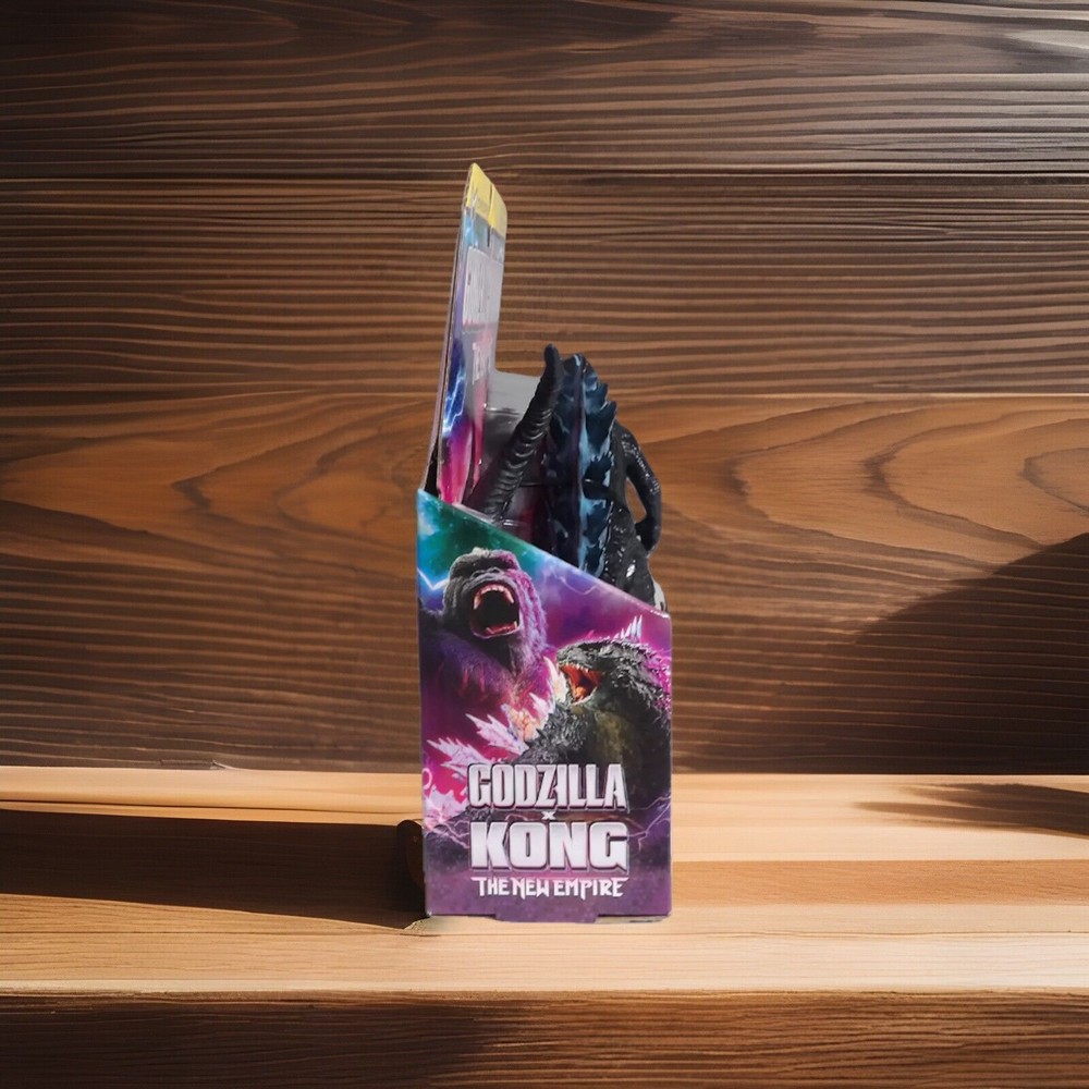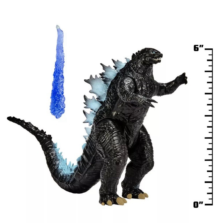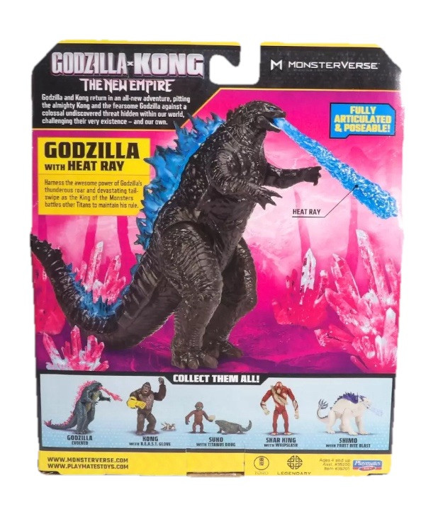 This Playmates Toys action figure is based on the Godzilla character from the movie "Godzilla x Kong The New Empire". It features a removable tail and battle damaged chest piece. The figure stands at 6 inches tall and is made of ABS, ABS Plastic, and Plastic materials. It also comes with a heat ray blast accessory and translucent blue spine details. This item is from the TV, Movie & Video Games theme and is factory sealed. The figure is an original licensed reproduction and is not a vintage item. The package includes the figure and chest piece battle damage accessory.