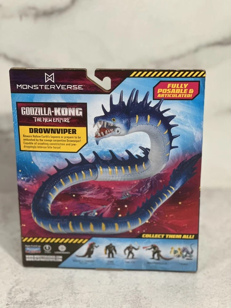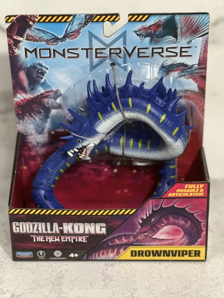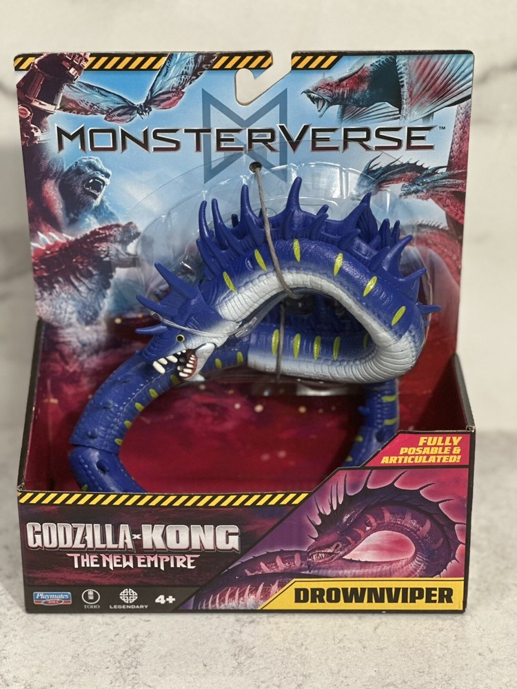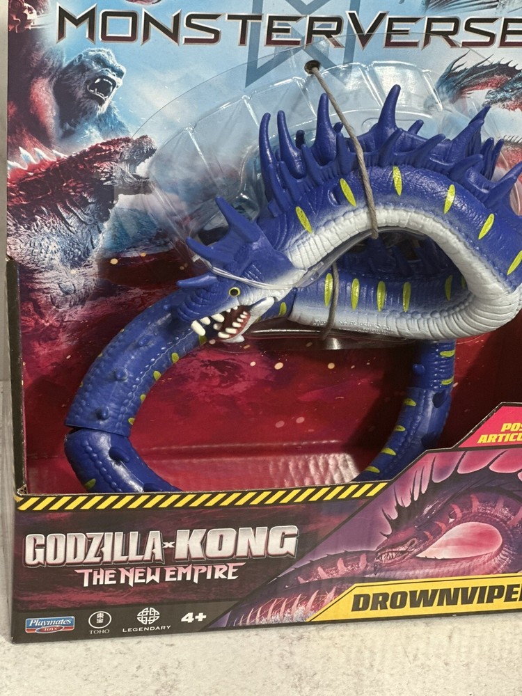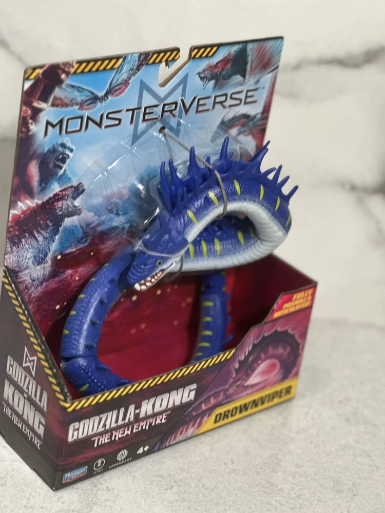The product is a Monsterverse DROWNVIPER action figure from the "Godzilla x Kong The New Empire" movie. It is a multicolor action figure manufactured in 2024 by Playmates Toys. The figure is part of the Godzilla franchise and features adjustable articulation. The model number is 35215 and it is designed by DROWNVIPER. Made in China.