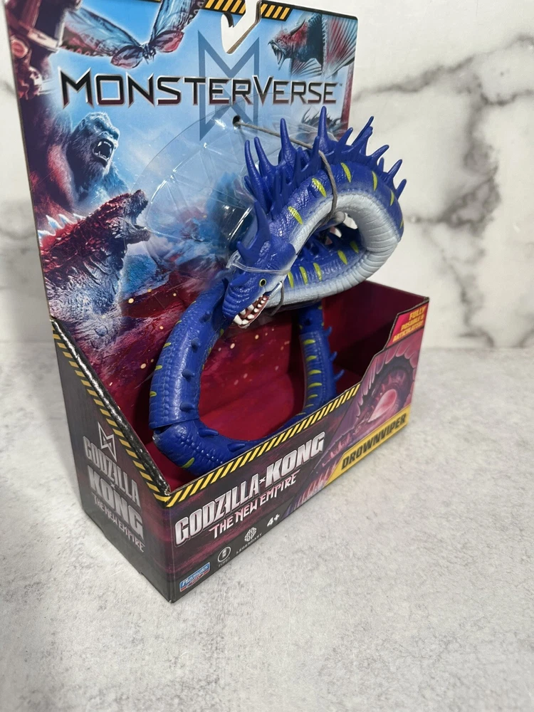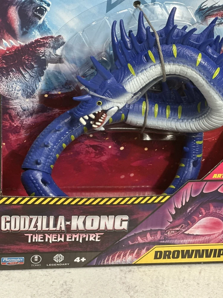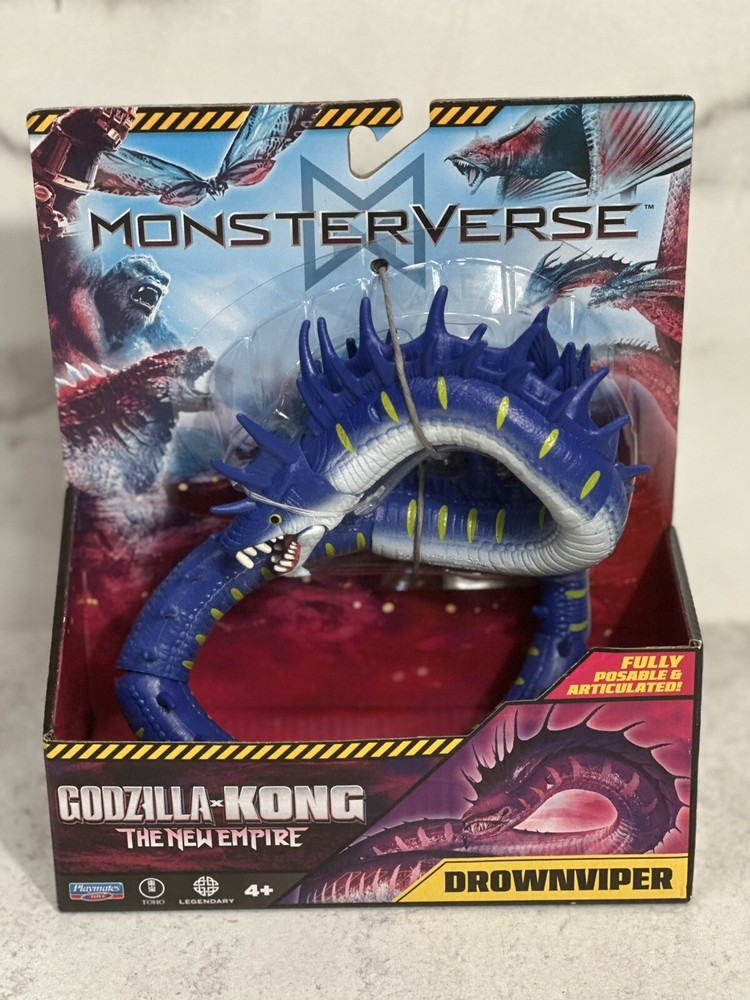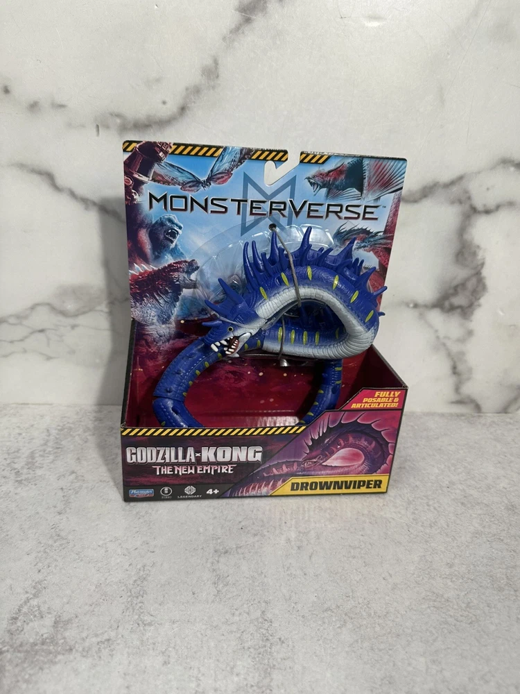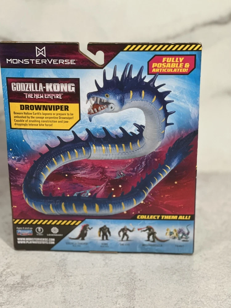 The product is a Monsterverse DROWNVIPER action figure from the "Godzilla x Kong The New Empire" movie. It is a multicolor action figure manufactured in 2024 by Playmates Toys. The figure is part of the Godzilla franchise and features adjustable articulation. The model number is 35215 and it is designed by DROWNVIPER. Made in China.