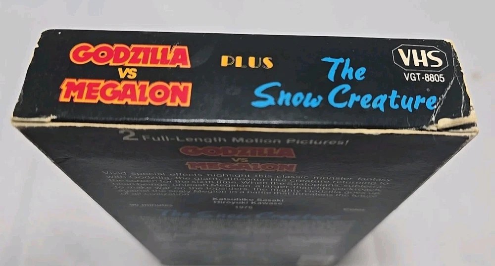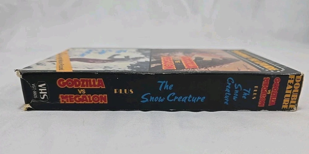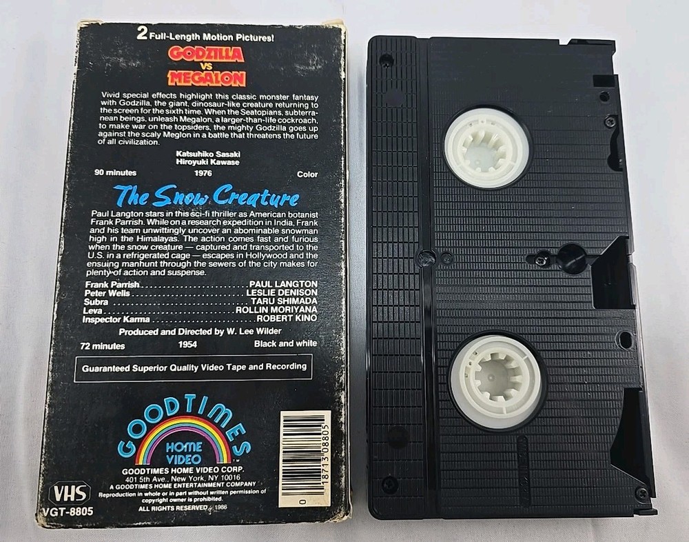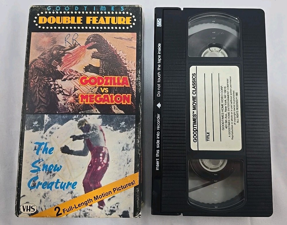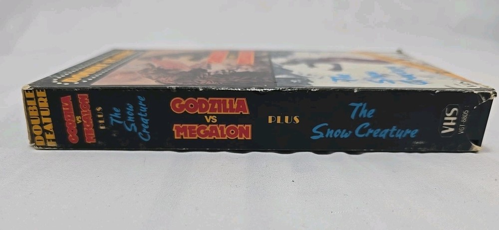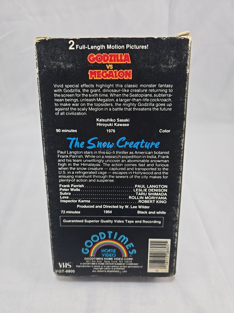 The GoodTimes Double Feature VHS includes "Godzilla vs. Megalon" and "The Snow Creature." This sci-fi & fantasy horror film features Hiroyuki Kawase (Godzilla vs Megalon) and Paul Langton (The Snow Creature) in the cast. Case has some wear and tear, pen marks, and price tag residue.