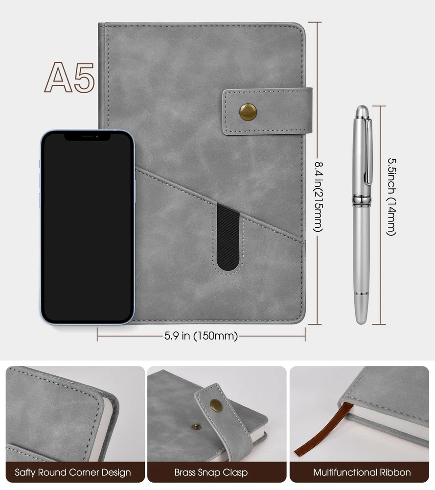 Grey A5 Lined Leather Journal Notebook for Men Women,5.9 X 8.4" Personalized Hardcover Journal with Pen,200 Pages 100 Gsm Thick Ruled Paper Daily Diary for School,Travel,Business,Work,Home Writing ✓ Free 60 Day Returns ✓ Free Express Shipping Description: Features: VALUE OF MONEY- Classic grey ruled notebook, journals are elegant, quality crafted books available at a surprisingly competive price and quality. A huge choice for everyday use, provides plenty of space for notes, lists, musings, and more. And each notebook will give away a luxury pen,This is one of our best journal pens gifts. PREMIUM THICK PAPER - 200 pages 100gsm thick lined paper, thicker 30% than normal, this grey notebook is designed to avoid feathering and the paper is ink-proof, suit for most pens, but the wettest pen inks. Archival-quality pages made from acid-free paper-resists damage from light and air, the cream paper is easy on eyes.Let your creation more freedom on the wide ruled journal to write in. FAUX LEATHER JOURNAL - This elegant Journal notebook has suede hardcover but feel soft in hand, just like a baby's skin. Fashion but durable cover adapts to the movements of body without damage. The notebook's hard cover protects the pages inside and doubles as a convenient writing surface. Great gift for any. Gusseted DESIGN - Gusseted Pocket DESIGN and Cardboard Bound Cover,metal buckle helps keep notebook securely closed, making it easy to write in the notebook from just about anywhere. This notebook provide you a high quality writing experience.Expandable Gusseted pocket for stashing loose notes,business cards, receipts, mobile phone, or other small items. Great Use & Perfect Journal GiftsIdeal for all office,school and home use,including for taking notes and keeping work in order,as a diary or journal for brainstorming ideas,creative writing or just doodling and drawing to your hearts content.This personalized journal notebook is a great birthday,mothers day,fathers day,children's day,graduation,Christmas journal Gifts.It is an ideal gift for mom,dad, teachers,classmates,colleagues,wife,husband,friends,daughters,sons and granddaughter. Product Details: Brand: vfaejll Color: Grey Theme: Book Sheet Size: A5 Pages: 200 Pages Cover Material: Faux Leather Style: Classic,Elegant Ruling Type: Ruled Special Feature: Hard Cover Number of Items: 1 Brand: vfaejll Item Weight: 13.4 ounces Product Dimensions: 8.2 x 5.5 x 0.78 inches Item model number: vfaejll155881 Color: Grey Cover Material: Faux Leather Number of Items: 1 Size: A5 Ruling: Ruled Sheet Size: A5 Manufacturer Part Number: vfaejll155881 Date First Available: October 15, 2021