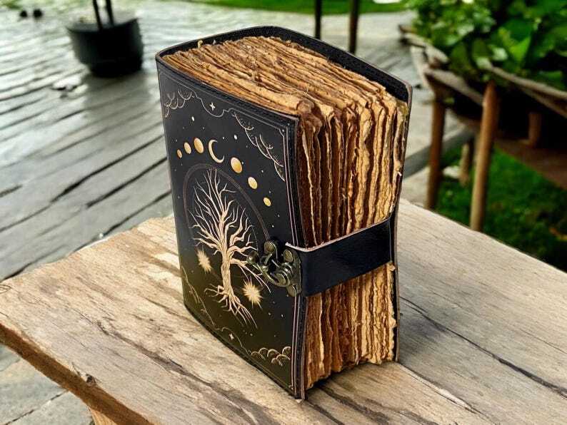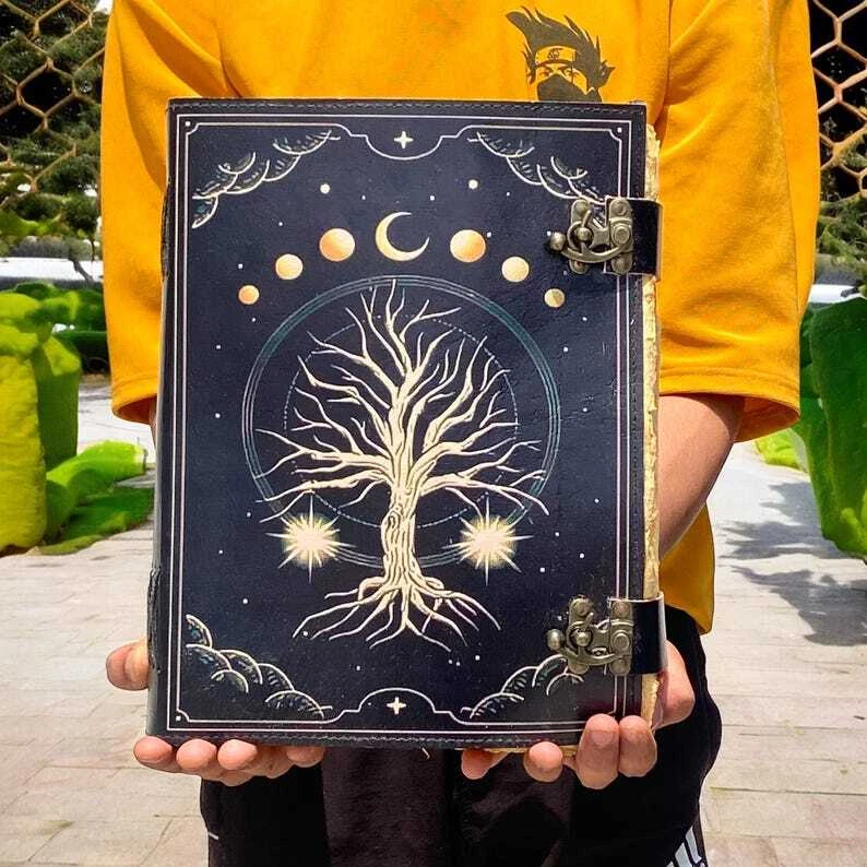 Large Grimoire leather journal, Print Tree of Life Journal, Blank spell book of shadows Leather Celestial Gifts for Him Her * Print - Tree of life * Brass C Clasp lock closure * Genuine buffalo leather * Vintage deckle edge old paper * Handmade rustic cotton paper ↪ Size - 7x5 Inches, 8x6 Inches, 10x7 Inches ● Leather journal witchcraft book of shadows notebook is made with Antique Paper which looks like it was pulled from history. You will fall in love with the antique handmade cotton paper which is unique to our Vintage Journal Notebook. ● The vintage clasp lock will keep all your valuable writing locked inside. Sturdy hand stitched binding to make sure that no paper comes out loose from your spell notebook. ● Sketch, Doodle, Write on your Leather Blank Spell Journal with a Calligraphy Pen Fountain Pen, Brush Pen, Ball Pen, Acrylic Colors, Watercolor and many more. We guarantee no bleed through. ● Artist Sketchbooks, Photo Album, Traveling Notes, Business Executive, Logbook, Poetry Work, Journalists, Food Planner, Instagram Scrapbook and Bible Journaling.
