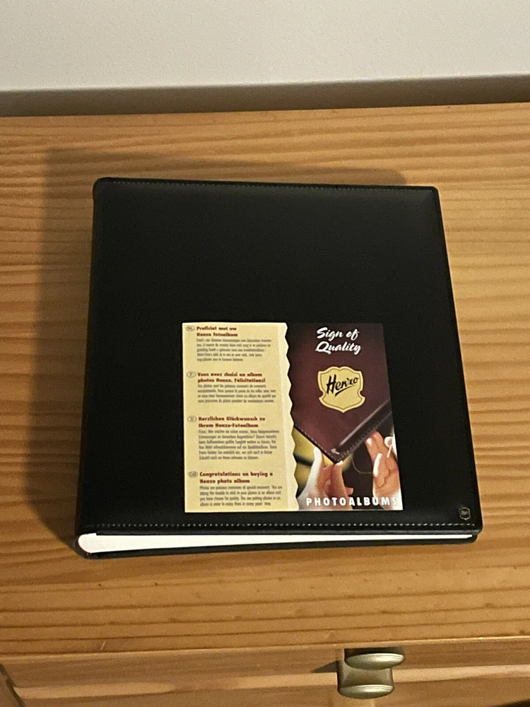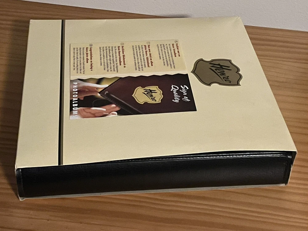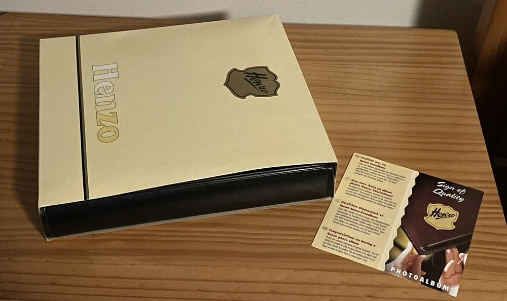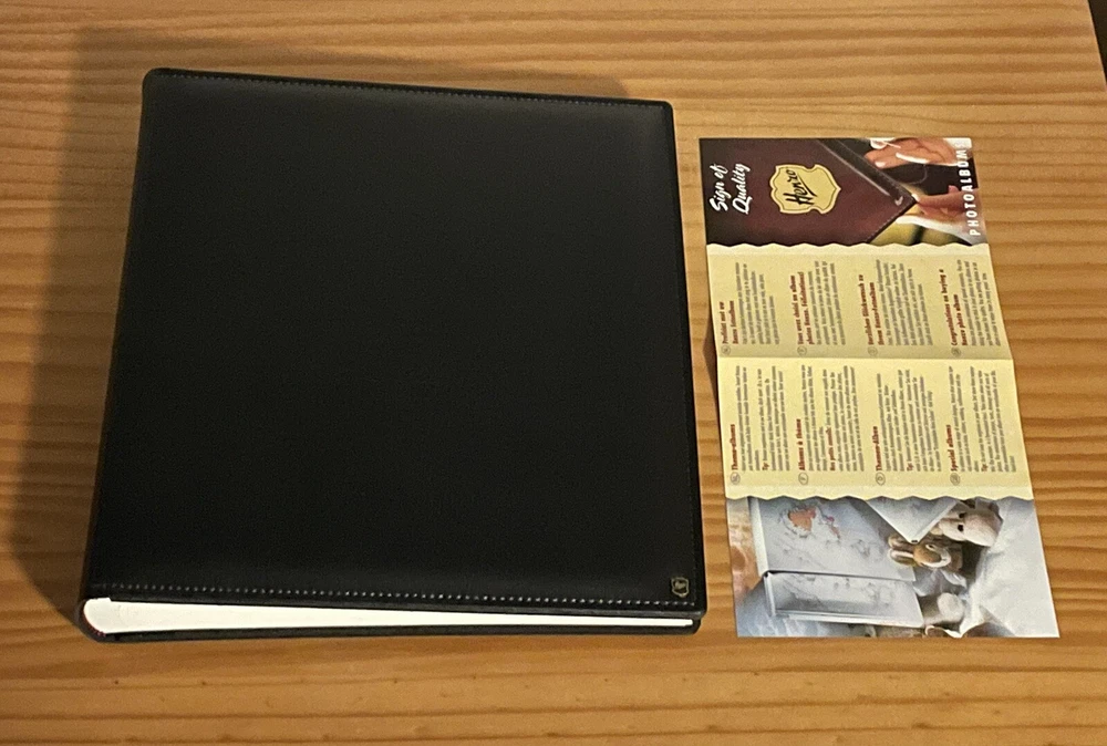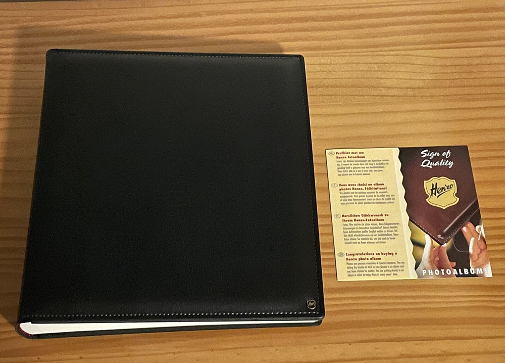 This high quality HENZO 12" x 11" Black Leatherette Glue In Scrap Book/Photo Album with 33 acid-free pages is Brand New but unwrapped. I have had this HENZO photo album safely stored in a closet for several years but never had a use for it. Photos may be glued in place with acid-free adhesive or by using photo corners. Feel free to ask any questions. Ships within the lower 48 U.S. states only. Thanks for looking.