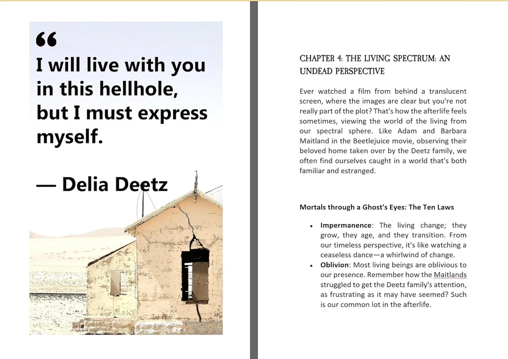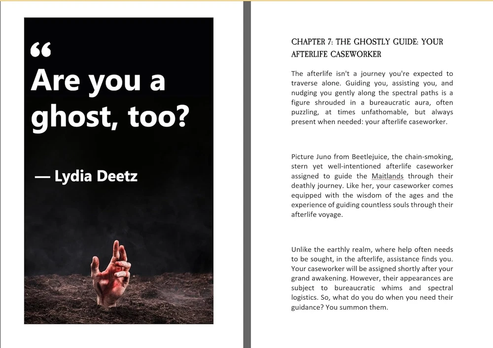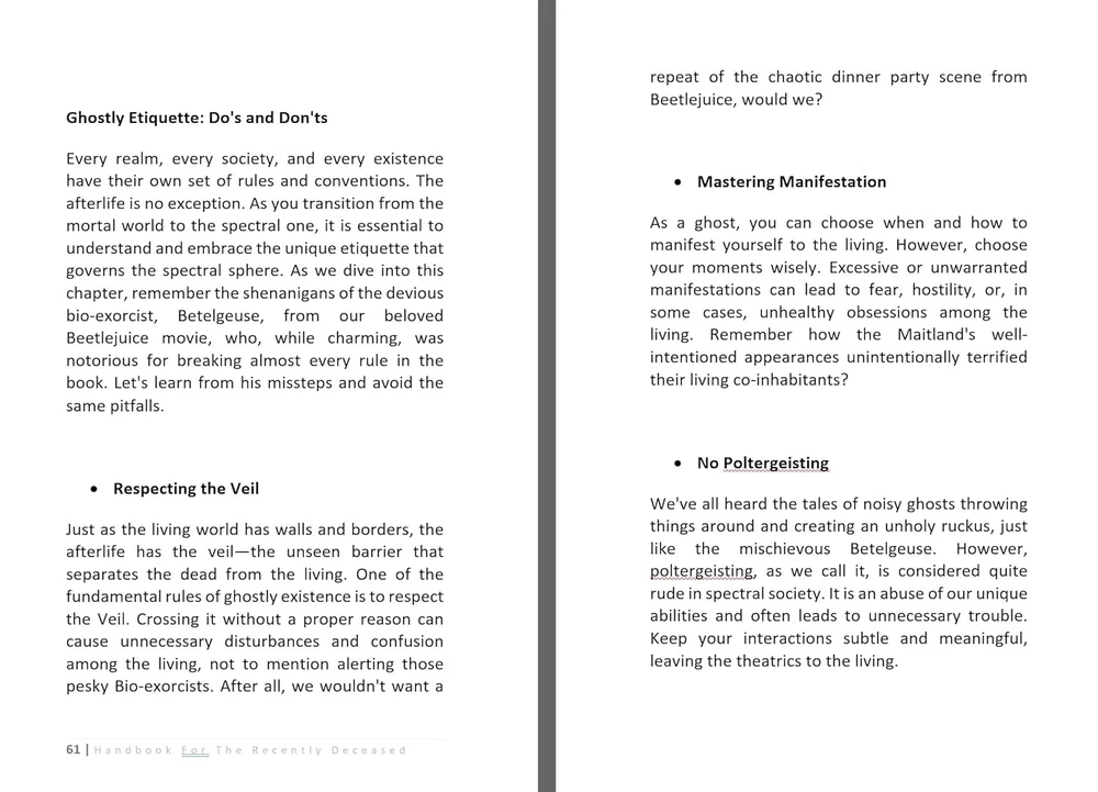 Store New Arrivals Add to Favorite View Feedback Contact Handbook for the Recently Deceased: the Afterlife - Halloween Gifts Description Publisher Pooper Publishers (August 18, 2024) Paperback 236 pages Dimensions 6 x 0.54 x 9 inches Language English Item Weight 13.7 ounces ISBN-10 1963674790 ISBN-13 978-1963674798 The Ultimate Halloween Gifts: Handbook for the Recently Deceased BEETLEJUICE JOURNAL & HANDBOOK Are you a fervent Beetlejuice fan? Have you always wondered about the mysterious "Handbook for the Recently Deceased" that captivated you throughout the film? Good news! The long-awaited treasure, inspired by the iconic movie prop, is finally here - and it's no empty mock-up, but the real deal! Prepare to delve deep into the supernatural as you explore pages filled with instructions on , haunting, and so much more. This handbook is a veritable encyclopedia of the ethereal, all housed in a beautifully designed cover that faithfully recreates the look of the movie's unforgettable prop. Perhaps you were skeptical, expecting a novelty blank journal. Banish those thoughts! This handbook is crammed full with useful (or at least entertaining) information. All the references you loved from the movie, plus even more secrets of the afterlife, are waiting for you in this truly unique tome. The handbook is designed with readability in mind, boasting a large text font that's easy on the eyes - a feature anyone can appreciate. And for those die-hard Beetlejuice fans among you, you're sure to resonate with one fellow fan who declared, "As someone who grew up watching Beetlejuice on repeat, I bought this book without hesitation and would definitely buy again!" Indeed, the "Handbook for the Recently Deceased" is an absolute must-have for any Beetlejuice fan's collection. Whether you're a long-time follower of the movie or a newfound fan, you'll appreciate the nostalgic nod and captivating content of this handbook. Don't miss out on the opportunity to secure this beloved piece of Beetlejuice lore. It's time to turn the page to your new adventure in the afterlife! Scroll Up Now and Click The Buy Button To Get Started! ABOUT US We offer the best prices around on high quality products. Our E-store includes media such as books, movies, music and games while offering electronics, toys, sporting apparel, clothing, tools, general home, garden items and more. SHIPPING We are always working hard to ensure your package arrives as soon as possible. Please understand that some factors like weather, high postal traffic, and the performance of shipping companies are outside of our control. We offer free shipping to the lower 48 states and ship within 2 business days of payment, usually sooner. We do not accept P.O. Boxes. Please provide a physical address. For shipping outside of the continental USA, we only use eBay's Global Shipping Program.The item is shipped to KY and then sent to the rest of the world. International customers are responsible for all duties and taxes. Continue to check out in order to calculate costs for shipping the item to your country. Messages regarding eBay's Global Shipping Program MUST be directed at eBay EXCLUSIVELY. RETURNS We offer a 30-Day Return Policy on items which you are not completely satisfied with. You have the option for a full-refund or an exchange of the item. No returns are available on items shipped outside of the USA. PAYMENT We accept PayPal. CONTACT US This page content is yet to come Please ad us to your favorite seller and visit again later Thank You CUSTOMER SATISFACTION We try our very best to make sure every customer is completely satisfied. If there's a problem, message us! We're happy to help. WE ACCEPT Copyright © 2021 AutoDS. | All Rights Reserved