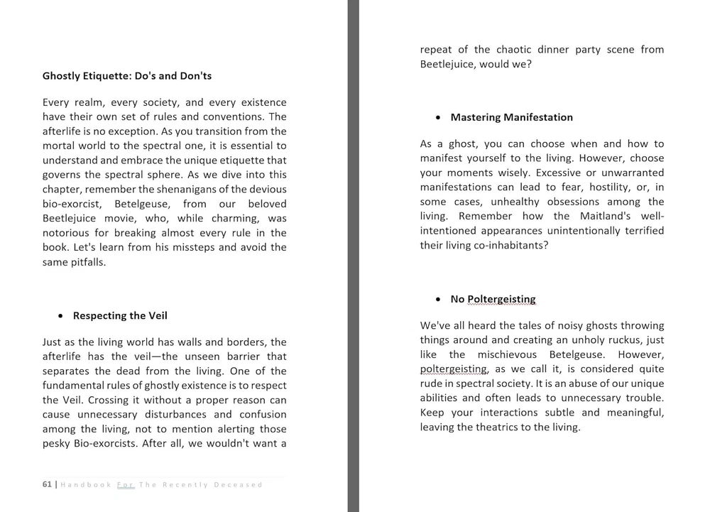 The Ultimate Halloween Gifts: Handbook for the Recently Deceased BEETLEJUICE JOURNAL & HANDBOOK Are you a fervent Beetlejuice fan? Have you always wondered about the mysterious "Handbook for the Recently Deceased" that captivated you throughout the film? Good news! The long-awaited treasure, inspired by the iconic movie prop, is finally here - and it's no empty mock-up, but the real deal! Prepare to delve deep into the supernatural as you explore pages filled with instructions on levitation, haunting, and so much more. This handbook is a veritable encyclopedia of the ethereal, all housed in a beautifully designed cover that faithfully recreates the look of the movie's unforgettable prop. Perhaps you were skeptical, expecting a novelty blank journal. Banish those thoughts! This handbook is crammed full with useful (or at least entertaining) information. All the references you loved from the movie, plus even more secrets of the afterlife, are waiting for you in this truly unique tome. The handbook is designed with readability in mind, boasting a large text font that's easy on the eyes - a feature anyone can appreciate. And for those die-hard Beetlejuice fans among you, you're sure to resonate with one fellow fan who declared, "As someone who grew up watching Beetlejuice on repeat, I bought this book without hesitation and would definitely buy again!" Indeed, the "Handbook for the Recently Deceased" is an absolute must-have for any Beetlejuice fan's collection. Whether you're a long-time follower of the movie or a newfound fan, you'll appreciate the nostalgic nod and captivating content of this handbook. Don't miss out on the opportunity to secure this beloved piece of Beetlejuice lore. It's time to turn the page to your new adventure in the afterlife! Scroll Up Now and Click The Buy Button To Get Started!