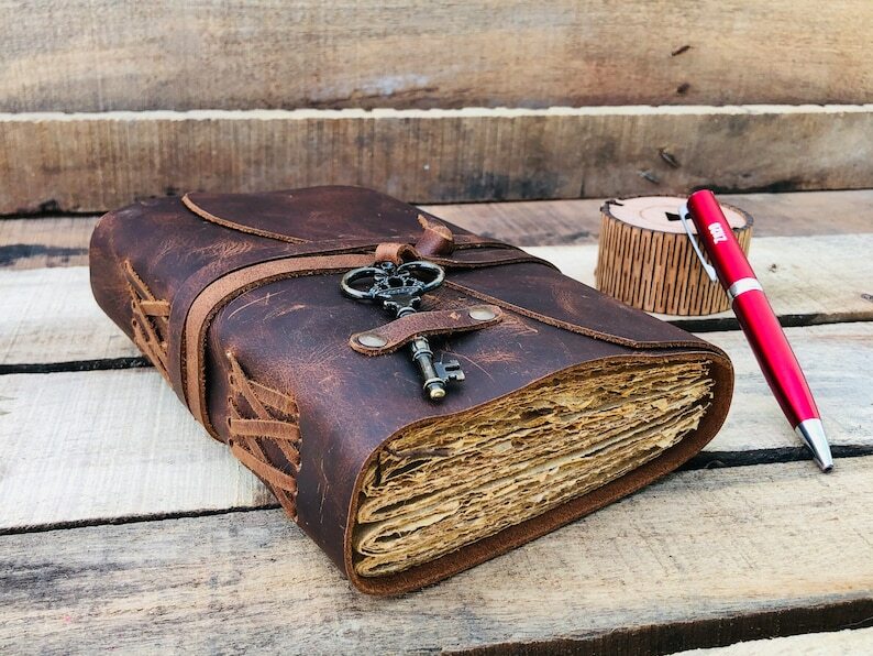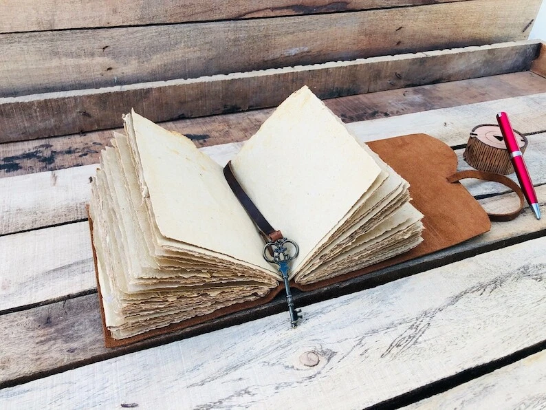 The Handmade Vintage Deckle Edge Paper looks and feels like a thousand years old is treat to write on. The paper is made from environmentally friendly cotton and jute canvas. The paper is acid-free and pH neutral therefore is a timeless piece of art. No more worries about ink messing up the pages either. The thick pages are ideal for pen, pencil, crayons and even charcoal! We can guarantee no bleed through! The vintage Leather Bound Journal is a perfect sketchbook, book of shadows, grimoire, wicca, calligraphy journal, scrapbook, art journal, leather Sketchbook Drawing and many more. The leather bound journal made from antique paper is a treasure that you can pass down the generations. The leather is soft and supple to the touch and smells amazing. The leather will age over time and will get better and better. Its the perfect travel companion to cherish memories or even to jot down precious ideas and there is not better way preserve your memories for your future generations. Get Yourself The Most Valuable Travel Companion Today – Never Have To Travel Alone Again. Handcrafted by skilled artisans with a lot of love and care. Here’s Why This Vintage Leather Bound Writing Journal Is What You Are Looking For: 1. Soft Luxurious Durable and Supple Rustic Leather Bound Cover which ages with time. 2. 120 Pages of Thick Antique Vintage Cotton Paper which looks like thousand years old. 3. Sturdy Leather Binding Technique will make sure that the pages never fall off. 4. Medium size 7 by 5 inches rustic scrapbook/organizer easily portable. 5. Being hand-made, no two journals are quite the same.