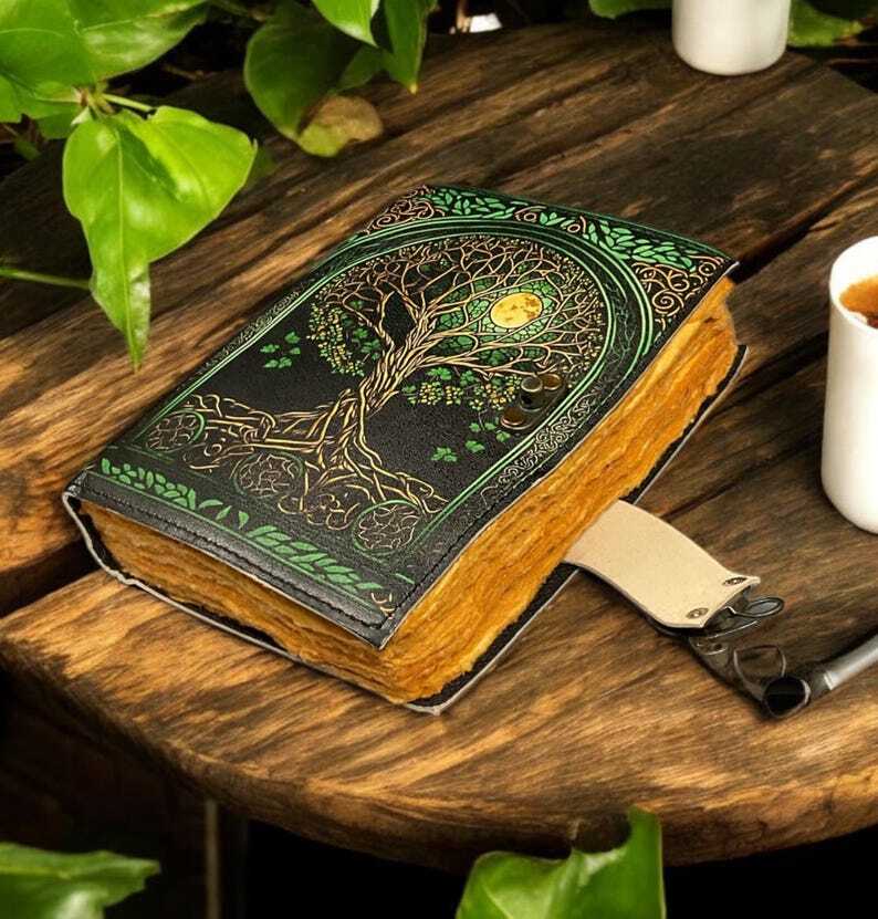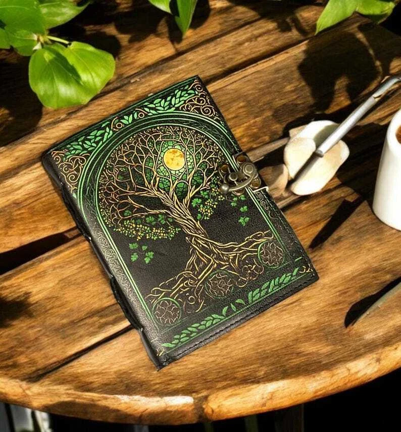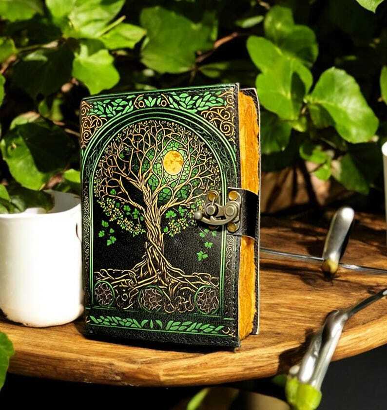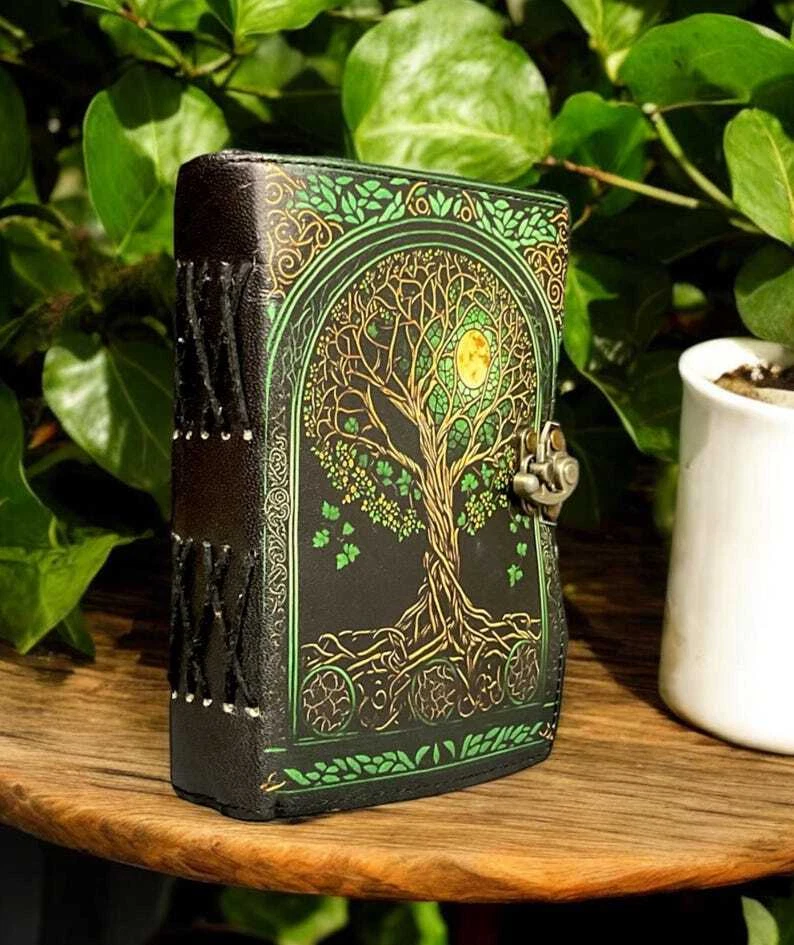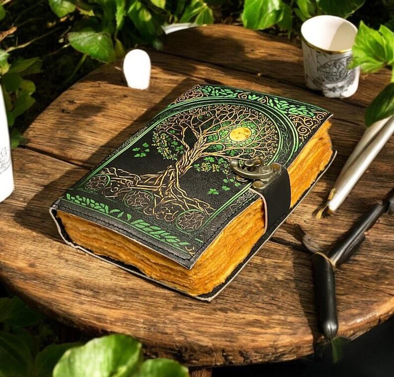 400 Page Large Grimoire leather journal, Print Tree of Life Journal, Blank spell book of shadows Leather Celestial Gifts for Him Her • Print - Tree of life • Vintage lock closure • Genuine leather • Vintage deckle edge old paper • Handmade rustic cotton paper ● Leather journal witchcraft book of shadows notebook is made with Antique Paper which looks like it was pulled from history. You will fall in love with the antique handmade cotton paper which is unique to our Vintage Journal Notebook. ● The vintage clasp lock will keep all your valuable writing locked inside. Sturdy hand stitched binding to make sure that no paper comes out loose from your spell notebook. ● Sketch, Doodle, Write on your Leather Blank Spell Journal with a Calligraphy Pen Fountain Pen, Brush Pen, Ball Pen, Acrylic Colors, Watercolor and many more. We guarantee no bleed through. ● Artist Sketchbooks, Photo Album, Traveling Notes, Business Executive, Logbook, Poetry Work, Journalists, Food Planner, Instagram Scrapbook and Bible Journaling.