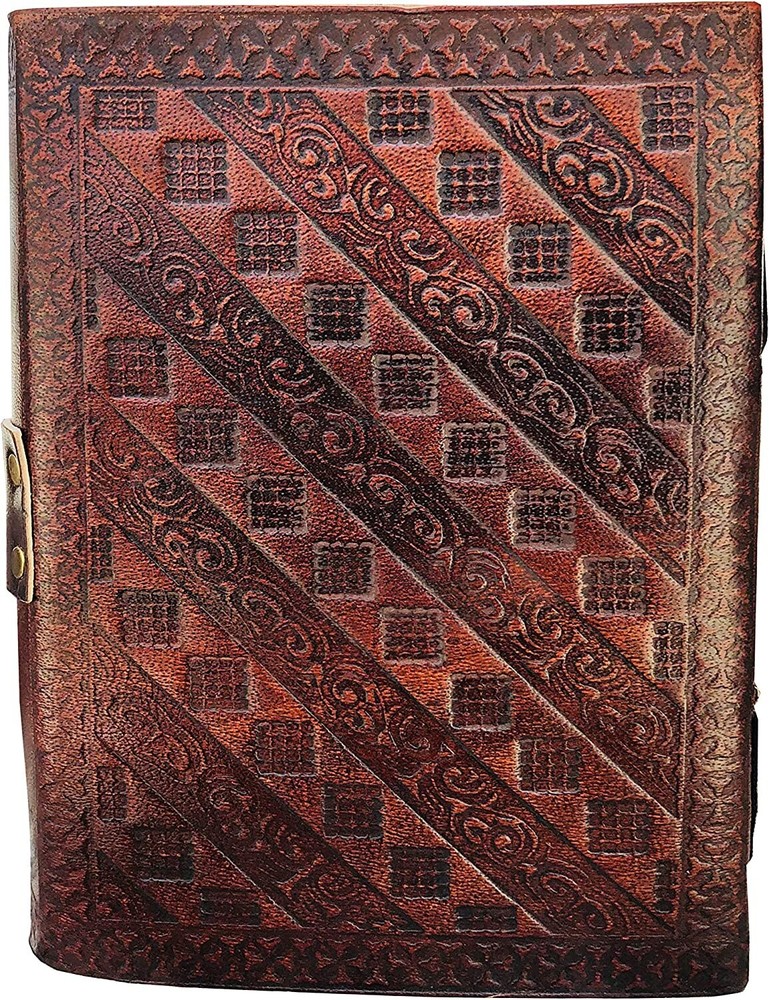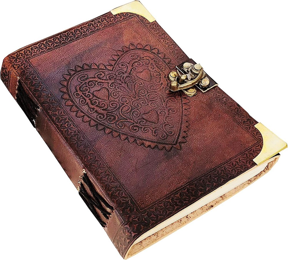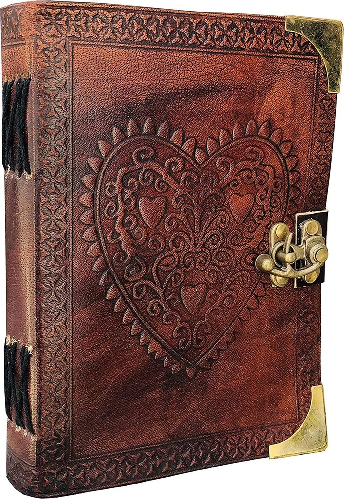 Product Description Leather Journal with Heart Embossed - Handmade Leather Notebook (Handmade Paper) - Bound With Lock Closure Hearts bring good and loving memories to mind, this leather Heart embossed Journal is something you must have. Made with finest genuine quality leather and pages are made of superior quality. This peace of art has a polished finish which makes it a great choice for all leather lovers. Note: All our products are completely handmade so their might be slight variation in the designs that you see in the picture. The heart-emboss design is perfect for every piece. The perfect leather journal for her daily journal , observation writing, future goals, love notes, etc. Dimensions: 7.5 inch X 5.5 inch X 1.5 inch Pages: 120 pages of unlined handmade paper Cover: Genuine Real Leather this all-purpose journal, planner, diary, and sketchbook is made for writing, drawing, sketching, and recording important information. And it lays flat for easier use, you'll find that it's the perfect choice for daily use . use as a writing journal , diary , appointment journal , notebook , collage journal gift Use different color pens, pencil, wax color, fountain pen, watercolor, roller gel pen, highlighter, markers to your jotter book. Traveler gifts to stick travel photos, practice Calligraphy using fountain pen. Men's best hand-crafted notebook gift for birthday, anniversary, Christmas, New Year. Carry in style and get compliments Guaranteed, wherever you may go