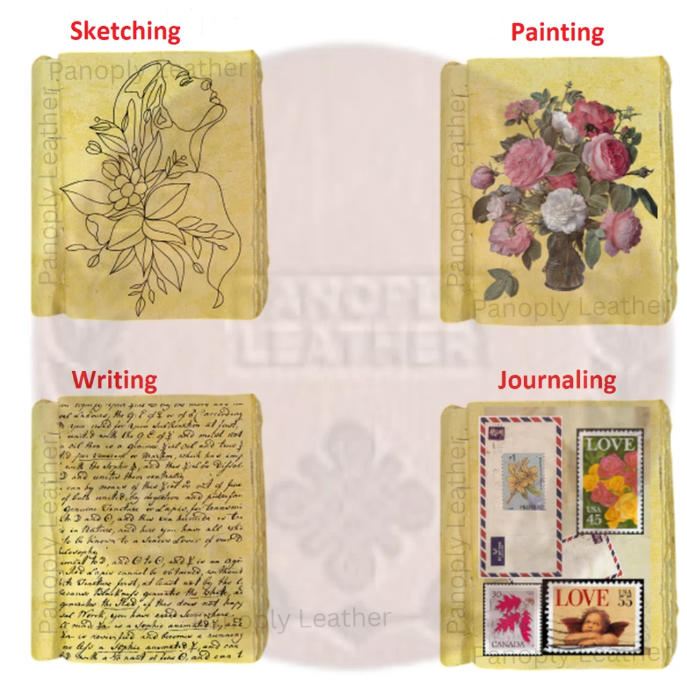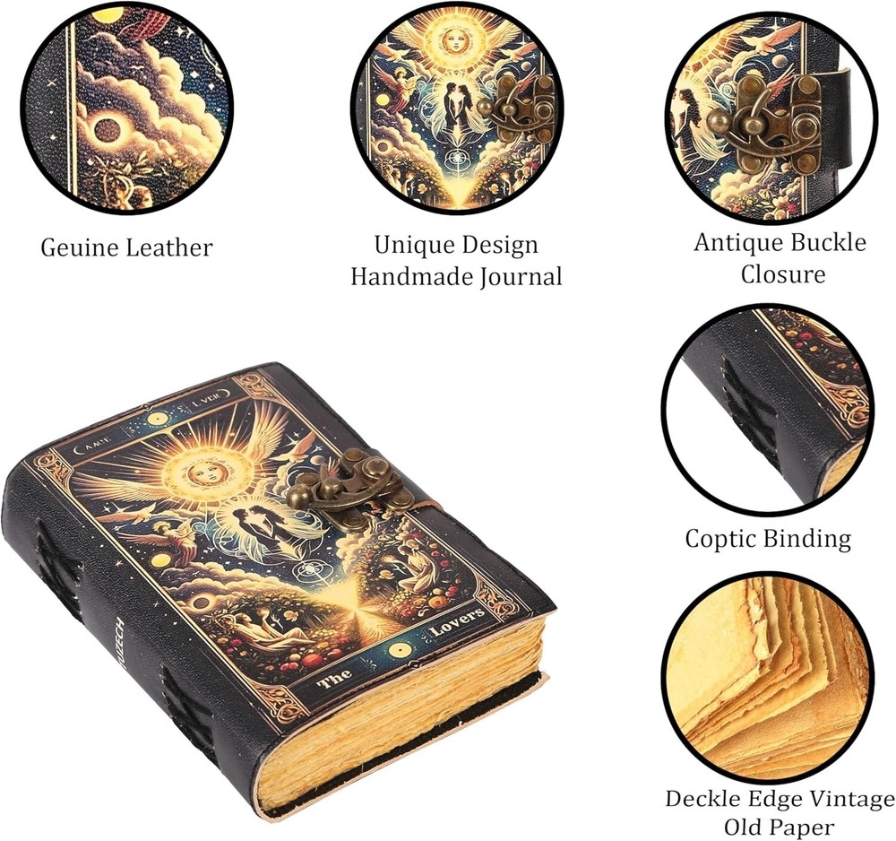 Book of Spells Leather Bound Journal Deckle Edge Paper Grimoire Printed Diary Third Eye Witchcraft Supply and Witch Spell Notebook Antique Vintage Book for Men and Women (The Angel Lovers) Handmade Leather Journal Angel Lovers Grimoire Spell Book 5x7 Blank 🔮 About This Item 🔮 BEAUTIFULLY CRAFTED: Our handmade artisan leather bound spell book grimoire journals are crafted from genuine leather. The black colouring gives it a beautiful antique vintage feel. Being hand-made from natural leather. The cover features a beautiful gold designing. IDEAL SIZE & THICK PAPER: Compact 7X5" size, easy to carry around or slip into a bag; and not so small that you can’t express any creativity - 240 pages of smooth craft paper allowing the pen to glide effortlessly across the page. PERFECT FOR GIVING: Suitable for both men or women to write in, this locking diary daily travelers notebook is perfect for an avid writer, or lover of enchanted tales fan looking for a magic spell book. Ideal to give as a birthday gift, valentines, halloween, graduation or wedding anniversary present. MYSTICAL DESIGN: Immerse yourself in the world of magic with a leather-bound journal featuring a mystical design, perfect for capturing your spells, rituals, and spiritual reflections. Handcrafted to perfection by the artisans of Rajasthan, India. OUR PROMISE: We are positive you will love our products, but if you don't for any quality reason, we will replace or refund for up to 30 days after purchase. Our friendly customer service team are always available to answer any questions you might have. MANY USES: This aesthetic Guardian of nature Journal can be used as a Hocus Pocus gifts, the lovers tarot journal, gothic notebook, skull journal, spell books halloween decorations, book of spells halloween decor, grimoire spell book, drawing or sketching and compact for carrying in your bag. Ideal for alternative Artist Sketchbooks, Photo Album, Traveling Notes, Business Executive, Logbook, hocus pocus spell book, Journalists, Food Planner, old spell notebook, antique handmade skull journal. Embrace the magic with this Angel Lovers Grimoire. Angel Lovers Design Genuine Leather Texture Deckle-Edge Cotton Paper Ready for Writing or Sketching Brass Lock Clasp Explore the artisanal craftsmanship of your Angel Lovers Grimoire! Product Description It's an Eco-friendly handmade leather journal with beautiful cover. The journal is consisting of handmade Sketch papers (khadi papers). Every page of this diary will become a gem with your precious memories. Usage: Personal journal, gift for women, gift for men, holiday gift, mother's day gift, father’s day gift, birthday gift, Valentine’s Day gift, vintage collection. Product Details: Dimensions: Length - 7 inches x Width - 5 inches Handcrafted out of the finest quality of leather. Embrace the essence of the natural world with the Guardian of Nature Diary, a sanctuary for capturing your thoughts, observations, and reflections on the wonders of the earth. A metal lock & 240 pages of unruled handmade papers Highly durable & functional, this decorative record book can be used for writing, noting & jotting, sketching, doodling or recording personal as well as professional activities Handcrafted to perfection by the artisans of Rajasthan, India Safety and Precautions: The journal is made of leather and drawing papers which should be protected from water. Its not Refillable Perfect for spells, sketches, or spiritual journaling. Why Choose This Journal? This handmade leather journal combines mystical allure with practical design. Its compact 5x7 size is perfect for travel, while the Angel Lovers design evokes enchantment, making it ideal for Wiccan practitioners, DND players, or anyone seeking a unique spell book. Whether for spells, sketches, or daily notes, this grimoire is your perfect companion. A magical gift for any mystical occasion! 📋 Specifications: Brand: Panoply Leather Model: PLCharkarEye Size: 5 x 7 inches Inner Pages: 120 Sheets (240 Pages) Material: Genuine Leather, Handmade White Cotton Plain Paper Binding: Thread Sewing, Leather Binding Type: Notepad Style: Hardcover, Vintage, Magical Closure: Brass Lock Clasp Feature: Eco-Friendly Paper Place of Origin: Rajasthan, India 💌 Buy with Confidence: Free Shipping: Ships within 1-2 business days with tracking. 30-Day Hassle-Free Returns: Your satisfaction is guaranteed. Trusted Artisans: Handcrafted by skilled artisans in Rajasthan, India. 🛒 Order Now! Elevate your writing or gifting experience with this enchanting leather grimoire. Limited stock—grab yours today! Buy Now on eBay Customer Questions & Answers What are the dimensions of this grimoire? The journal measures 5 x 7 inches, perfect for travel or ritual use. What type of paper is used? It features 120 sheets of handmade, deckle-edge cotton paper, ideal for pens, calligraphy, or sketches. Is the Angel Lovers design durable? Yes, the gold-designed Angel Lovers cover is crafted to withstand regular use. Can I use this for spell writing? Absolutely! The blank, deckle-edge pages and brass clasp make it ideal for spells or rituals. Is this journal suitable for gifting? Yes, it’s a perfect gift for Wiccan enthusiasts, writers, or fantasy lovers for occasions like Valentine’s Day or Halloween. How does the brass clasp work? The brass lock clasp securely fastens the journal, protecting your writings. Is this journal eco-friendly? Yes, it uses sustainable, handmade cotton paper for an eco-conscious choice. How do I care for the leather cover? Wipe with a dry cloth and apply leather conditioner occasionally to maintain its look. Where can I buy this journal? Purchase it on eBay via our seller profile (https://www.ebay.com/usr/panoplyleathershop) with free shipping. Does the journal come with a pen? No, but it pairs beautifully with your favorite writing tools! Explore More Mystical Journals Evil Eyes Tree of Life Journal View Product Third Eye / All Seeing Eyes View Produ