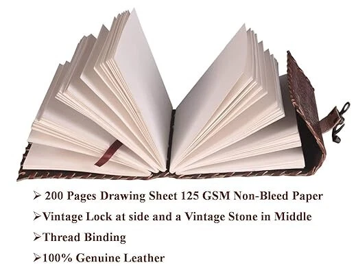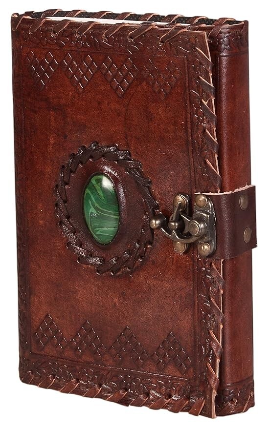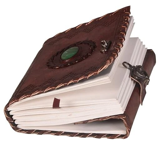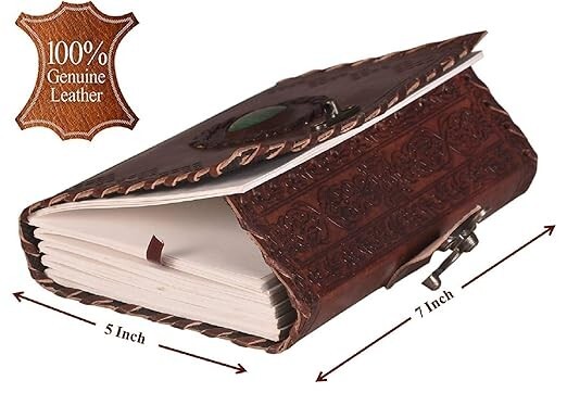 CAVALO - Be Unique Leather Diary with Antique Green Stone Handmade Leather Bound Diary for Men and Women Unlined 5×7 inches Size 200 Pages Travel Diary with Antique Lock Best Choice of Gift for any occasion. (Green Stone) About this item Brand CAVALO - Be Unique Colour Grey(Brown) Theme Plain Sheet Size 4*8 Inches Pages 200 Pages About this item Beautiful & Aesthetic: Handmade leather journal - use it as scrapbook or sketch book to draw, stick travel photos to make collage, practice Calligraphy using fountain pen, paint your dream using a paint brush and do not worry as we use no-bleed through thick craft pages. Best hand-crafted gift for an Art lover. Carry in style and get compliments wherever you may go, Compliments Guaranteed Write Travel Stories: Save the beautiful moments shared with your loved ones travelling around your favorite places & experience the Nostalgia when you read them later in time. This daily diary can be an easy conversation starter in your new college or university. It is compact sized so you can write wherever you are and can easily fit into a purse or backpack, can carry to your next vacation trip. Used by Writers & deep thinkers: Save your creative ideas whenever you need, draw symbols or use shorthand for speed writing or just use it in Bullet Journals to plan and organize on a daily basis. Make your daily to-do’s, monthly shopping list, quick notes, your BuJo is customized to your life Add Creativity: Use different color pens, pencil, wax color, fountain pen, watercolor, roller gel pen, highlighter. We use no-bleeding unlined smooth cotton craft environment friendly paper, with a vintage look which can be used by scribblers, amateur poets, writers & professional artists. Write your very own homebrew recipes This cute & vintage aesthetic notebook/journal/diary/stationary or aesthetic journal is a unique gift to your best friend, man, women, girl, boy, boss as birthday gift, anniversary gift, women’s day, father’s day gift. It can be present as slam book for memories, autograph book, personal diary, popit diary secret diary, small and mini antique diary to your mother, father, brother, sister or lover. it feels like harry potter gift. Best choice of gift on any occasion. Free Shipping....**local custom duty or taxes (if any) will bare by customer only. if buyer declined to pay there will be no return, no refund and no cancellation of order. Feel free to ask about the items.