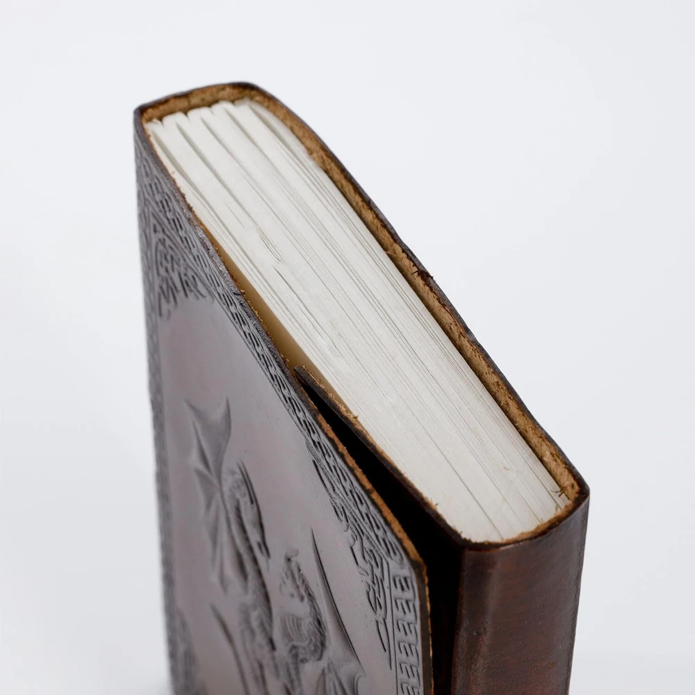 Handmade Leather Double Dragon Journal | Writing Notebook Diary | Bound Daily Notepad for Men & Women Unlined Paper Medium, Writing pad for Artist, Sketch Description Features: HANDCRAFTED FROM TOP GRAIN BUFFALO LEATHER: Each of our journals is handmade by skilled artisans using PREMIUM WATER BUFFALO LEATHER AND RECYCLED COTTON PAPER and features a BEAUTIFULLY CRAFTED DESIGN of Dragon leather cover, Which Makes it perfect for use as a LEATHER NOTEBOOK, SKETCHBOOK, NOTEPAD, DIARY and JOURNAL. PREMIUM MATERIALS, GREAT SIZE: Unlike an average journal that may be filled with low-quality paper that degrades the writing experience. Our Leather journals are made with Premium MATERIALS, Like Top Grain Water Buffalo Leather and PREMIUM 125 gsm EARTH-FRIENDLY PAPER that is perfect to write on. NO BLEED-THROUGH PAGES: BALL PEN AND SLOW FOUNTAIN PEN FRIENDLY. The journal measures 8 inches in height x 6 inches width x 1.5-inch Thickness TELL YOUR STORY: We designed this classic leather journal for men and women as a time capsule for your thoughts. Capture your important memories, accomplishments, life-changing moments and evolving dreams as a keepsake to reflect upon in years to come. PERFECT GIFT AND COLOR OPTIONS FOR EVERY INDIVIDUAL: Makes an Awesome Anniversary, Valentine's, Christmas, and Birthday Gift. Great gift for women and men Artists, and travellers. AVAILABLE IN 2 colours and 2 sizes. OUR 1-YEAR REPLACEMENT WARRANTY: Your purchase is risk-free if by any chance your handmade journal arrives damaged or you find any faults with the craftsmanship, Kindly let us know directly and we will send you a free replacement or a full refund within a year of purchase Product Details: Brand: Komal's Passion Leather Color: Brown Theme: Book Sheet Size: Medium Pages: 200 Pages Cover Material: Leather Style: Classic Ruling Type: Plain Special Feature: Leather Product Dimensions: 8"L x 6"W x 1.5"Th Brand: Komal's Passion Leather Item Weight: 1.19 pounds Product Dimensions: 8 x 6 x 1.5 inches Color: Brown Cover Material: Leather Material Type: leather Number of Items: 1 Size: 8 x 6 Ruling: Plain Sheet Size: Medium Manufacturer Part Number: S Date First Available: November 28, 2020 Handling We will ship all orders within 3 business day of payment. Delivery We Do Not Ship Outside of the Continental US. Return Policy All items qualify for returns within 30 days of receipt. Buyer is responsible for return shipping on any item that is not damaged. Feedback We take our reputation seriously, we buy and sell online, so we understand the value of trust. If you are unsatisfied with your order, please contact us and we will work with you to resolve it to your satisfaction.