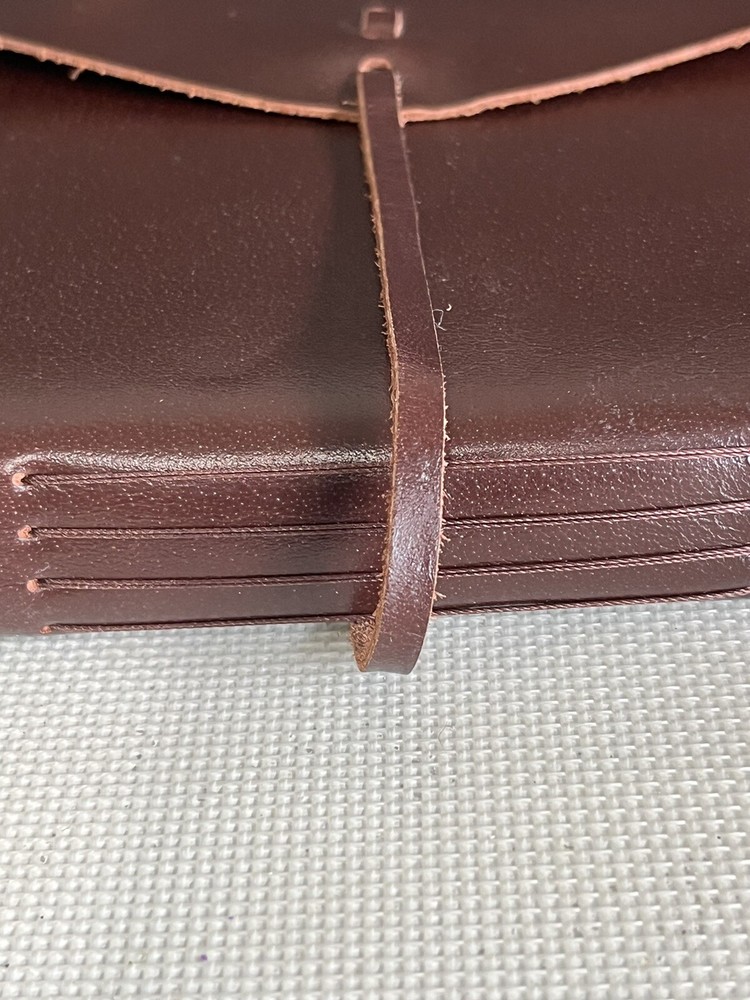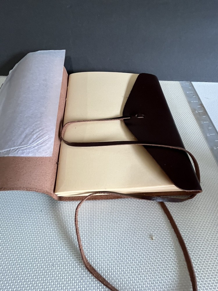 This handmade leather journal is the perfect companion for any creative mind. With unlined paper pages, it allows for complete artistic freedom. Measuring 6" x 8", it is the perfect size for jotting down ideas or sketching out designs. The luxurious edition features a cover made of high-quality leather and is crafted in India. It also boasts special attributes, including its unique handmade design. The journal is not personalized and is not signed. Whether for personal use or as a gift, this journal is sure to please.New unused some scuffs on the outside.please view photos