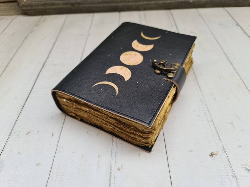 Beautifully adorned with the powerful symbolism of the moon phases. Handcrafted with love and care, this journal is a sacred space for witches, spiritual seekers, and anyone attuned to the lunar energies of the universe Triple moon Goddess color printed journal • Triple moon print • C-Lock brass • Genuine buffalo leather • Vintage look deckle edge old paper ↪ Size - 7x5 Inches, 8x6 Inches, 10x7 Inches • Soft Luxurious Durable and Supple Rustic Leather Bound Cover which ages with time. • Thick Antique Vintage Cotton Paper which looks like thousand years old. • Sturdy Leather Binding Technique will make sure that the pages never fall off. Moon Phases Print Blank Spell Book, Book of Shadows, Vintage Leather Journal Gift for Him & Her