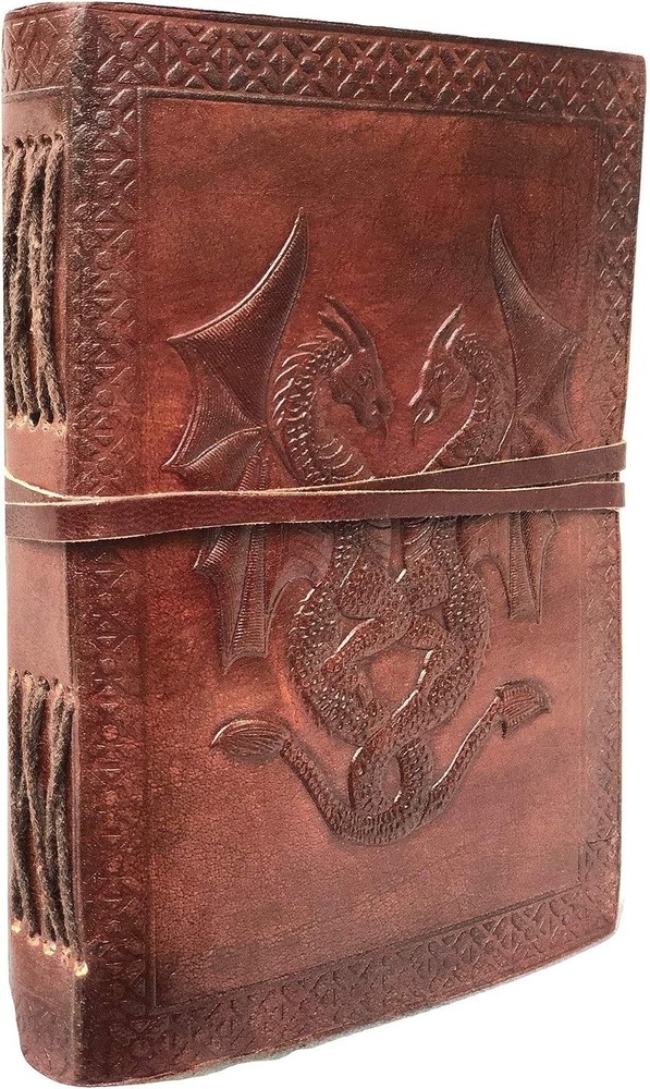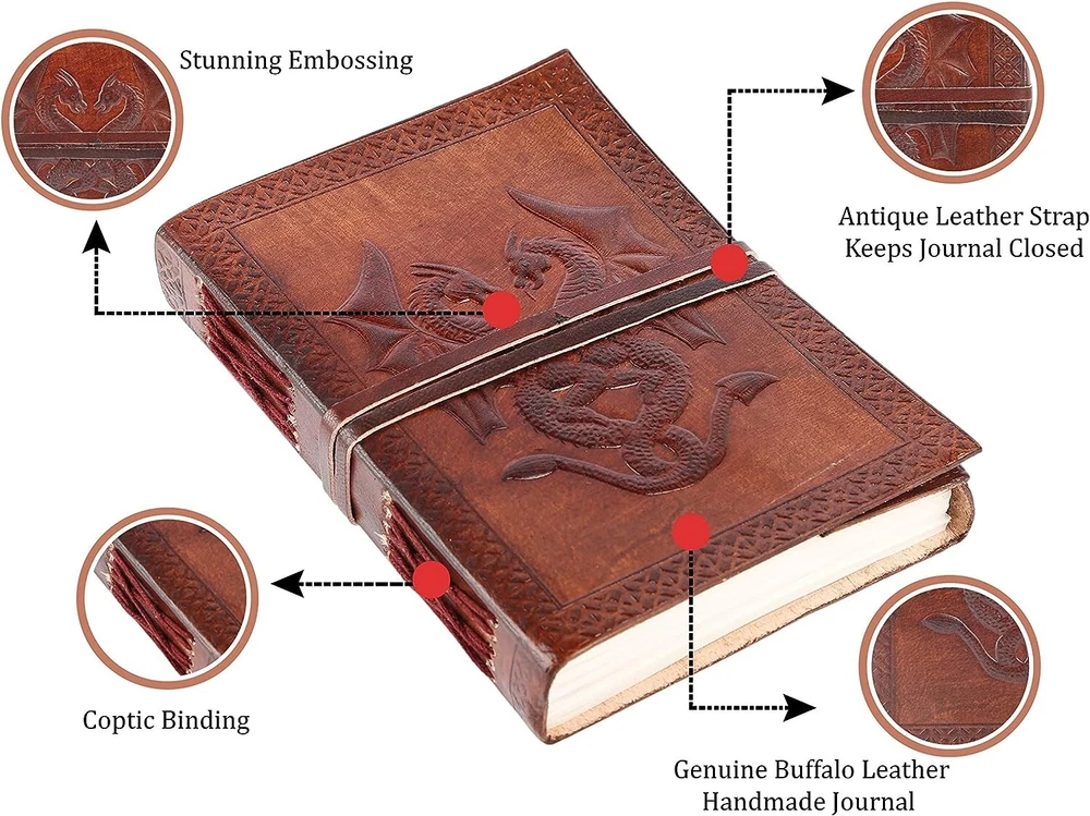 About the Genuine Leather Double Dragon Diary Genuine Durable Leather Soft & Supple Dark Brown Genuine Leather with a real leather scent. Naturally tanned with special oil, a special keepsake for your thoughts, plans & ideas. Perfect size for many uses Easy for handwriting, drawing or sketching and compact enough for carrying in your bag. Ideal for alternative Artists, Travelling, Business, Teen Journals, Poetry Work, Journalists, Food Planner, Scrapbook etc. Unique Gift Idea Perfect gift Idea for all occasion like Christmas, New Year, Black Friday, Cyber Monday, Thanksgiving day, Mothers Day, Fathers Day, Teachers Day or other special events. Major Features Made up of genuine high-quality leather Dimensions in Inches: 7(Height), 5(Width), 1.5(Thickness) Vintage & Antique Appearance Perfect size for many uses Each and Every product goes through a 3-step quality check process before dispatching. "Carry sophistication with every step - embrace the elegance of the Vintage Diary"