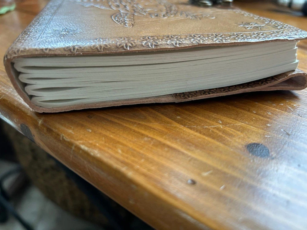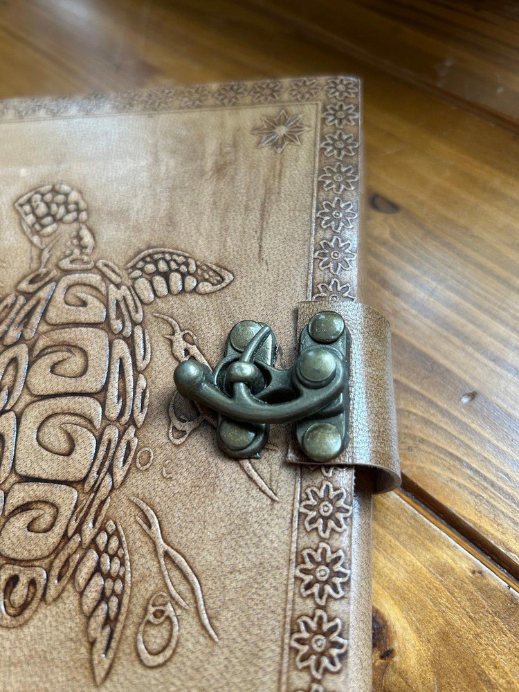 5x7” turtle embossed leather bound journal only missing 2 pages at the front (shown in last picture) otherwise beautiful condition.