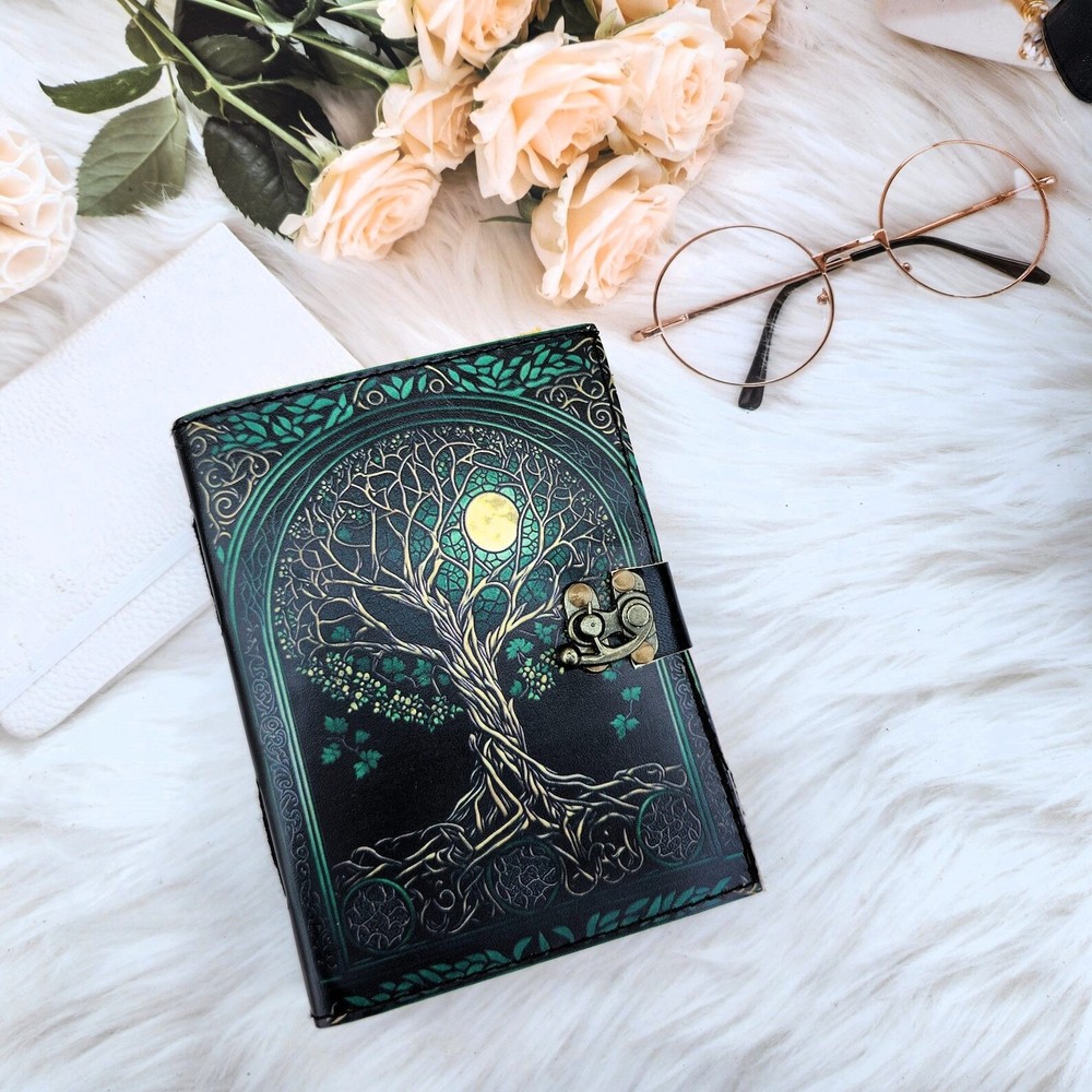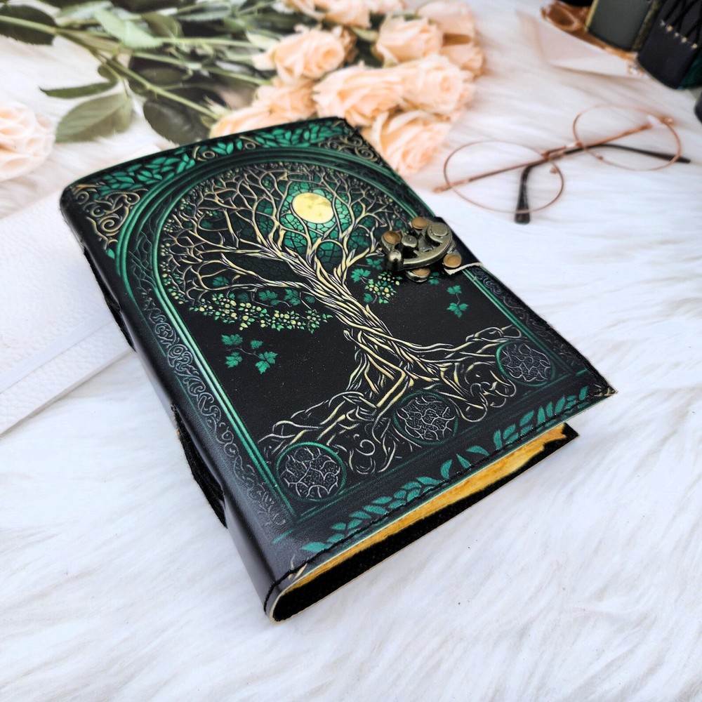 Large Grimoire leather journal, Print tree of life Journal, Blank spell book book of shadows Leather Celestial Gifts For Him Her • Print - tree of life • Vintage lock closure • Genuine buffalo leather • Vintage deckle edge old paper • handmade rustic cotton paper • Size - 7x5 inches 8x6 inches 10x7 inches ● Artist Sketchbooks, Photo Album, Traveling Notes, Business Executive, Logbook, Poetry Work, Journalists, Food Planner, Instagram Scrapbook and Bible Journaling. ● Sketch, Doodle, Write on your Leather Blank Spell Journal with a Calligraphy Pen Fountain Pen, Brush Pen, Ball Pen, Acrylic Colors, Watercolor and many more. We guarantee no bleed through. ● The vintage clasp lock will keep all your valuable writing locked inside. Sturdy hand stitched binding to make sure that no paper comes out loose from your spell notebook. Leather notebook, leather journal, leather grimoire, book of shadows, gift for him, gift for her, gift for boyfriend, gift for girlfriend, gift for mother, wiccan, pagan, recipe notebook, travel notebook, wedding guest book.