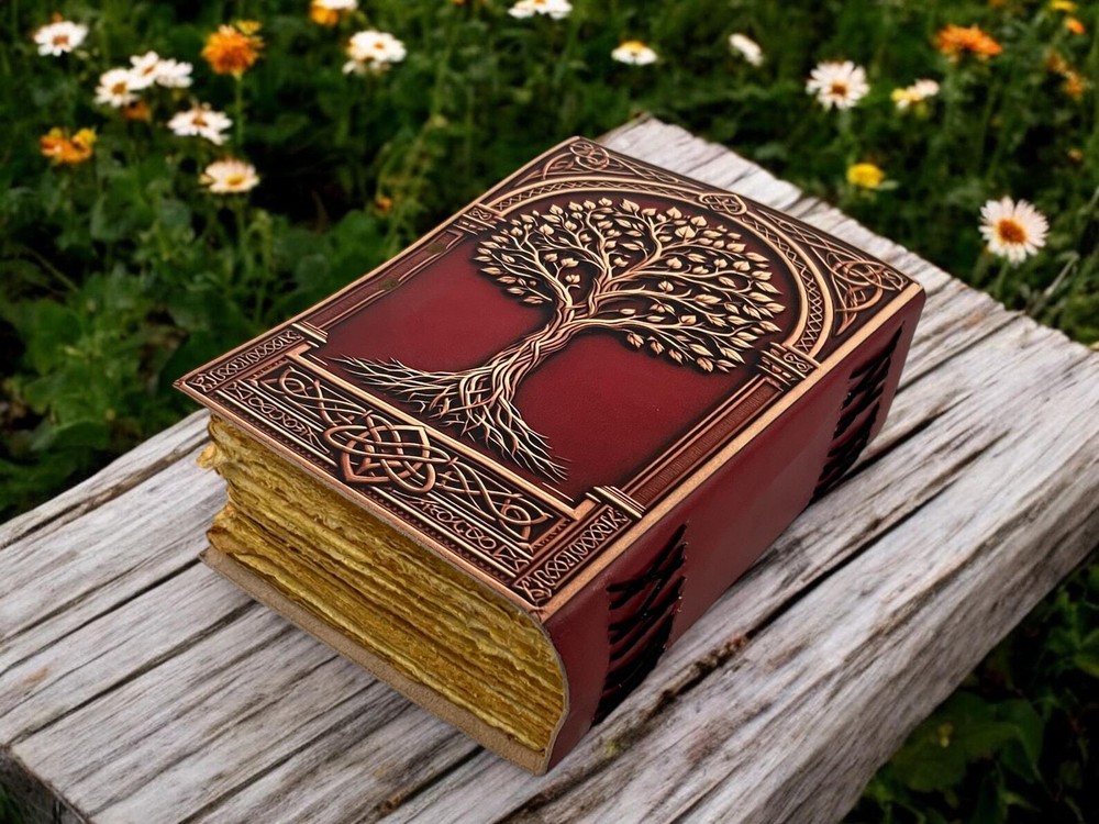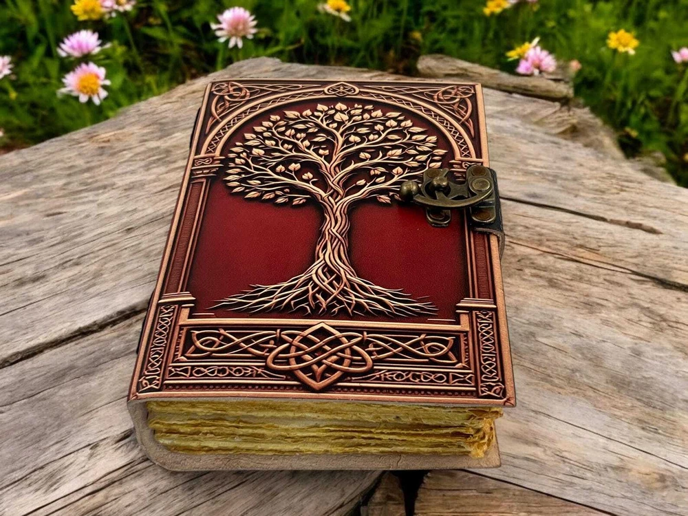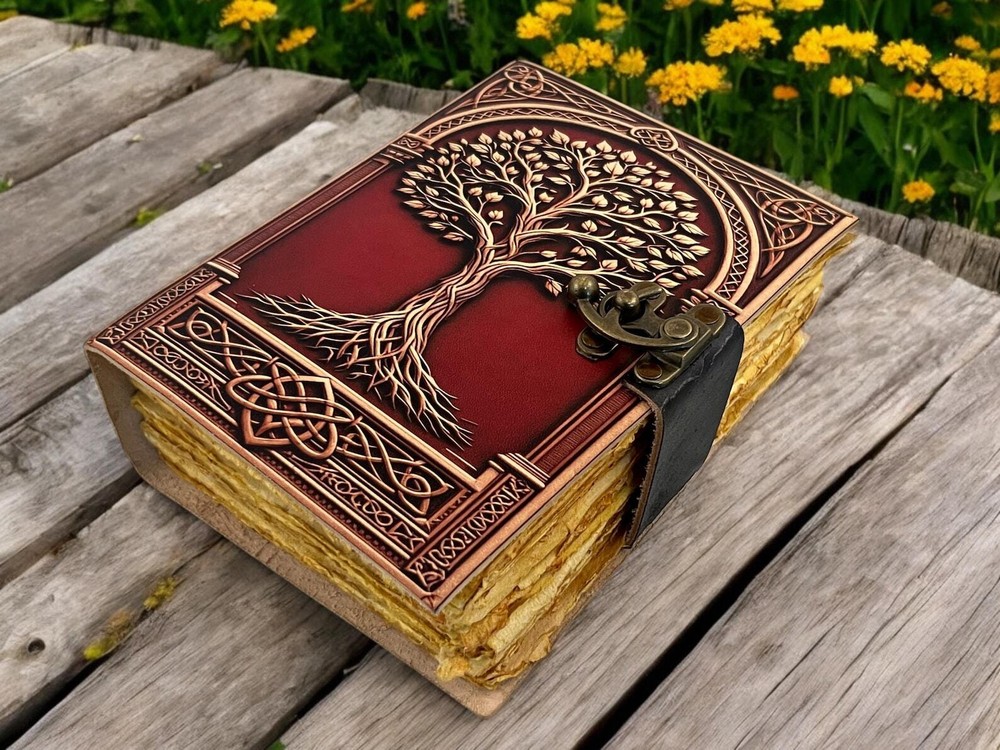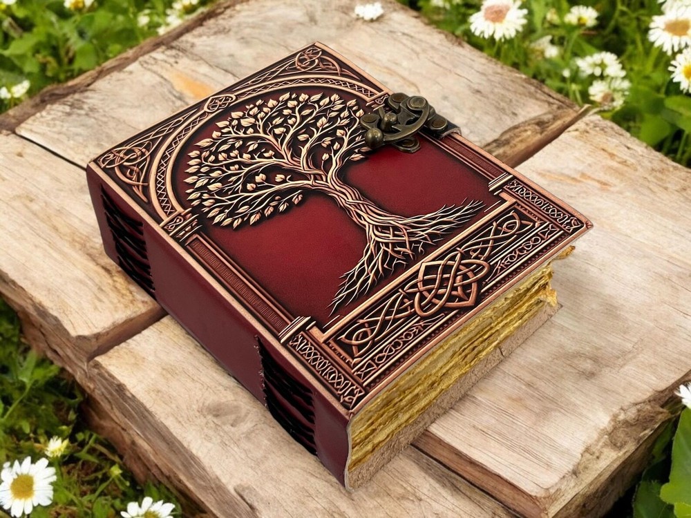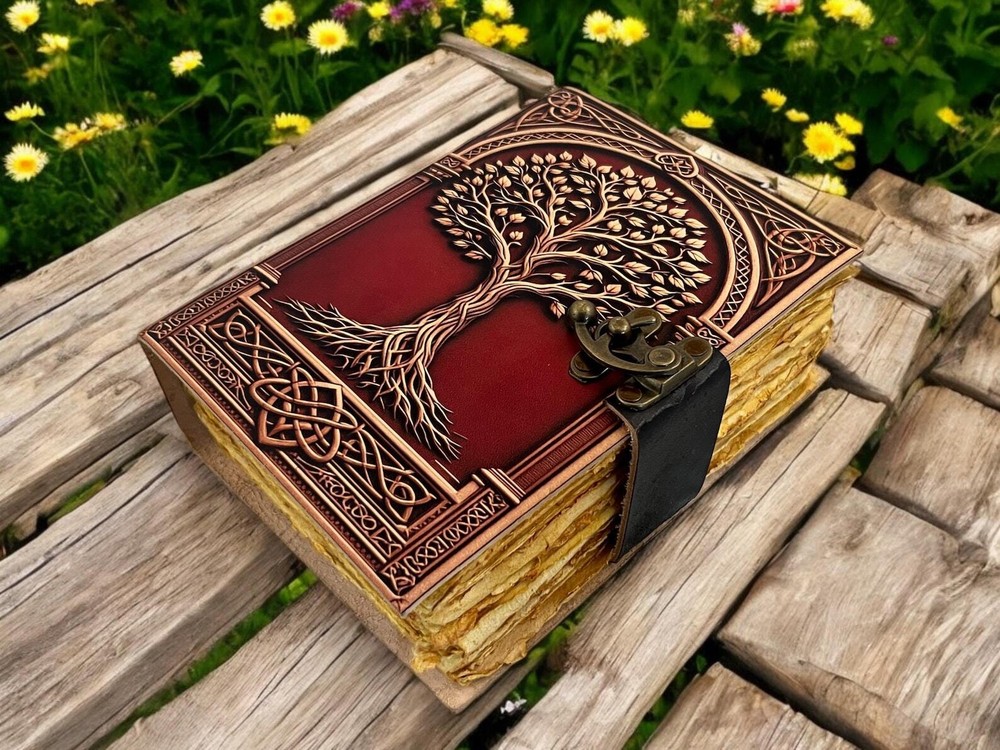 • Print - Tree of life • Vintage lock closure • Genuine leather • Vintage deckle edge old paper > Size- 7x5 Inches, 8x6 Inches, 10x7 Inches ● You will fall in love with the the antique handmade cotton paper which is unique to our Vintage Journal Notebook. ● The vintage clasp lock will keep all your valuable writing locked inside. Study hand stitched binding to make sure that no paper comes out loose from your spell notebook. ● Artist Sketchbooks, Photo Album, Traveling Notes, Business Executive, Logbook, Poetry Work, Journalists, Food Planner, Instagram Scrapbook and Bible Journaling. Leather notebook, leather journal, leather grimoire, book of shadows, gift for him, gift for her, gift for boyfriend, gift for girlfriend, gift for mother, wiccan, pagan, recipe notebook, travel notebook, wedding guest book.