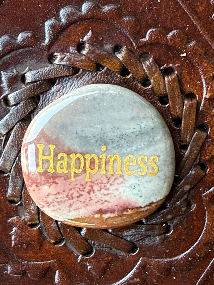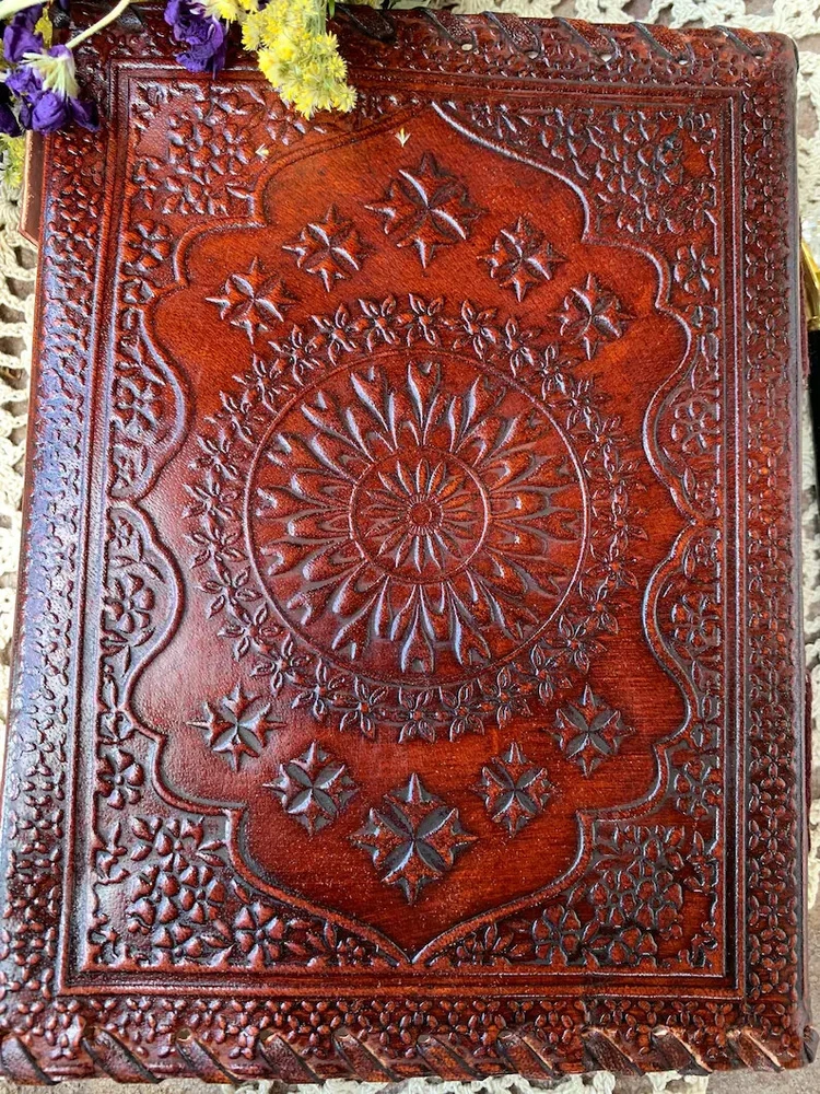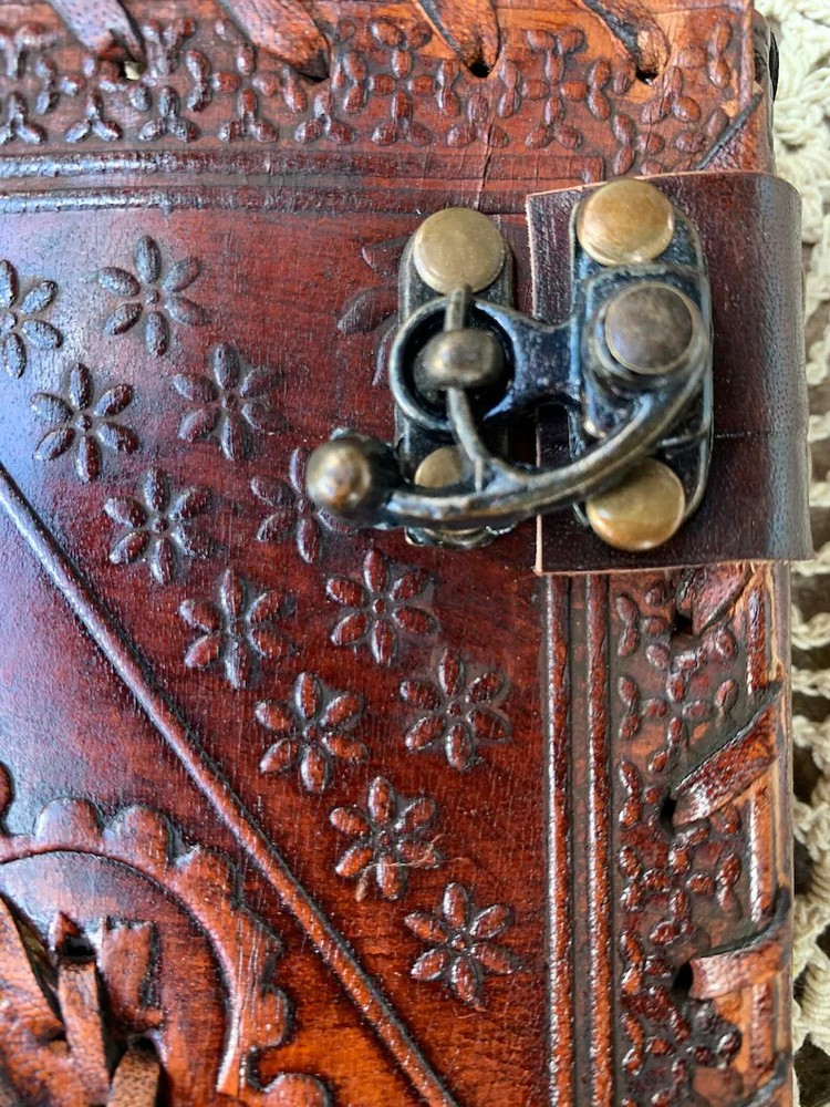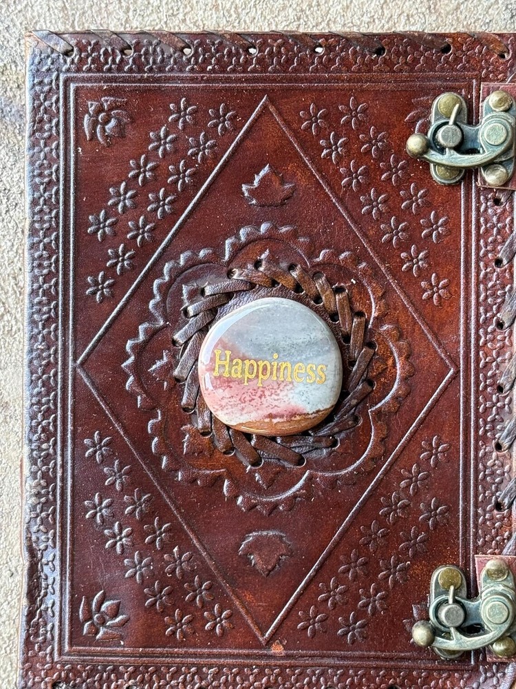 One of a Kind Handcrafted leather journal with Happiness stone inlay. Authentic Agate Healing Palm Stone This leather-covered notebook is perfect for bullet journaling, keeping a diary, scrapbooking, sketching, and travel journaling. This is a great gift option for both men and women. Contains 180 pages of handmade paper. A massive tone with 2 brass latches to keep it closed 2" Genuine Etched Happiness stone in the center of a mandala Embossing front and on the rear cover may vary. Handmade Leather ( Genuine) Notebook The Diary is the perfect companion for writers, thinkers, entrepreneurs who want to put their thoughts on paper easily. The Diary notebook is a thing of beauty that will be proud to carry and show to friends. Use it as a personal journal, diary, planner or notebook. Embossed handmade 6 x 8.5 (made with cotton) paper Each journal is handcrafted. Stones may vary slightly from photo *Pen and floral in pictures not included