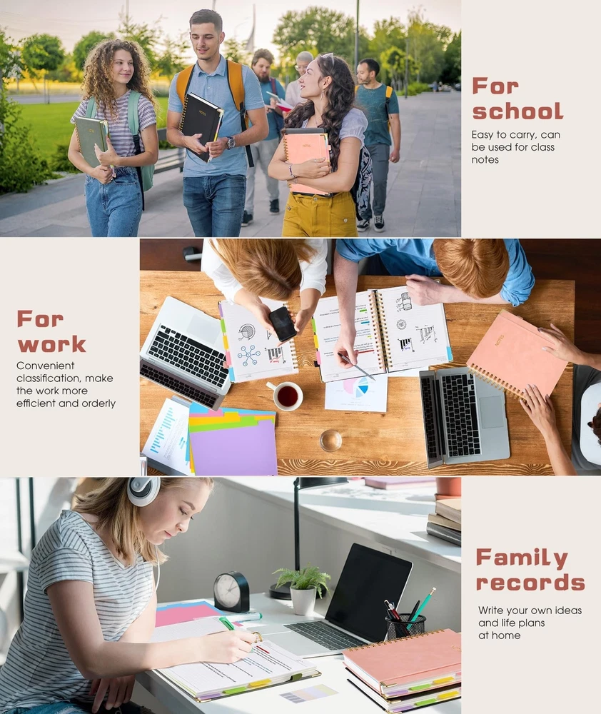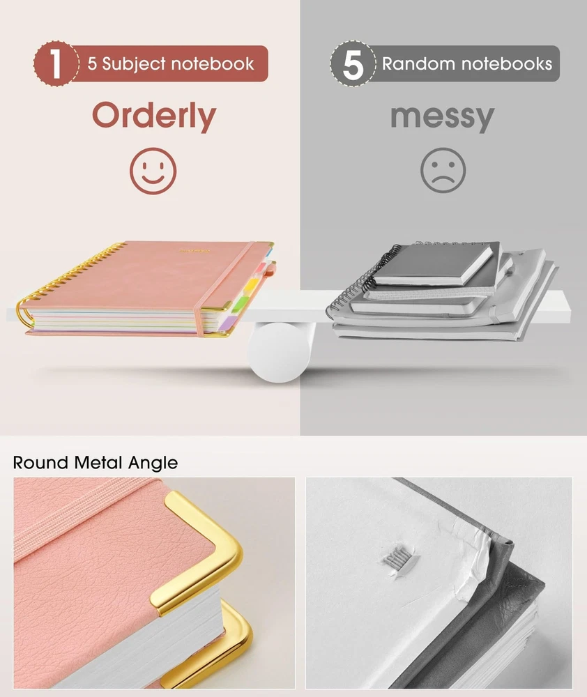 Hardcover Spiral Notebook Journal with Removable Dividers Tabs, 300 Pages Leather 5 Subject Notebook College Ruled, 8"x10" Large B5 Notebooks for Work School Note taking, Lined Journal for Women, Pink Product Details Color: Pink Size: 8"x10" Brand: dilitego MPN: Ztbjb-Fen UPC: Does not apply EAN: Does not apply Brand: dilitego Color: Pink Theme: Book Sheet Size: B5 Pages: 300 Pages Cover Material: Leather Style: Classic Ruling Type: Ruled Special Feature: Pen Holder Number of Items: 1 Manufacturer: dilitego Brand: dilitego Item Weight: 2.14 pounds Product Dimensions: 10 x 8 x 1.4 inches Item model number: Ztbjb-Fen Color: Pink Cover Material: Leather Number of Items: 1 Size: 8"x10" Ruling: Ruled Sheet Size: B5 Manufacturer Part Number: Ztbjb-Fen Date First Available: May 14, 2024 Leather Hardcover Spiral NotebookPremium leather combine cardboard constituted a sturdy waterproof cover, prevent coffeewater from wetting the inner pages and against the notebook tabs /pages from bending, while 4 golden metal-corners and thick twin- spiral binding, further protect your important meeting records or work school note well. A kind side pen loop design, which reduce the frequency that losing pens. 5 Adjustable Dividers with 8 TabsOur 5 subject notebook include 5 removable plastic dividers, flexible and durable so you can move and organize them as your wish. It can be divided into 5 sections in total, which had enough features to keep organized on different subjects, instead of piles of random spiral notebooks that will slimmed your backpack down a ton! Come with 8 self-adhesive labels that separate information and make it easy to find categories to help organize your notes effectively. 300 Pages Thick NotebookLarge B5 size notebook 8"x10" with 300 pages /150 sheet for long-term storage will reduce the amount of notebooks you buy! Acid-free light Ivory paper that protect your eyes. High-quality 100GSM thick page create smoother writing process and prevent ink bleeding through or ghosting. 7.1mm college ruled spiral notebook and the top of each page are sections forWeather,Week,Memo No and Date to meet your daily note writing needs. Easy Writing at 180Lay FlatThick twin-spiral binding less likely to fall apart and easy to turn the pages to ensures that the notebook lays flat when open,making writing a breeze even for left handed writers. Elastic closure band keep your spiral journal secure when closed and can also be used as a bookmark to keep track where you wrote. An expandable back pocket that is great for storing extra notes, cards, or other important items. Hardcover Notebooks for Work SchoolThis spiral 5 subject notebooks is an excellent choice for students, professionals, or anyone who like to write things down and needs to keep them organized. A stylish look with gold color stamp font, binding brighten up your dreary desk, also a wonderful gift to work organization, back to school or family records.