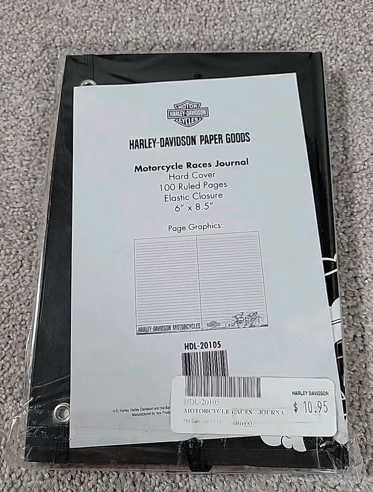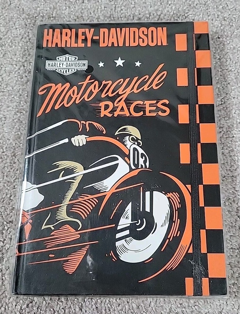 The product is a hardcover journal featuring Harley-Davidson motorcycle races. It has an elastic closure and is identified by the product number HDL-20105. It is likely a collectible item related to Harley-Davidson motorcycles and would appeal to fans and enthusiasts of the brand.
