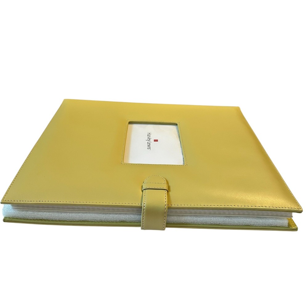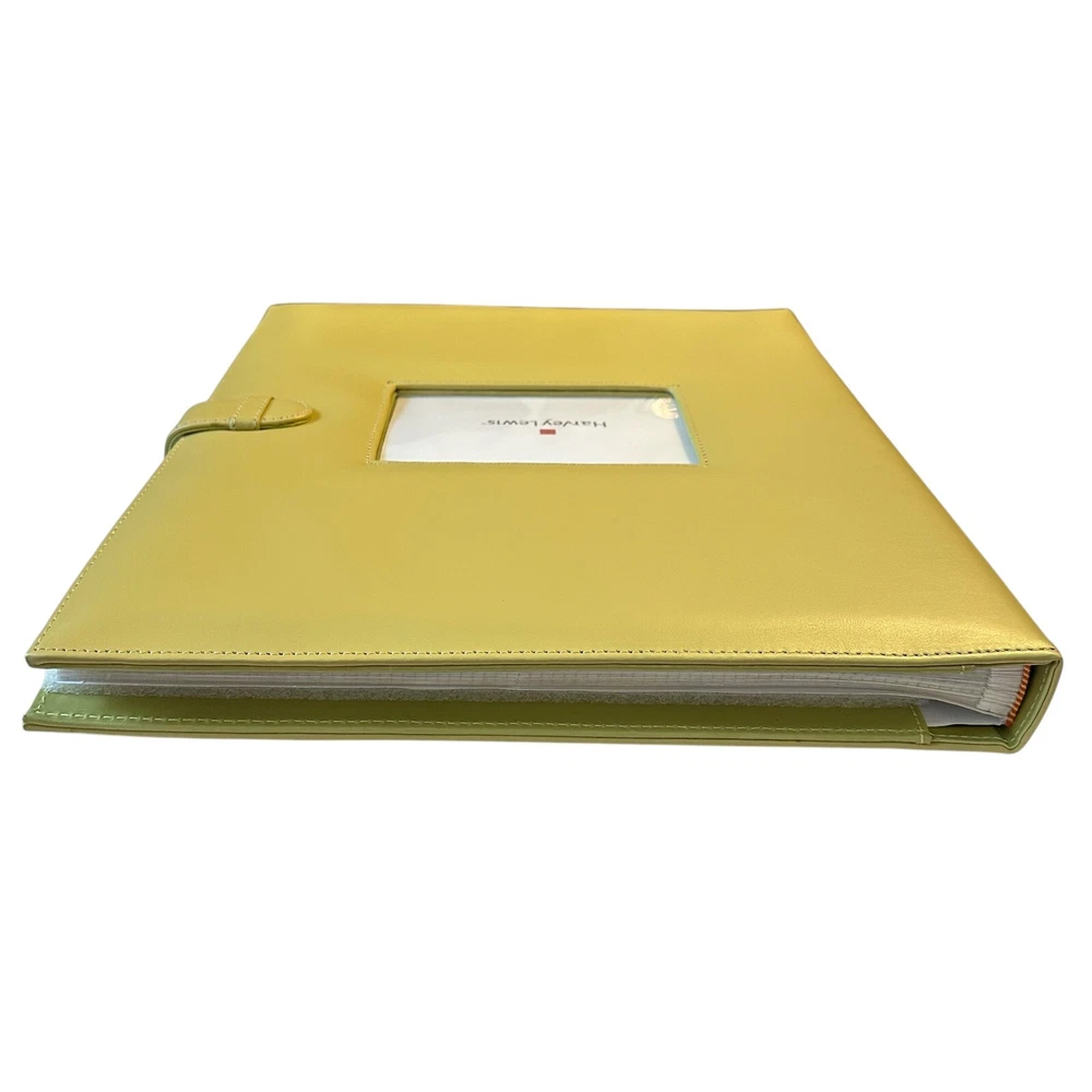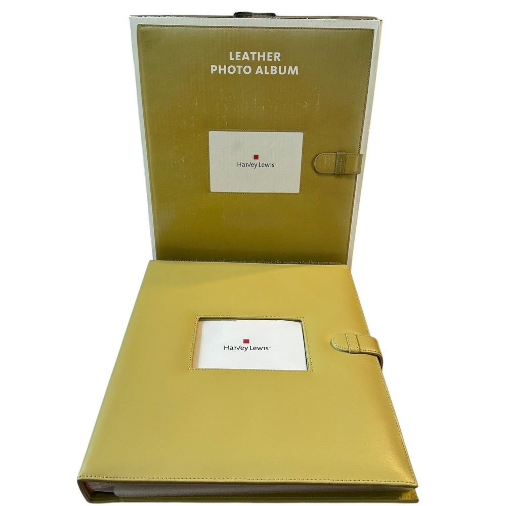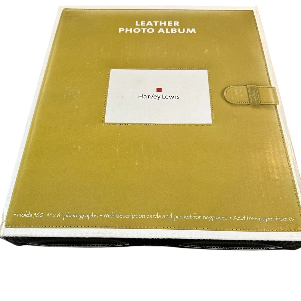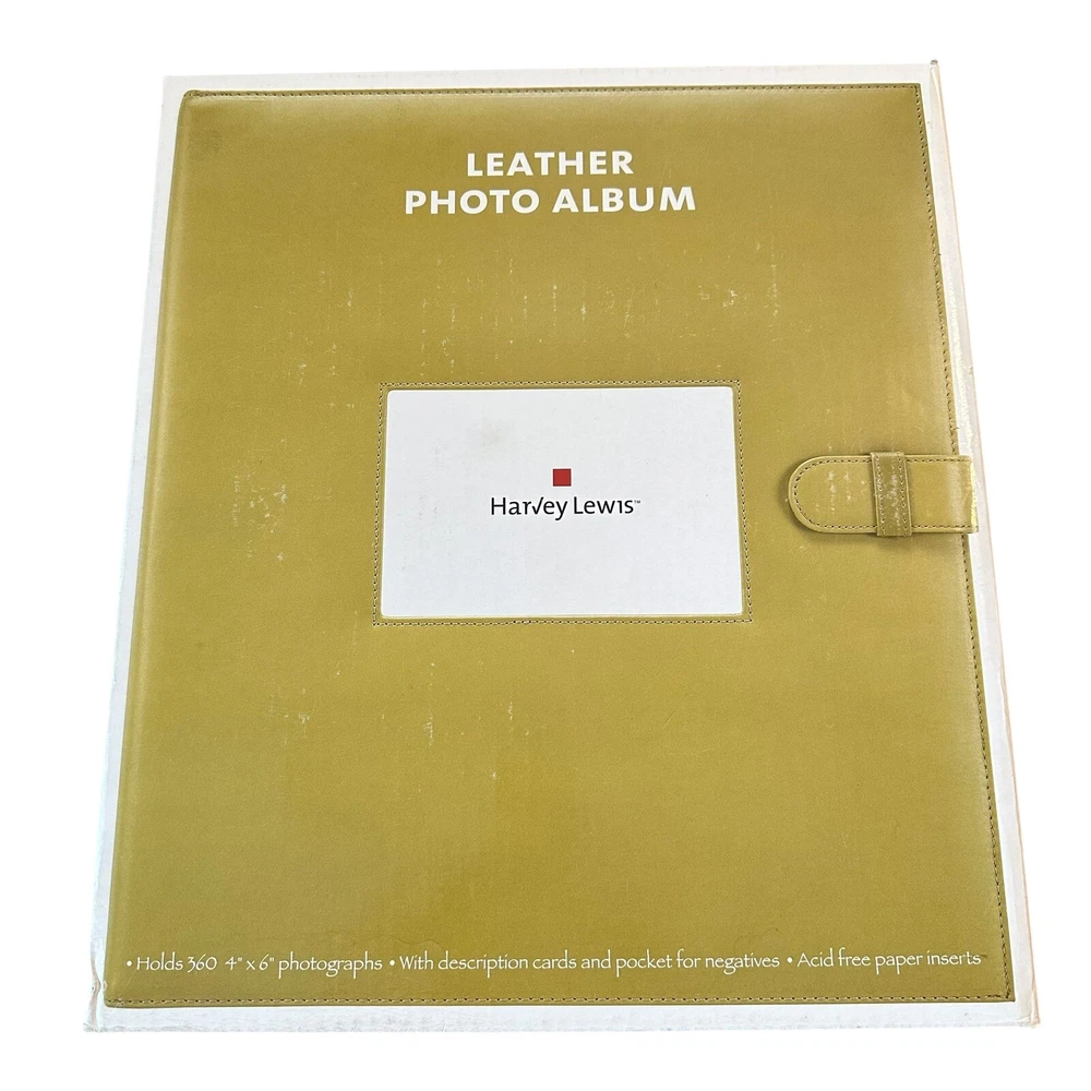 Harvey Lewis Leather Photo Album for 4"x6" Photos. Holds a total of 360 photos. Includes description slips and a pocket for negatives. Album is 15.5" tall and 13.5" wide and is a pea green color. Pre-owned but new and never used in original box. Please see photos to evaluate overall condition. Sold as is.