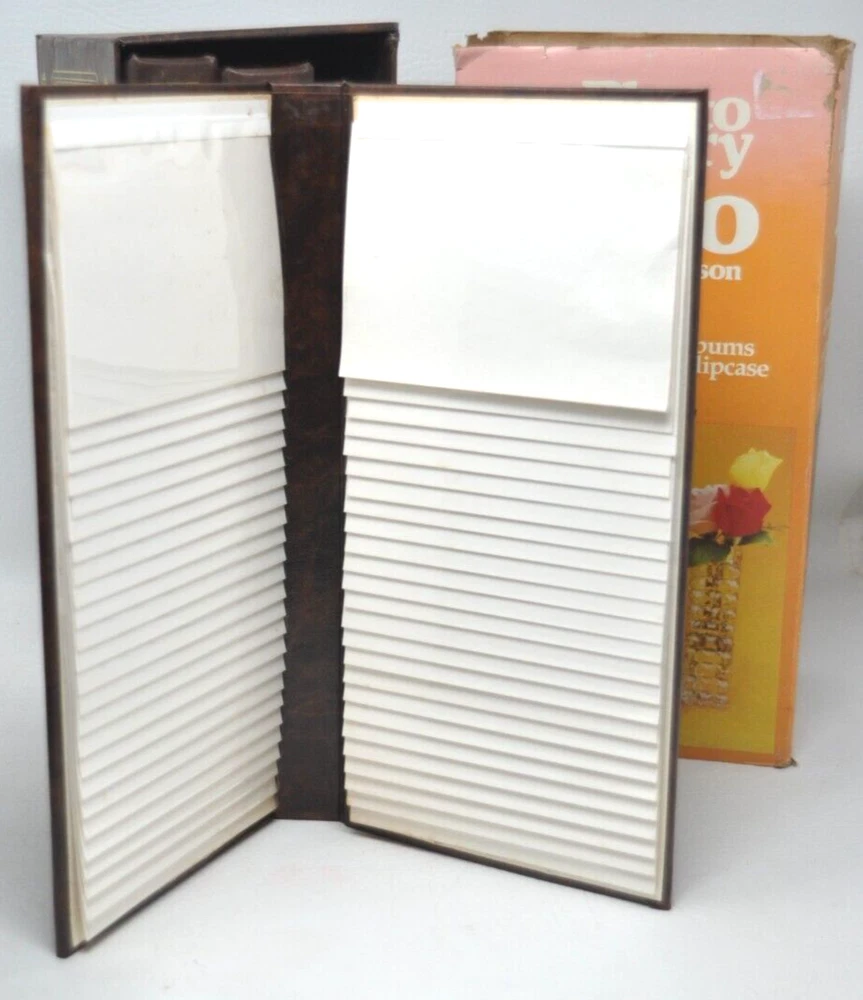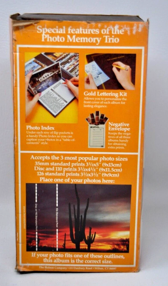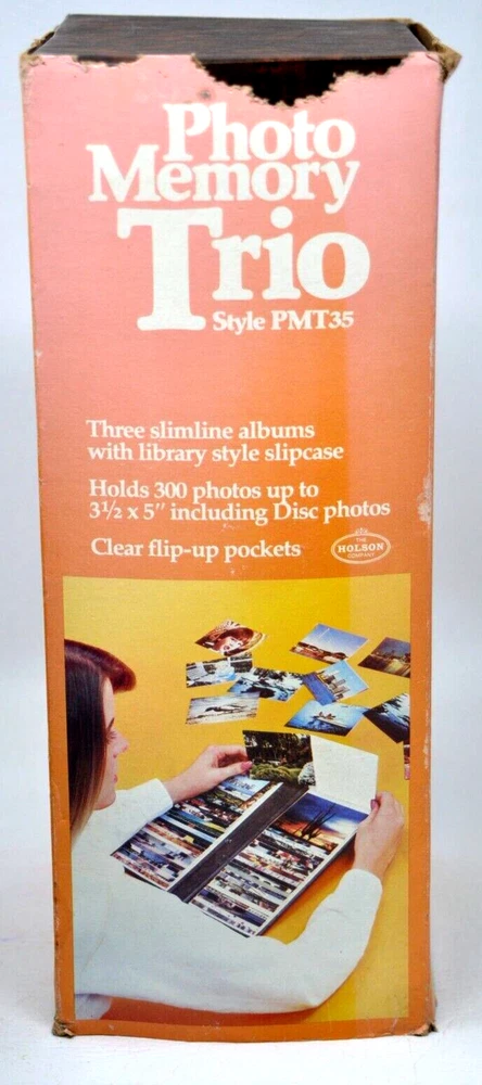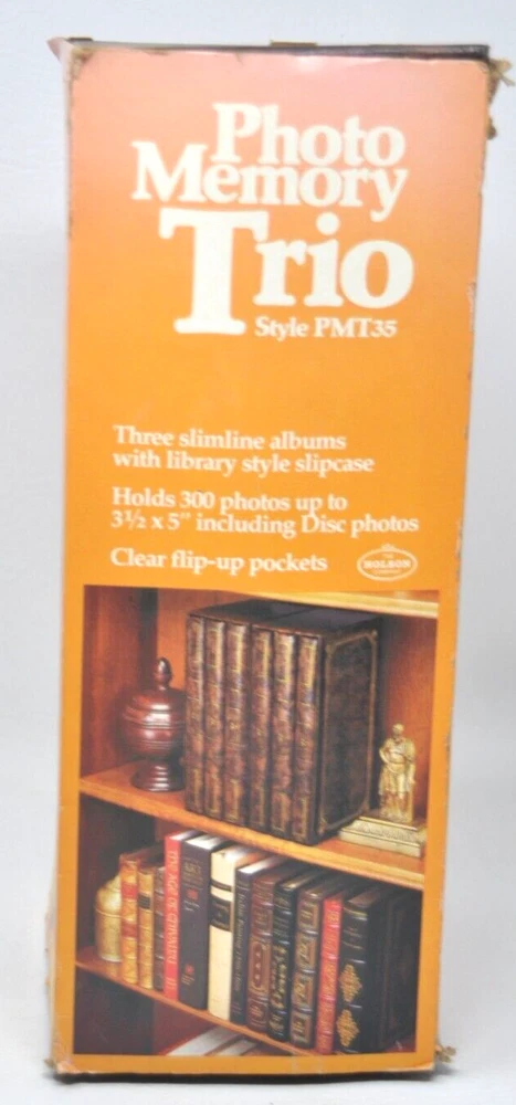 Holson Vintage Photo Memory Trio Slimline ALBUMS with library style slipcase Brown Holds total of 300 Photos (3 albums) Flip-Up Pockets Holds 3.5x5" photos or 3.5x4.5 or 3.5x3.5 Has a Envelope for holding photo Negatives and a set of "rub-on" letters for personalizing the photo album Overall size of product: 12x4.5x5.5