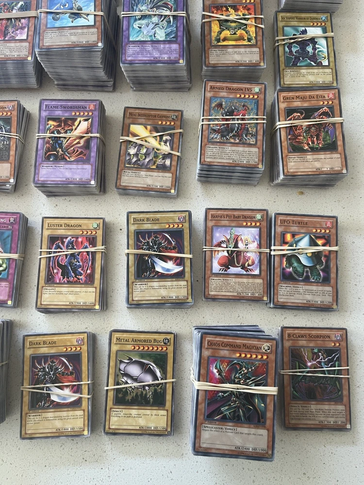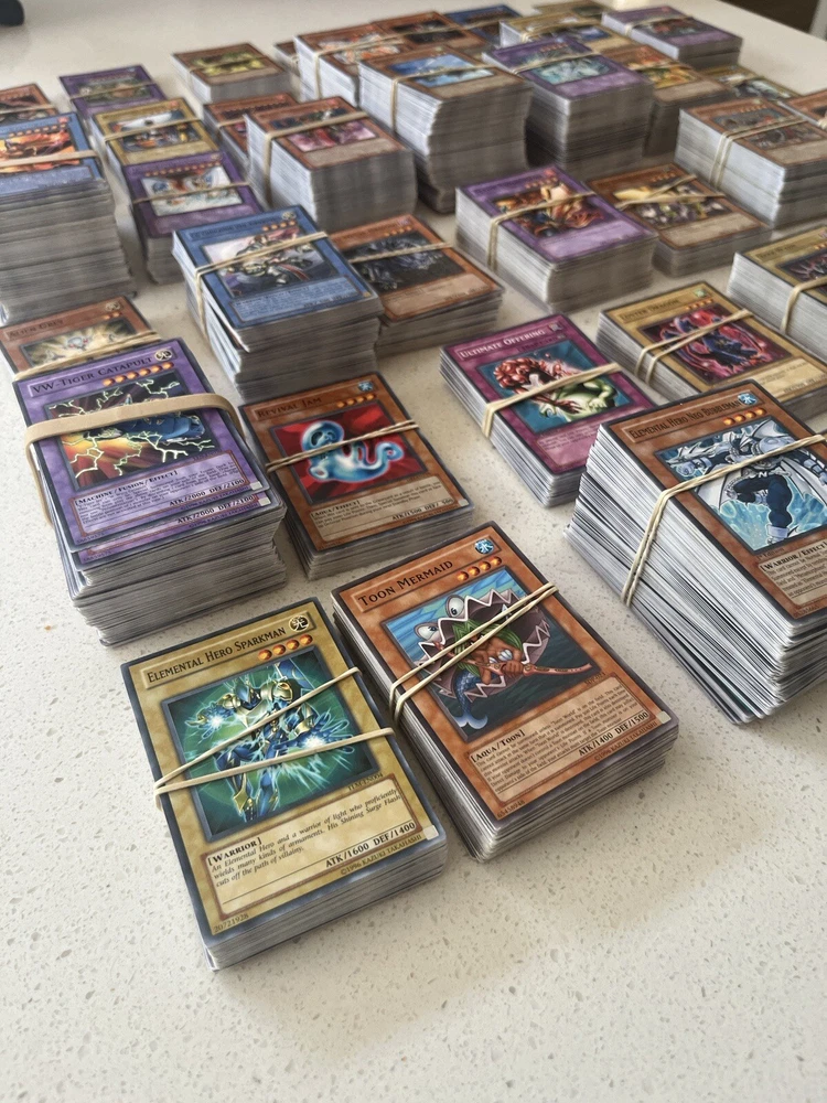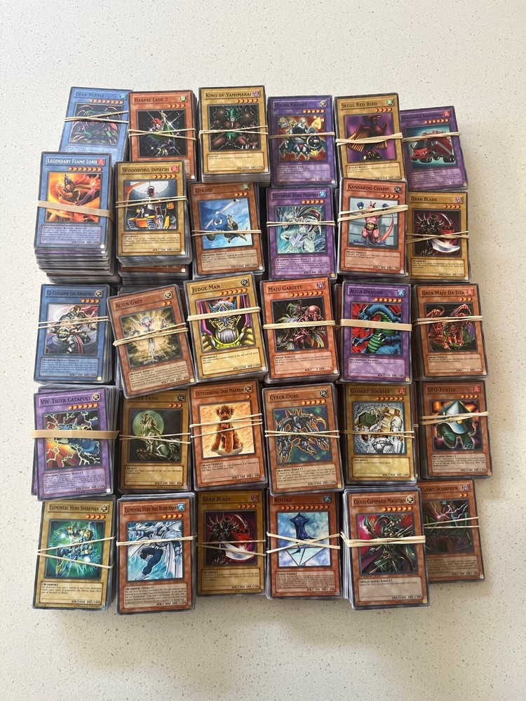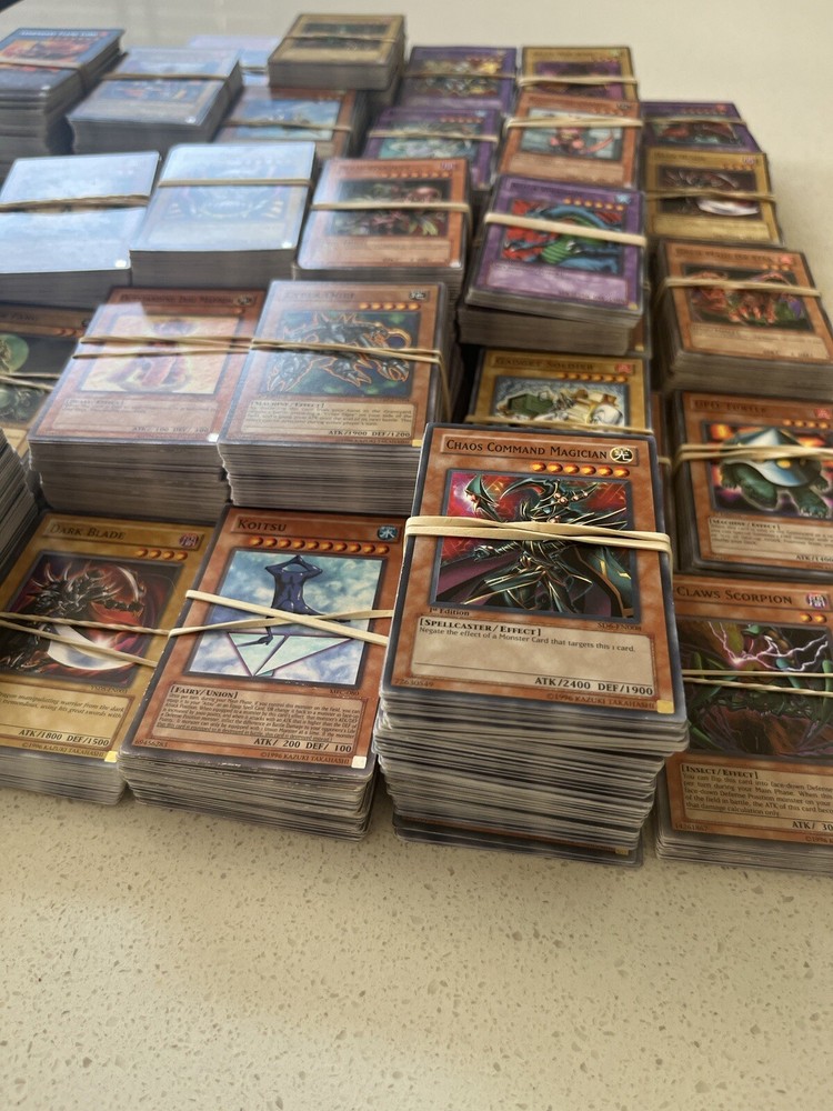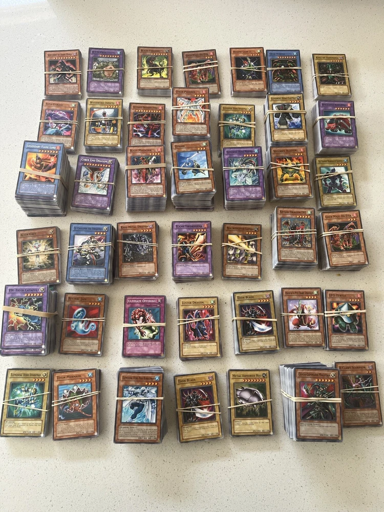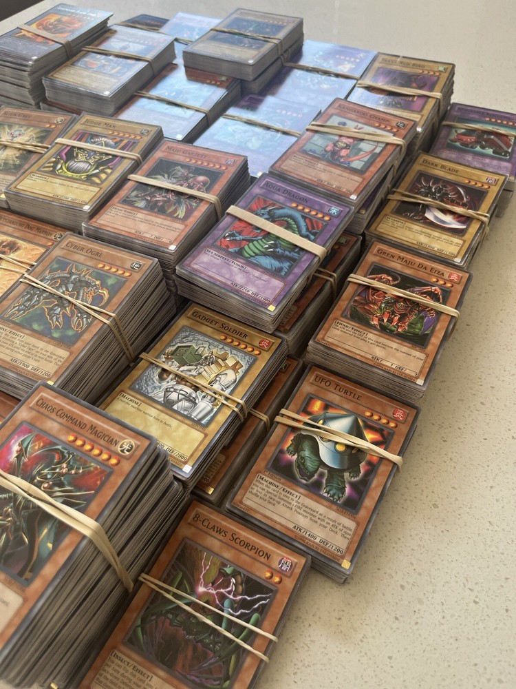 All cards in pictures will be included. All 3000+ cards are vintage and from the early 2000’s. NOTHING MODERN. These cards are from the first sets of TCG Yugioh and have been collected for many years. All cards have been organized by their sets such as LOB, MRD, PSV. All cards are in good condition considering most to be 20+ years old. There are Rares and commons in this collection. Please message me and questions. Will be shipped same day as purchase. Here is the list of cards sets are in this collection. LOB, MRL, MRD, DCR, IOC, LON, PSV, DCR, MFC DR04, SD09, DR1, DR2 DR3, RDS, DB2, DP04, YSD, DP1, POTD, SD6, CRV, EOJ, FOTB, SD4, POTD, STON, EP1, SDJ, SD7, DP2, EEN, DB1, SD10, SD1, SD5, SD8, SD3, TLM, SDP, SOI, YSDS, AST, SD6, PGD, SD2, SDK, SRL, SOD, DP03, MDP2, CDIP, SDY, SDRL, TAEV, SYE, FET, DR1, SKE, DP05