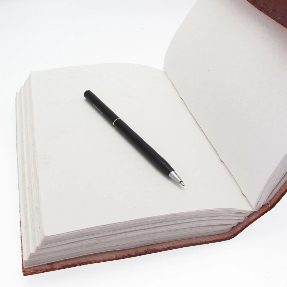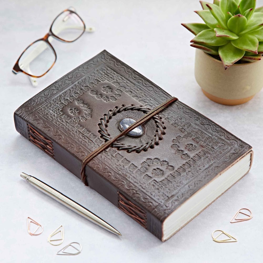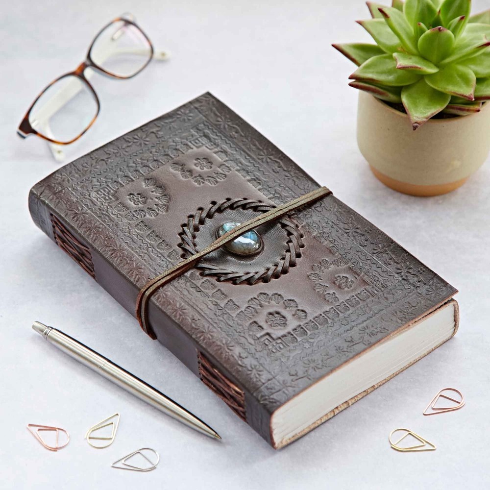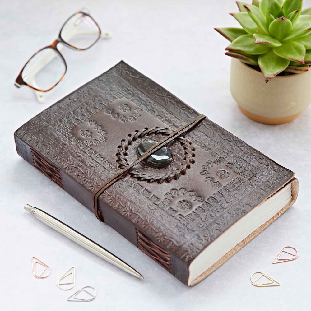 Product Description: Features: * Material: Leather, Recycled Paper & a Semi-precious Stone. * Size: approx. 21.5 × 13.5 cm * Pages of handmade khadda paper, made from recycled cotton. * Fair trade and Eco-friendly. * Handmade. * Stone Types: Tiger’s Eye, Lapis, Labradorite and Black Onyx. * Brand New. * A very beautiful gift for yourself or your friends. * Great diary, travel journal and notebook. FAQ: More About Us: We are a Fair Trade company and regularly visit our suppliers to ensure the highest standards are met. We pay our suppliers 50% upfront and send money to them whenever they need it and we never send anything back, even if it’s damaged. To incentivise the staff, we have a bonus system in place, and they can earn up to 5% of our total order value, which can equate to an extra month’s wages per year. Where are your journals made? These handmade, fair trade and eco-friendly leather covered journals are made by a small family business in Rajasthan, India. How many pages does the journal come with and what is it made of? These leather journals have 125 pages of handmade khadda paper, made from recycled cotton (also known as kaddi or khaddi) that has been left over from the massive garment industry in India. They are handmade and don’t contain chemicals as we only use unbleached cotton. The paper is made by a charity in rural Rajasthan that promotes women’s education and their social standing in rural villages. What stone is on the journal? The semi-precious stones that have been stitched onto these leather journals have been handpicked by us for quality and size and may differ from the image shown due to the natural differences in Tiger’s Eye, Lapis, Labradorite and Black Onyx. How are the journals made? The leather has been tanned by our suppliers and the journals have been crafted using a mixture of love, contemporary and traditional skills. The embossing has been expertly created using small individual handmade tools making each journal unique. The pages have been bound by hand, so they are strong and perfect for travelling Due to the nature of these leather journals the embossed pattern might not be the same as on the image. Each item is individual, leather is a natural product and can have slight imperfections, we feel this adds to the individuality and makes each product unique. For embossed items, the exact pattern WILL NOT be the same as the sample image shown but all products been made with the same handmade, Fair Trade love and care. What can I use the journal for? They are perfect to use as a scrapbook or art book, doodle book or diary, and the paper is great for water-colour painting. Anything else I should know? Due to the fact that these products are individual, rustic and handmade, the colour and designs may slightly vary but loveliness comes as standard. PLEASE NOTE: We do not advise using a fountain pen with this type of handmade paper as the inky may spread. When can I expect my delivery? We aim to process and dispatch your delivery on the same day. Please allow up to 3 working days to receive this. We pay our suppliers 50% upfront and send money to them whenever they need it and we never send anything back, even if it’s damaged. To incentivise the staff, we have a bonus system in place, and they can earn up to 5% of our total order value, which can equate to an extra month’s wages per year. These leather journals have 125 pages of handmade khadda paper, made from recycled cotton (also known as kaddi or khaddi) that has been left over from the massive garment industry in India. They are handmade and don’t contain chemicals as we only use unbleached cotton. The paper is made by a charity in rural Rajasthan that promotes women’s education and their social standing in rural villages. The leather has been tanned by our suppliers and the journals have been crafted using a mixture of love,