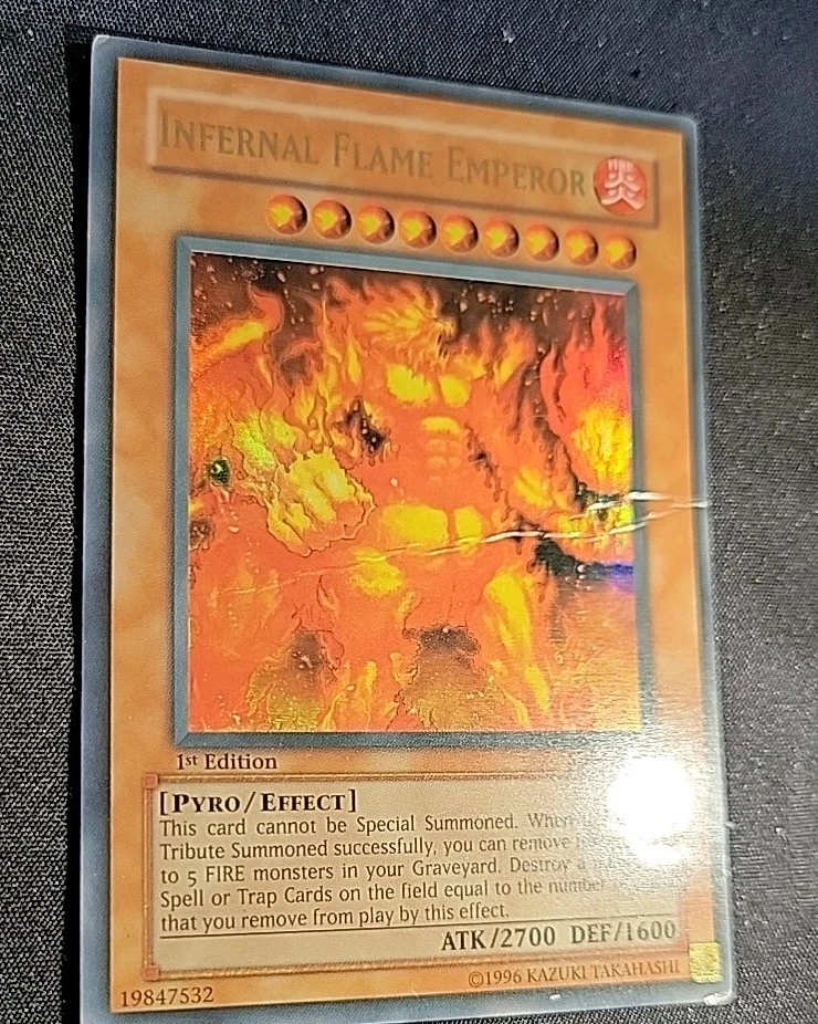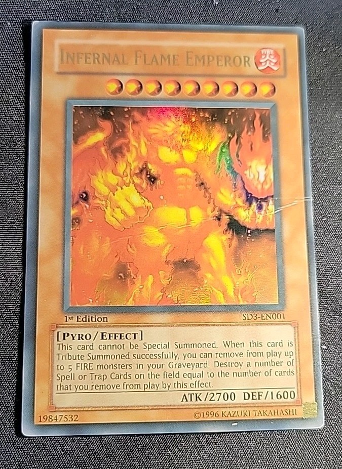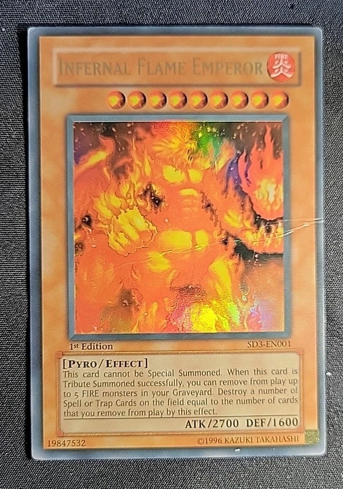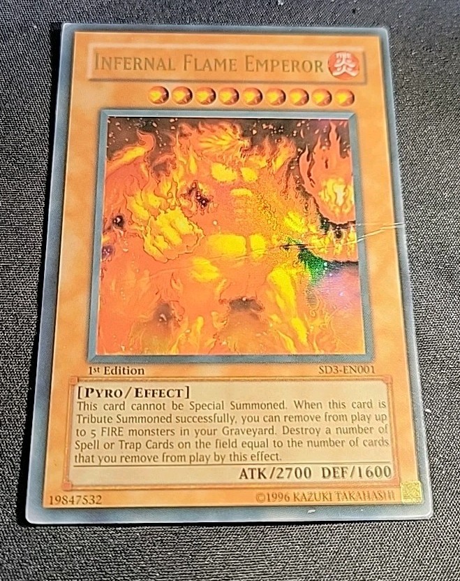 The Infernal Flame Emperor SD3-EN001 Structure Deck: Blaze of Destruction 1st Edition is a highly sought after card in the Yu-Gi-Oh! TCG world. This Ultra Rare Fire-type Pyro monster has an impressive 1600 defense and 2700 attack power, making it a formidable addition to any deck. Manufactured by Konami, this English language card is a must-have for collectors and players looking to enhance their gameplay with a powerful and unique card like the Infernal Flame Emperor.